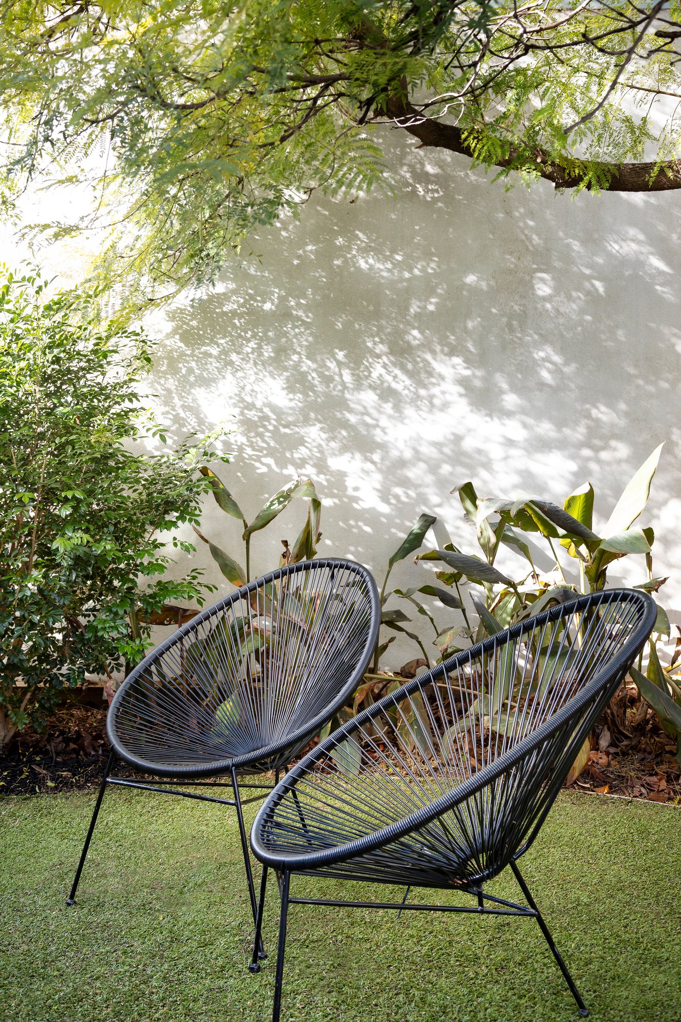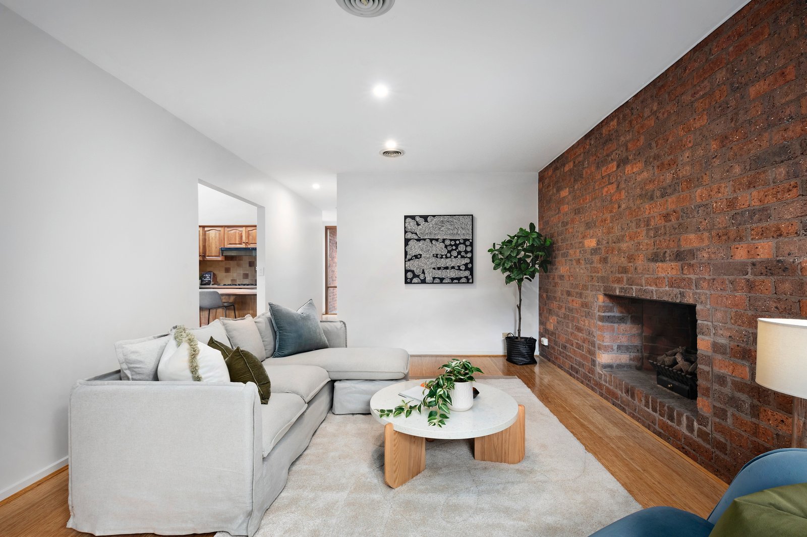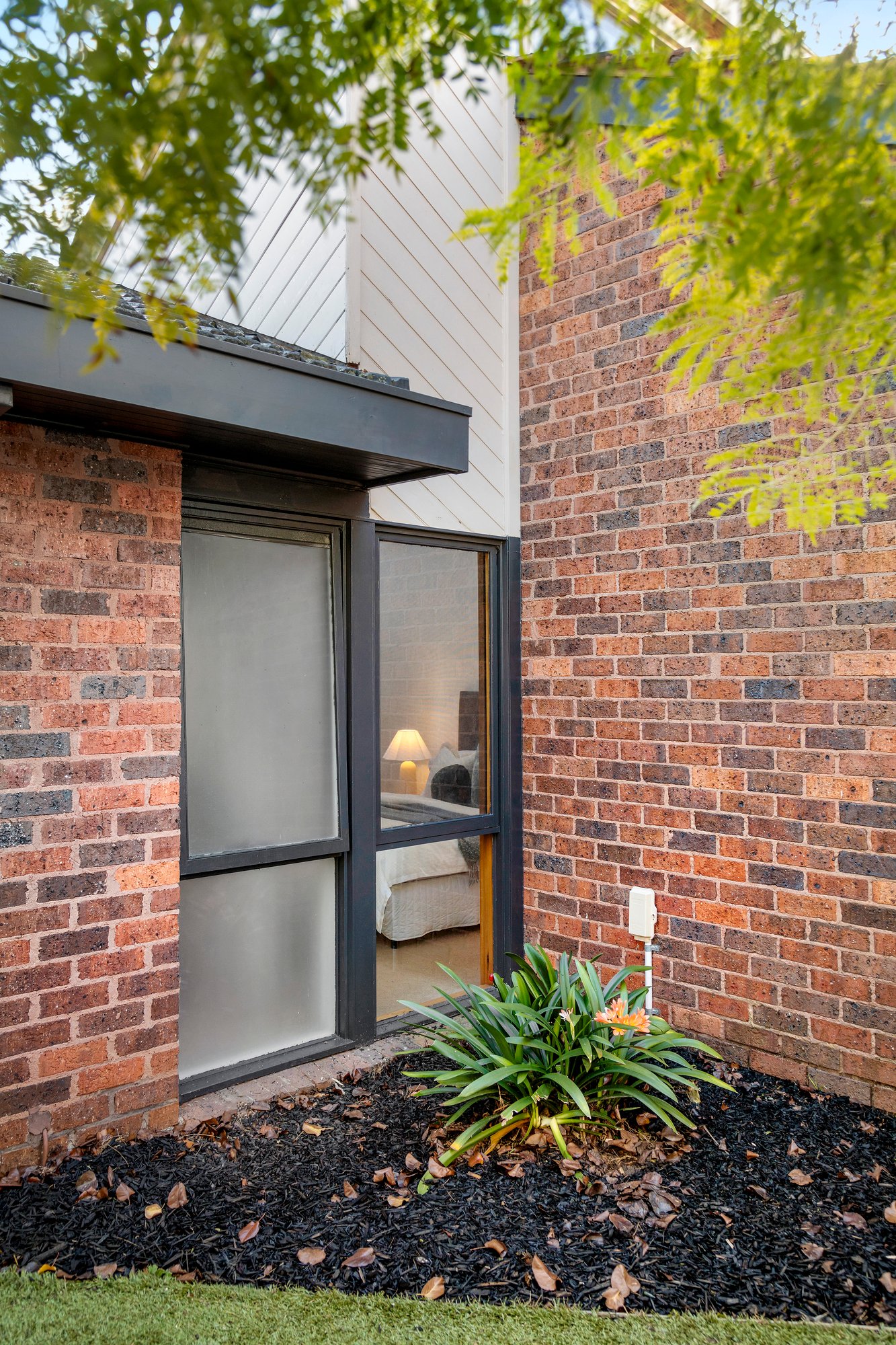 Freshly painted throughout, soaring angled ceilings with clerestory windows above double-height voids enhance the home’s light-filled dimensions, while bamboo timber flooring flows throughout the open-plan living areas. The layout lends itself to zoned family living with the spacious main bedroom suite at the front of the home, complete with a large walk-in robe and shower ensuite, while a separate ‘wing’ off the living zone contains another bedroom with built-in robes, and bathroom with built-in bath, shower and separate toilet. The third bedroom (or study/home office) is adjacent to the main living area, which has a gas log fire in the original brick fireplace, and there is split system heating/cooling plus gas ducted heating. Oriented towards the north-facing open plan family/meals area, the original central timber kitchen is equipped with a 900mm gas cooktop, a Westinghouse wall oven and a new dishwasher. Glass sliding doors open out to the private wraparound garden with mod-grass turf and lushly planted established borders, perfect to enjoy alfresco entertaining, and a secure space for kids and pets to play.