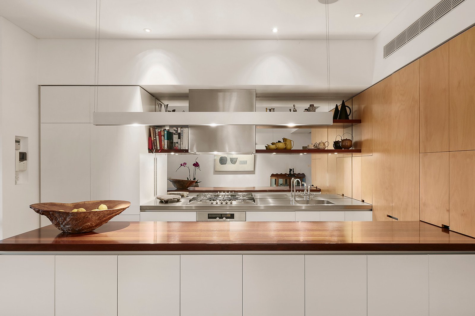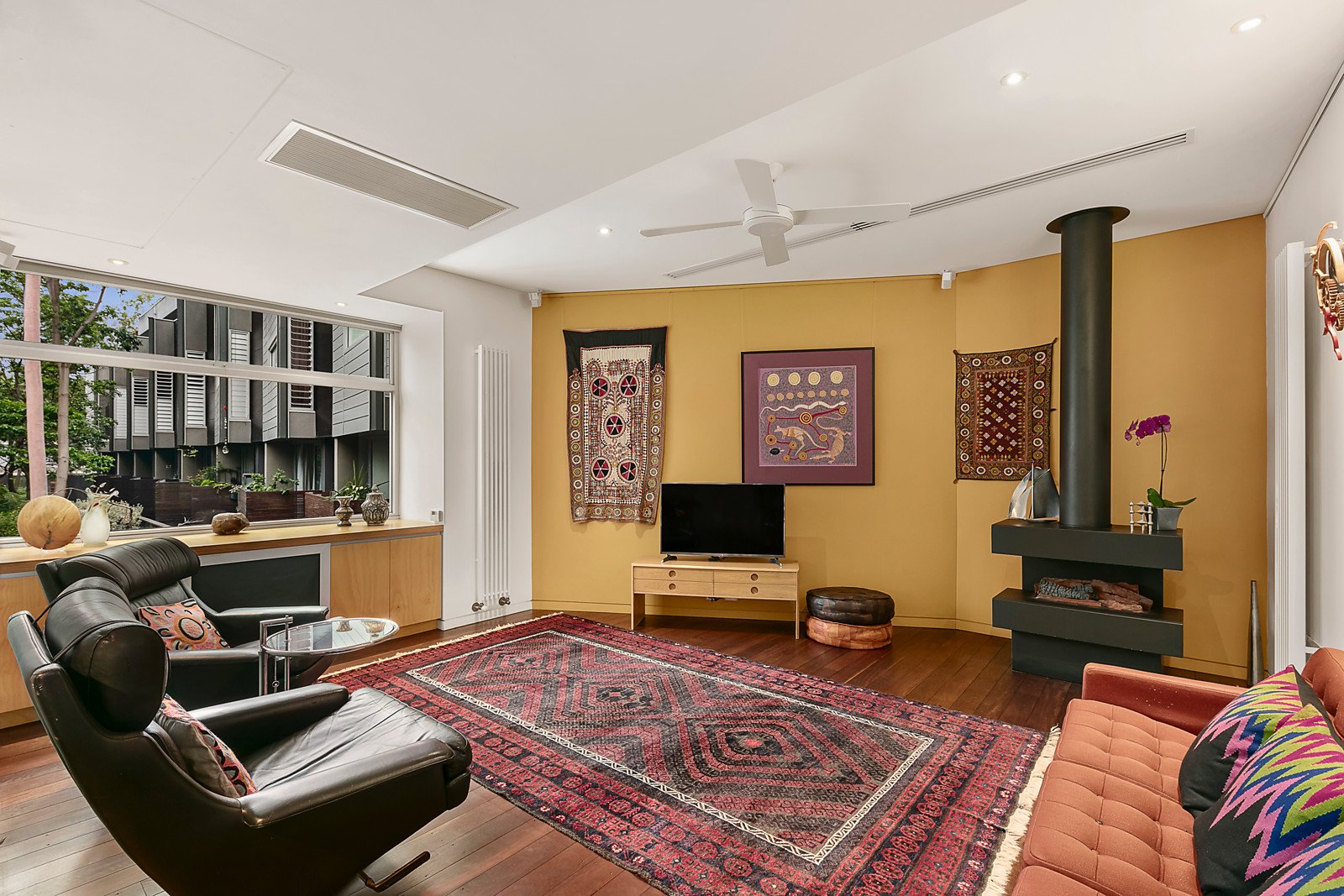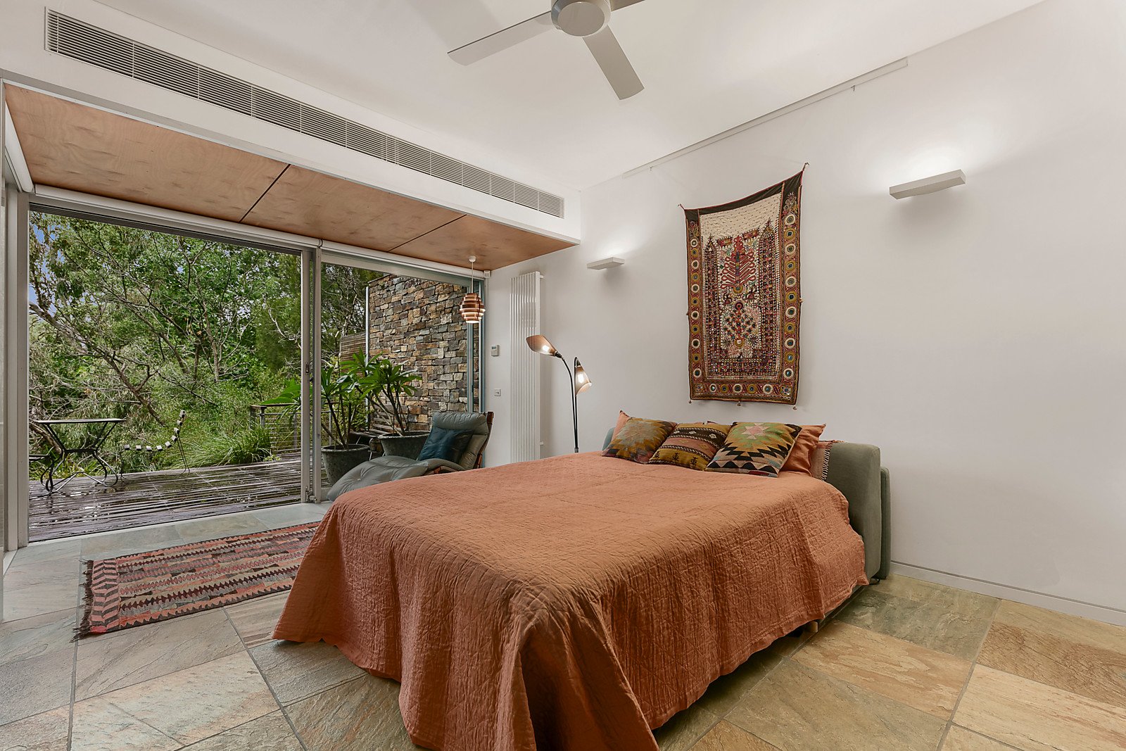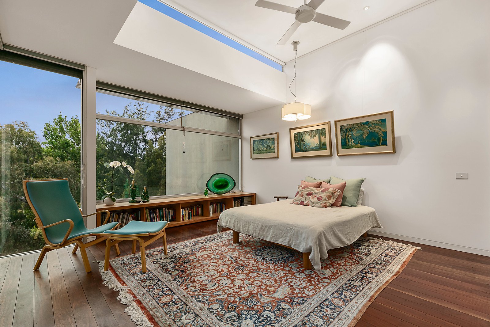 Framed by a large northeast deck with pond and lush gardens that cascade down to the bike track and the river, the entrance hall flows through to a versatile and spacious retreat with stone floors and a concealed fitted study area. It's the ideal home office or guest bedroom with direct entry and a stylish bathroom beyond. Accessed by lift and timber stairs, the expansive open plan living and dining room features 100 year old Wandoo hardwood floors recycled from a wool-store, high ceilings and a gourmet kitchen appointed with Wandoo timber and stainless steel benches, Miele appliances and Liebherr fridge/freezer. To one end of the living area frosted glass sliders separate a relaxed sitting or media room with Jetmaster gas fire. Glass sliders open the living space to a large northeast facing Spotted Gum deck, perfect for al fresco dining while enjoying the breathtaking Yarra River and parkland views. On the level above, high clerestory windows accentuate the sense of light and space in the beautiful main bedroom which also commands picturesque river views. Complete with a north/east-facing balcony and customized robes, it is accompanied by a second double bedroom with robes and a designer bathroom.