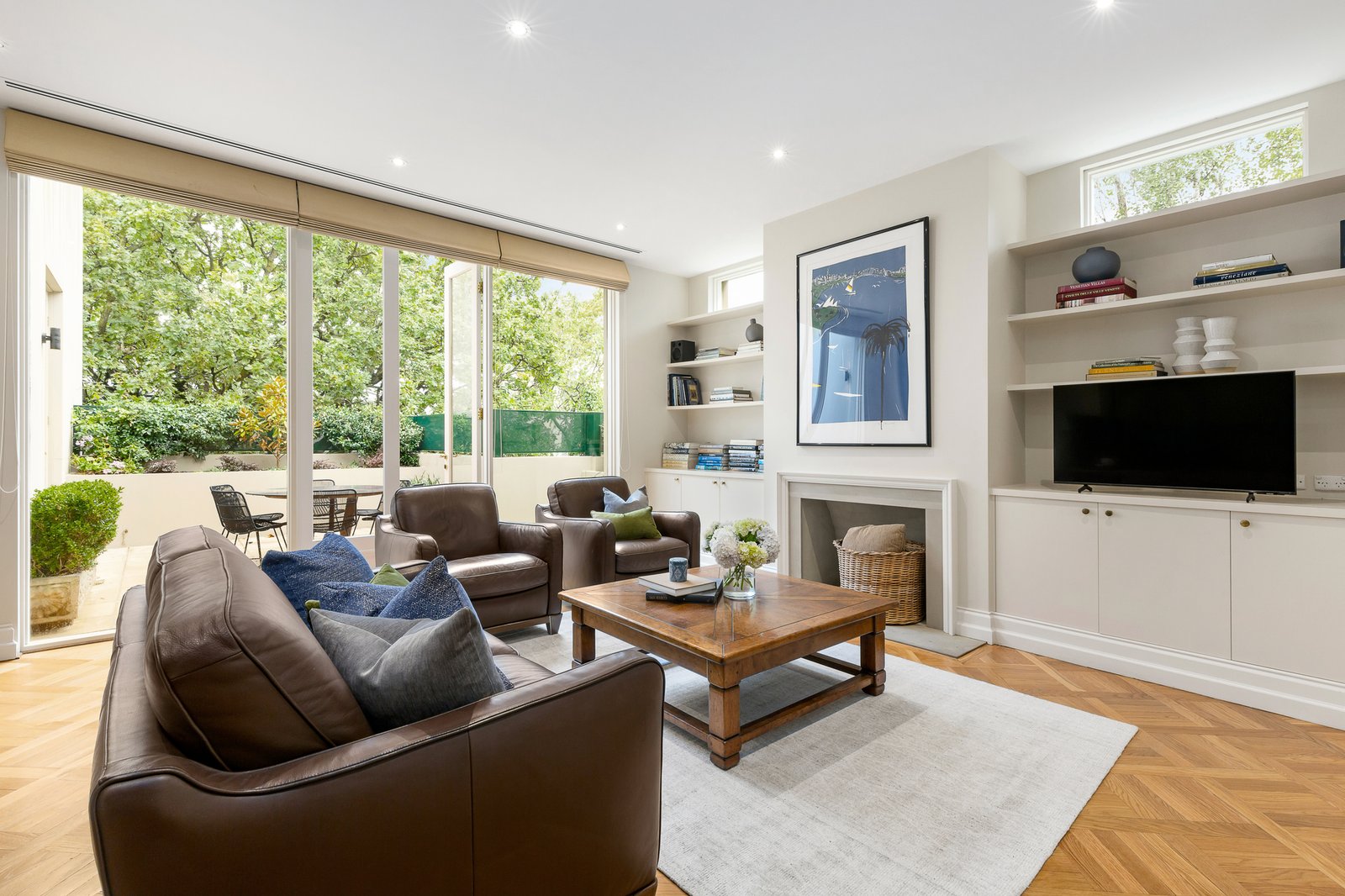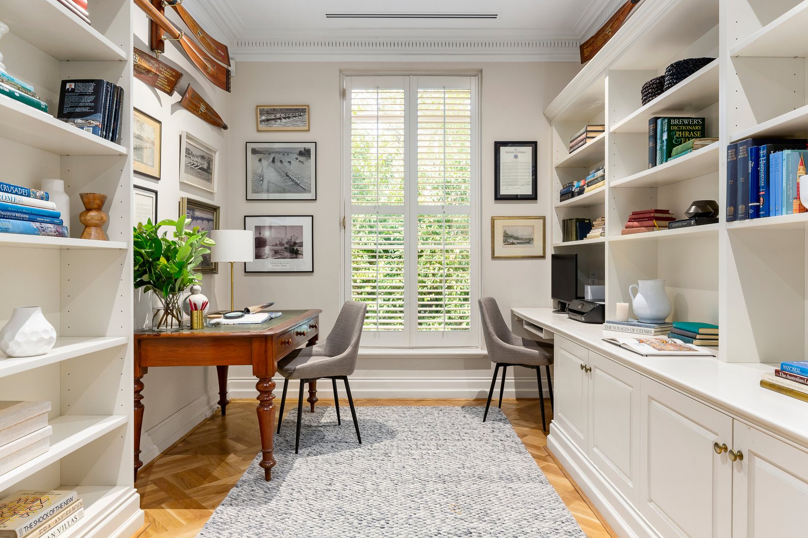 Beneath soaring 3.4m ceilings, rich oak parquetry floors flow through the generous reception hall to an executive study or third bedroom and to an expansive formal living and dining room. Northern light streams through the inviting casual family/dining room and served by a superb kitchen appointed with Gaggenau appliances and stone benches. French doors open to a private north-facing terrace with sun-awning, a tranquil al fresco dining and entertaining venue surrounded by leafy greenery. The beautifully spacious main bedroom with lavish travertine en suite and built in robes is matched by an equally proportioned second bedroom with robes and travertine en suite.