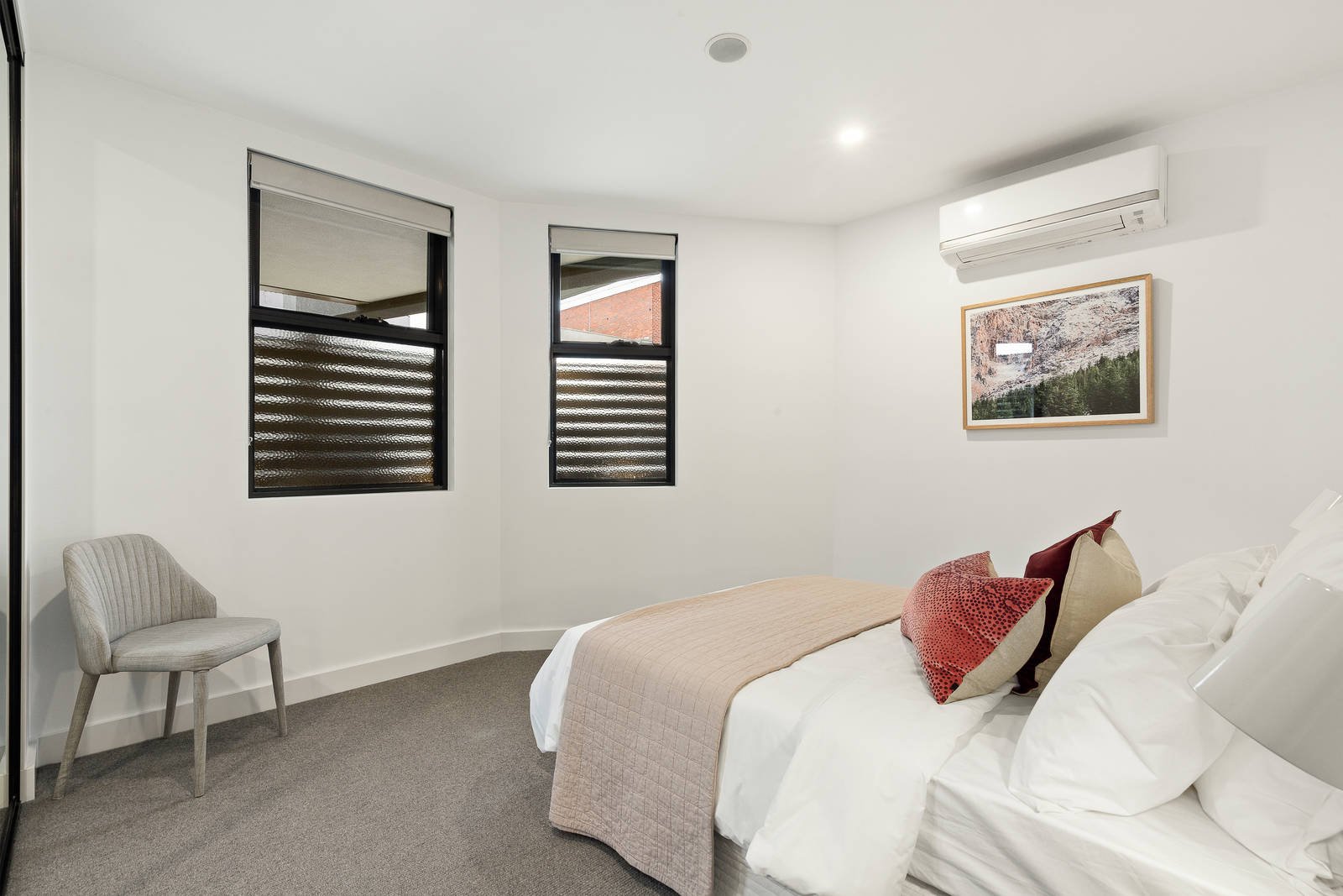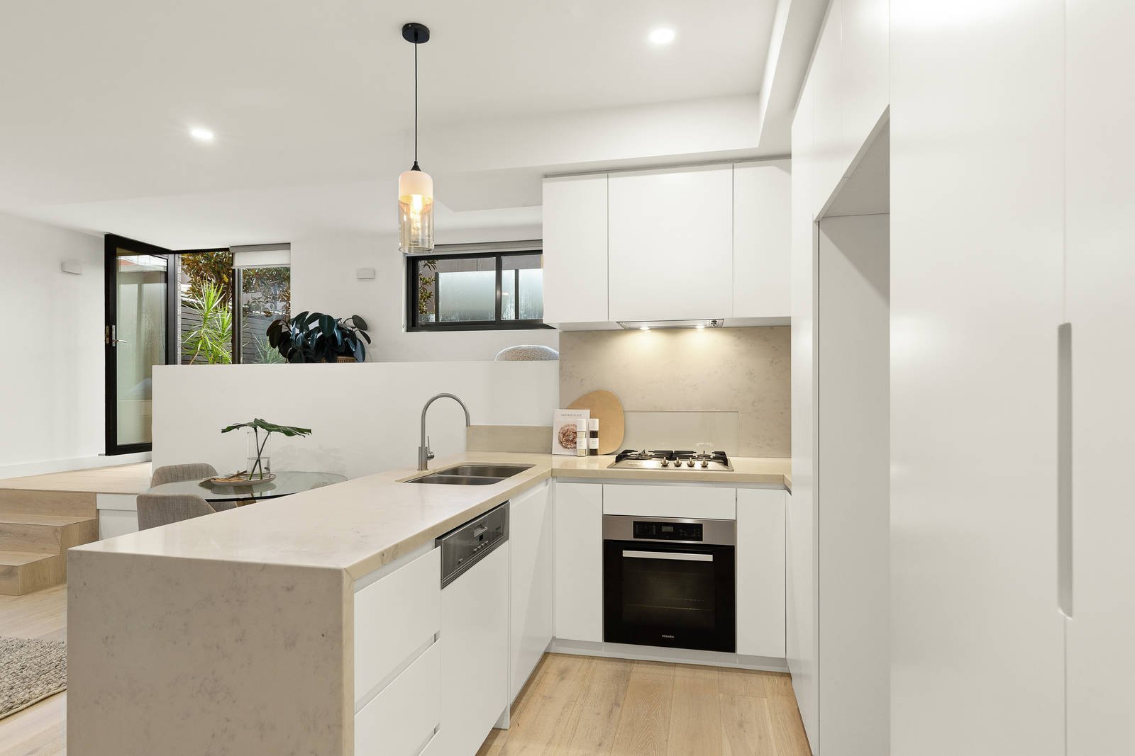 A gleaming white kitchen with stone bench tops, and Miele appliances is the epitome of designer vogue with timber flooring and a spacious al fresco flow through to the elevated courtyard. The main bedroom included an ensuite and both bedrooms are fitted with built-in robes, with secure video entry, basement parking and storage cage, as well as split system heating and cooling.