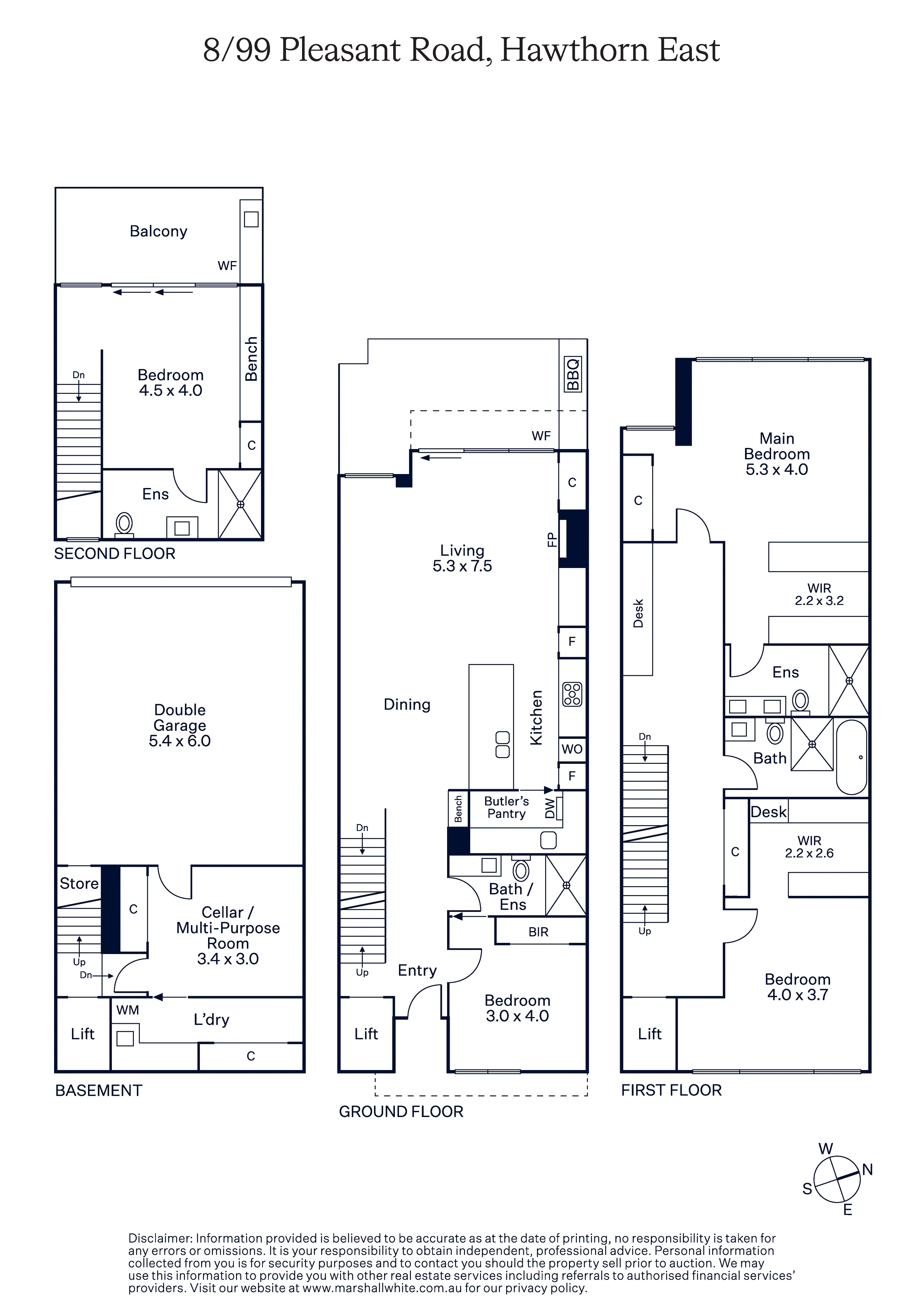 Step inside number eight and admire the designer style interior and bespoke fit out featuring engineered oak parquetry floors, beautiful timber and Italian stone surfaces throughout. Immaculately presented over four levels leaving nothing to be desired. Level 1 features a double bedroom with built-in robes, a family bathroom and a generous living and dining area incorporating a bar and sleek kitchen superbly equipped with prestige Gaggeneau and Miele appliances, Liebherr integrated fridge and separate freezer, and a butler’s pantry. Opening through floor-to-ceiling sliding doors to a leafy, night-lit terrace with a built-in BBQ kitchen – perfect for indoor/outdoor relaxation and entertaining. Level 2 has a study/home office area, a second family bathroom, two further bedrooms including a large main with a WIR and ensuite. Leading to the third level retreat or fourth bedroom plus a fourth bathroom; all opening to a rooftop deck with a bar fridge and tree-top views to the tops of the City skyline. The basement level has a laundry and multi-function utility room with cellar or possible gym if desired and garage access.