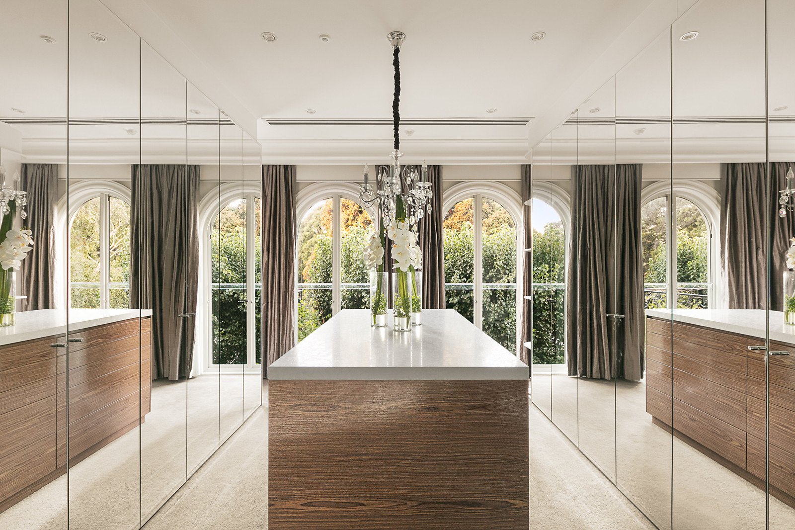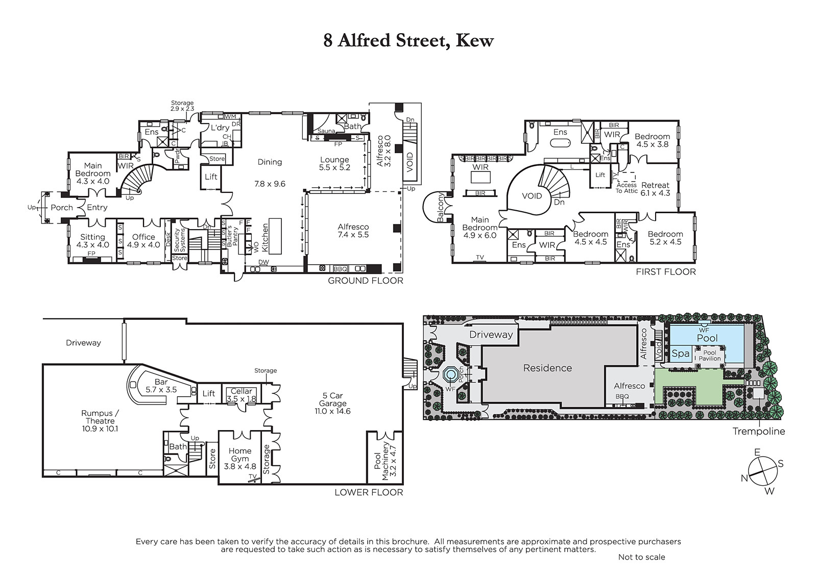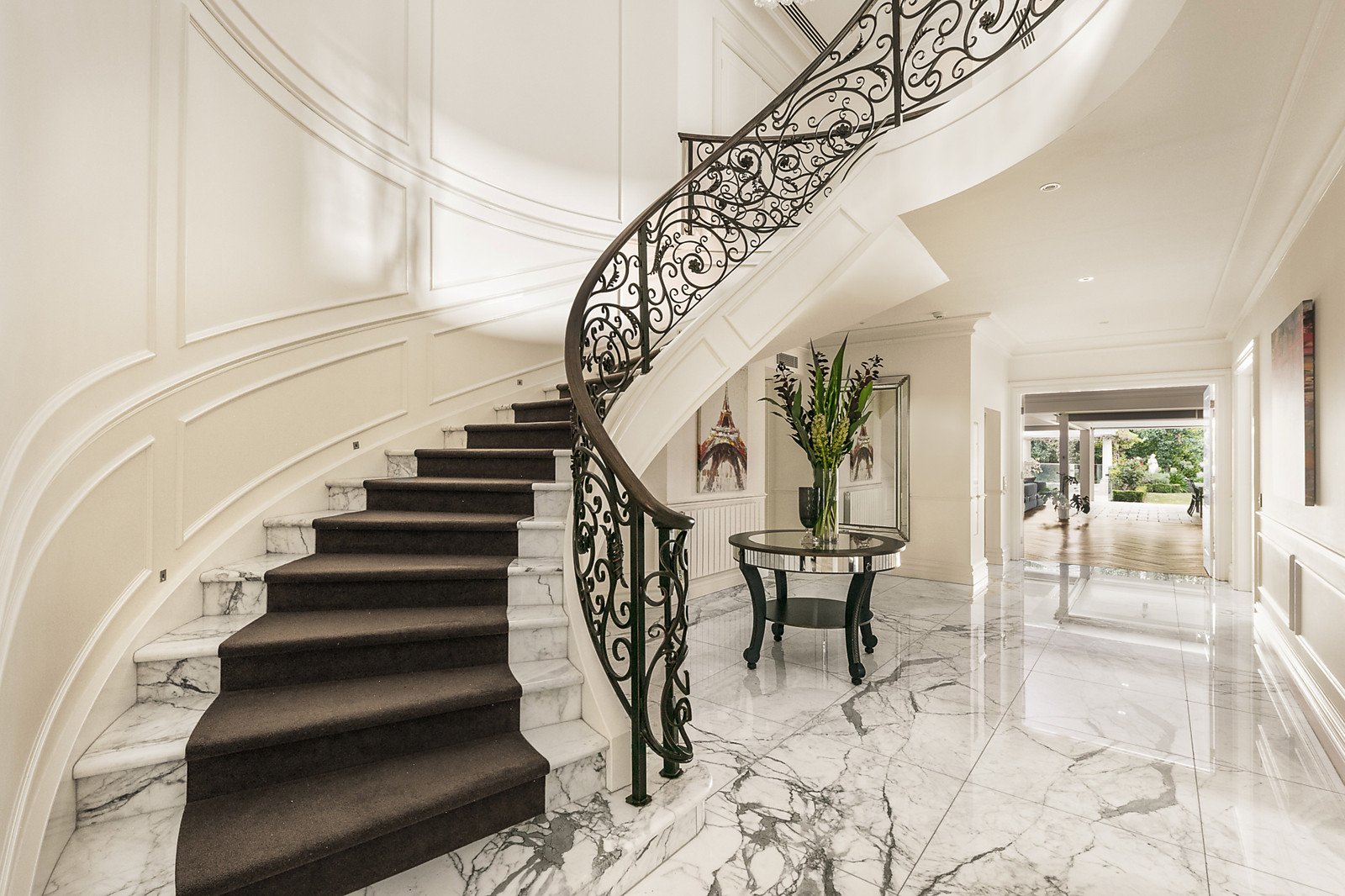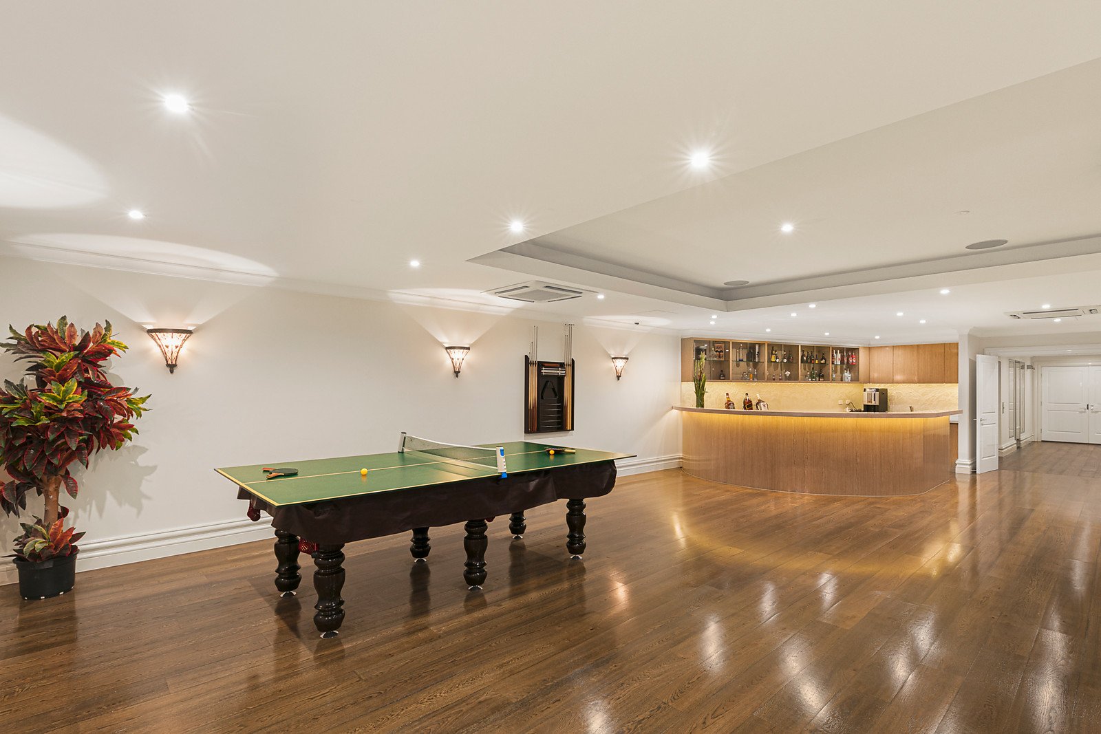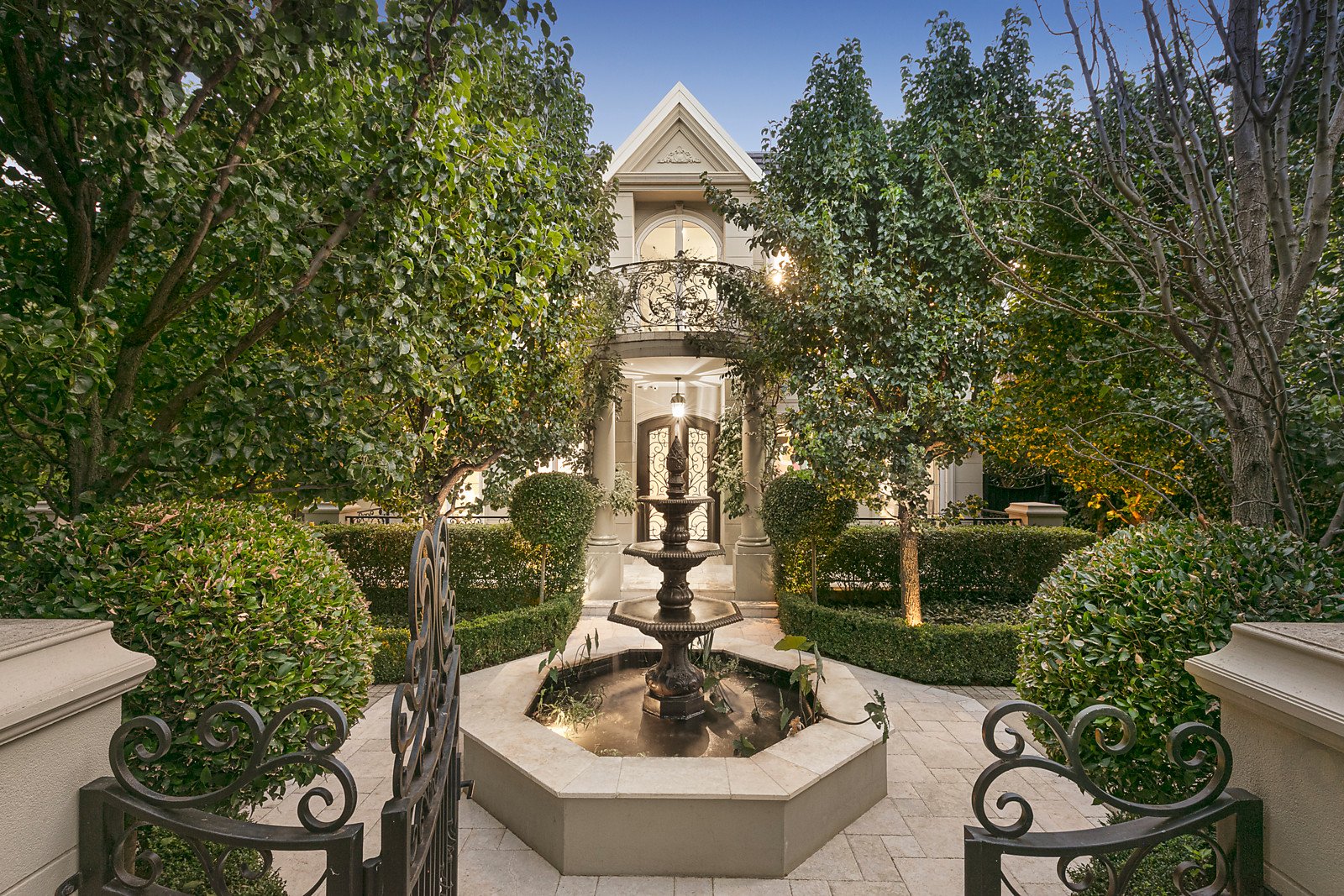 Serenely set behind a glorious leafy landscaped garden with fountain, the grand reception hall replete with marble floors and soaring ceilings introduces an elegant sitting room with a pebble fire and a refined fitted library/home office. Oak parquetry floors flow through the spectacular proportions of the palatial open plan living and dining room with a gas pebble fire and premium Miele kitchen boasting Calacatta marble benches, integrated fridge/freezer, and a butler's pantry. Ideal for entertaining on a lavish scale, three sets of glass cafe doors completely open the living spaces to an expansive alfresco dining terrace with a full BBQ kitchen, outdoor heaters, and cafe blinds. Beyond the terrace, a stunning private established garden oasis includes a gazebo, heated self-cleaning pool, and spa with remote cover, in-ground trampoline, outdoor bathroom, and sauna. A generous guest bedroom with walk-in robe and stylish en suite is conveniently situated downstairs. A gracious curved marble staircase and a lift ascending to the first floor featuring a sumptuous main bedroom with dressing room, deluxe walk-in robe, opulent ensuite, and north-facing private balcony. Also upstairs there are three additional bedrooms with chic en suites and walk-in robes and a retreat. The basement level, also reached by lift and stairs, comprises an extravagant fully fitted home theatre with a lavish wet bar, a wine cellar, gym, store-rooms, and a 5-car garage.