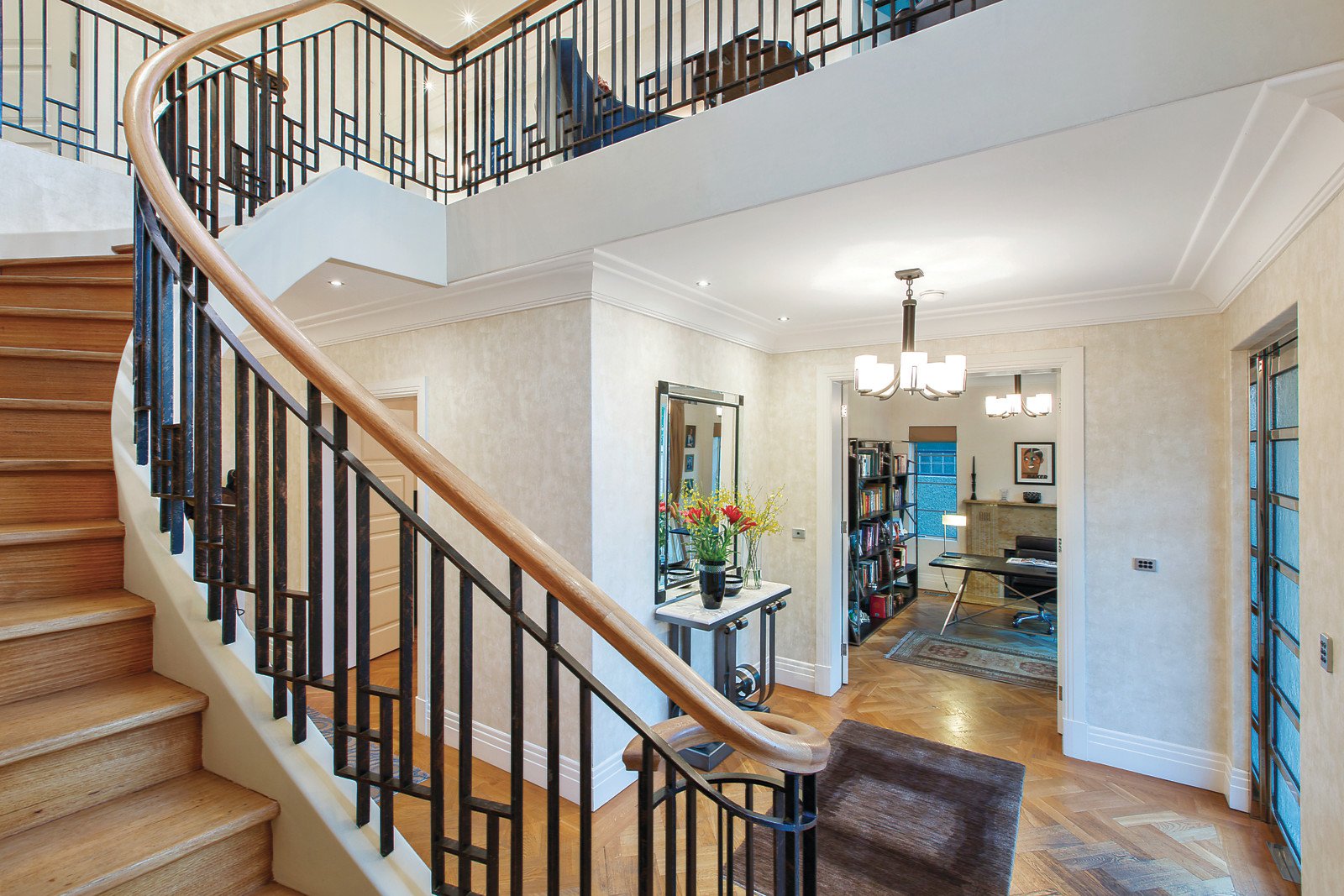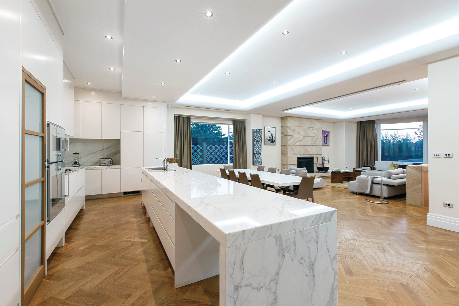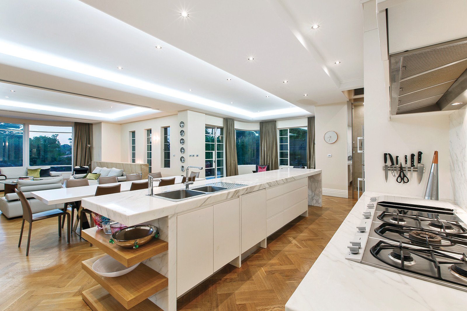 Elegant formal living and dining rooms, a comprehensively equipped Carrara marble kitchen with a full suite of premium Gaggenau appliances, an adjacent informal dining area opening to a large alfresco entertaining terrace and a huge family room with OFP and an impressive study complete the ground floor.