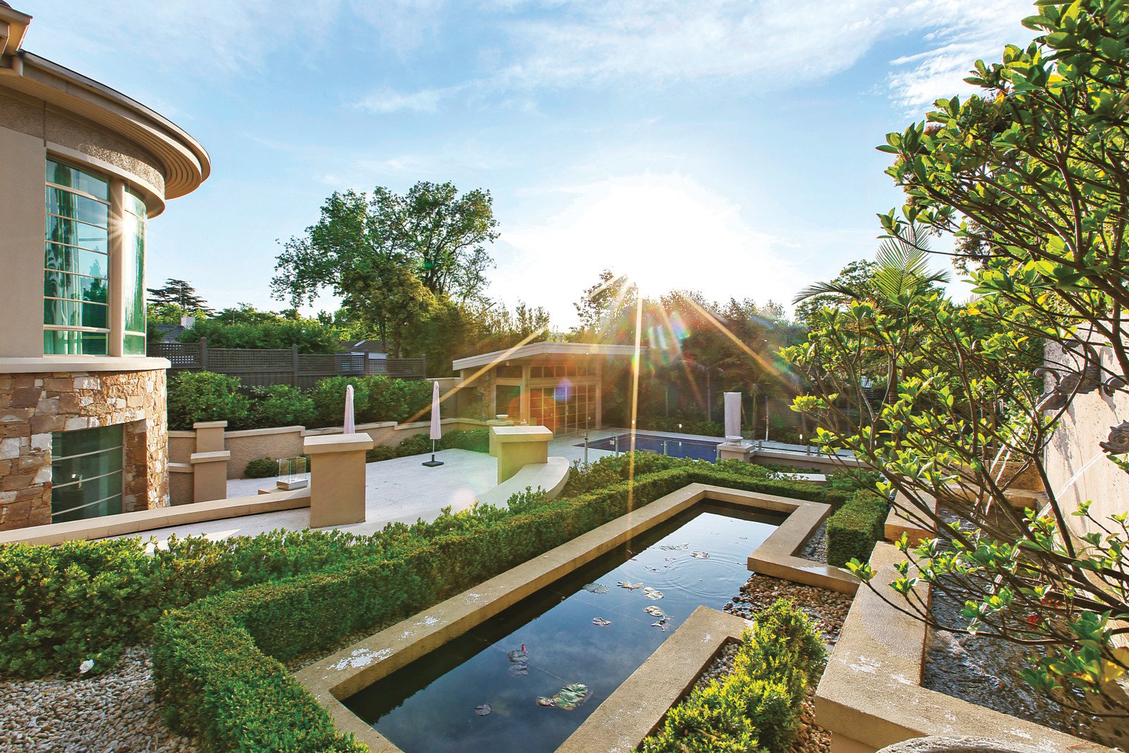 The private sheltered and sunny rear garden is a perfect setting for the fully-tiled, heated 13-metre swimming pool and a substantial pool house or cabana incorporating a sleek stainless steel kitchen.