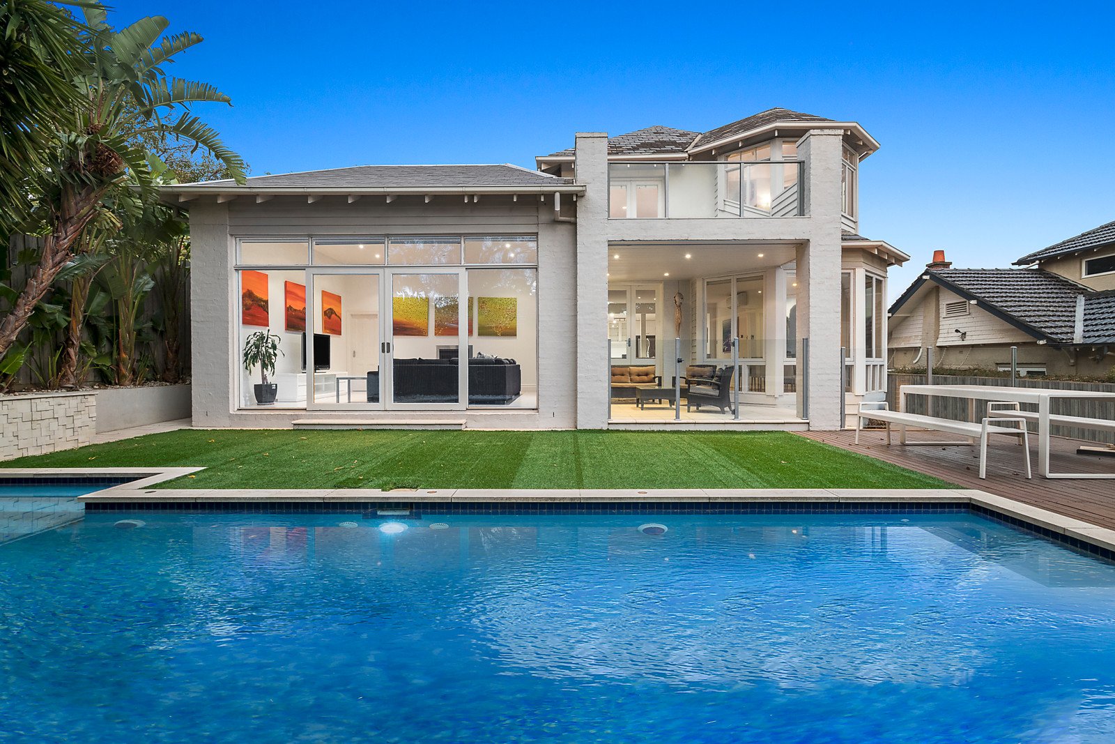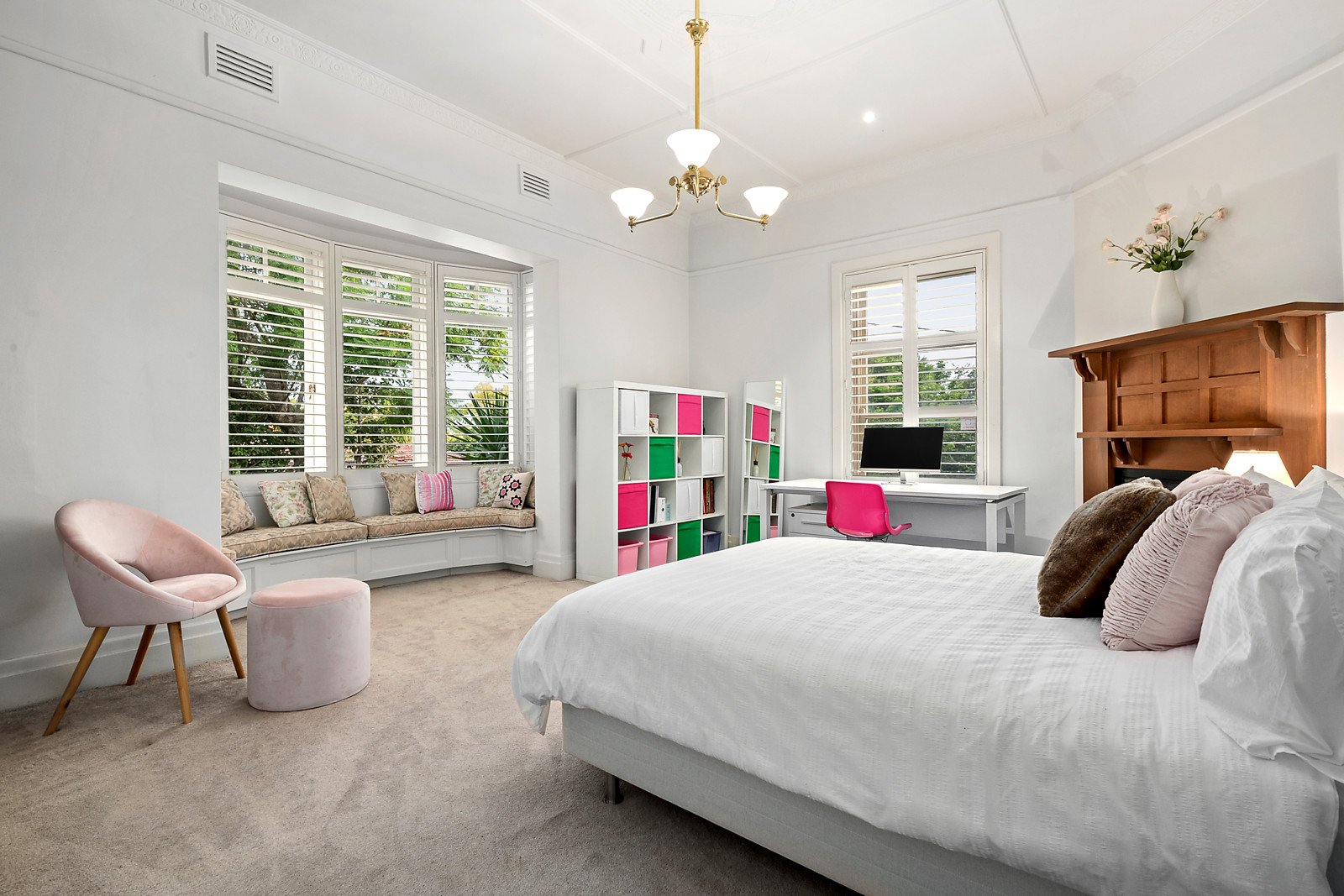 Exquisite ceilings and leadlight windows highlight the period charm in the welcoming central hall, elegant sitting room, three beautiful bedrooms with open fireplaces, a 5th bedroom and bathroom. The lavishly proportioned main bedroom with walk in robe, en-suite and 2 balconies enjoys its own space upstairs alongside a fitted study nook. The gourmet kitchen boasting stone benches and a spacious family living and dining room are bathed in natural light while a separate media/rumpus room with gas fire opens to a covered terrace overlooking the private northeast garden and pool.
