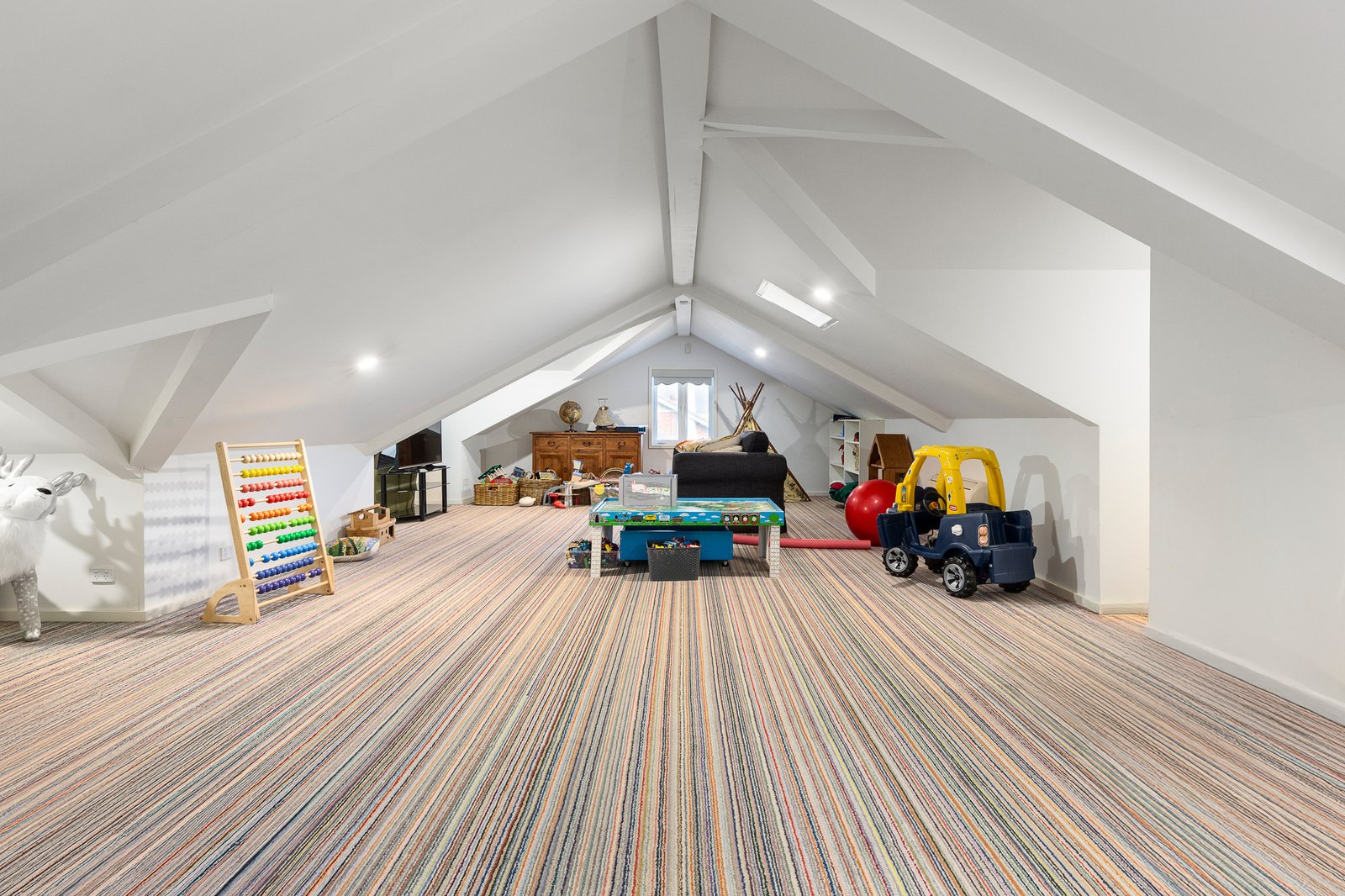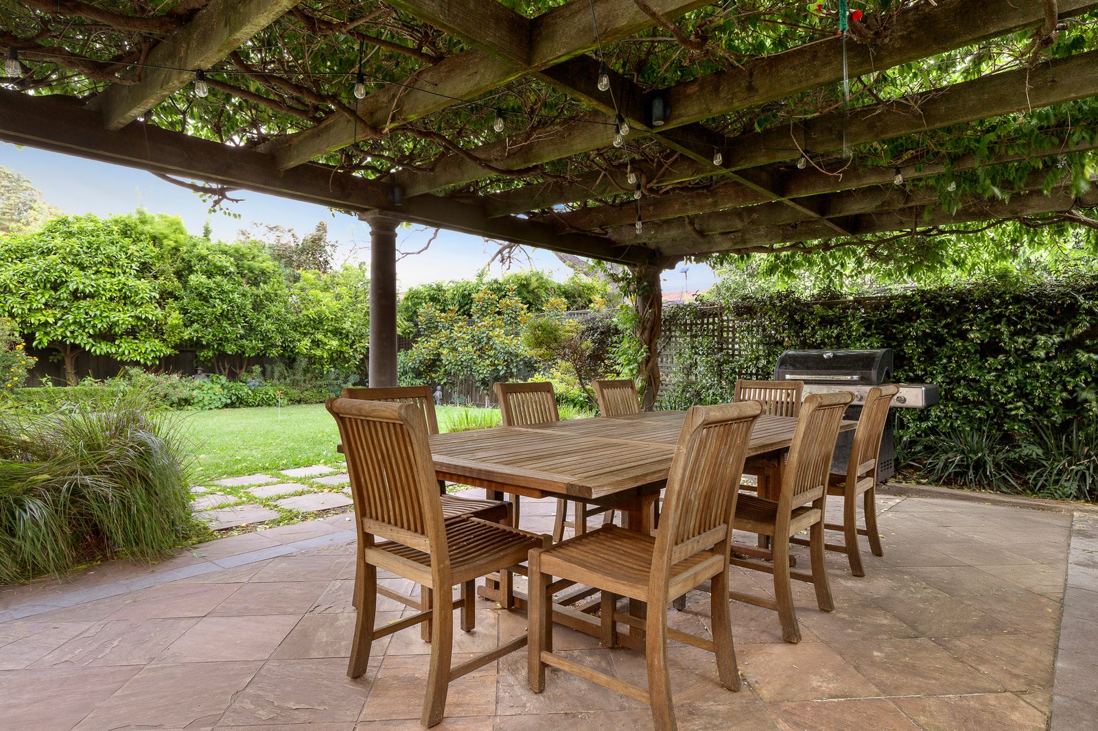 Preceded by a picturesque garden with striking water feature, a broad verandah introduces the central entrance hall featuring high ceilings and timber parquetry floors. Enjoying garden outlooks, the gracious sitting room with fireplace is adjacent to an elegant formal dining room with bay window. Timber floors flow through the expansive open plan living and dining room impeccably served by a gourmet kitchen appointed with stone benches, Miele appliances and a butler’s pantry. Two sets of double doors extend the living out to a large terrace overlooking the beautiful deep landscaped garden with ornamental fishponds and a large Tuscan inspired al fresco terrace set beneath a magnificent Wisteria covered pergola, the ideal setting for long summer lunches. On the ground level enjoying peace and quiet is the main bedroom with built in robes and designer en suite and a generous home office fitted with a desk and storage. A sensational children’s zone upstairs comprises three additional robed bedrooms, a stylish bathroom and a fabulous attic-style playroom/retreat of impressive proportions.