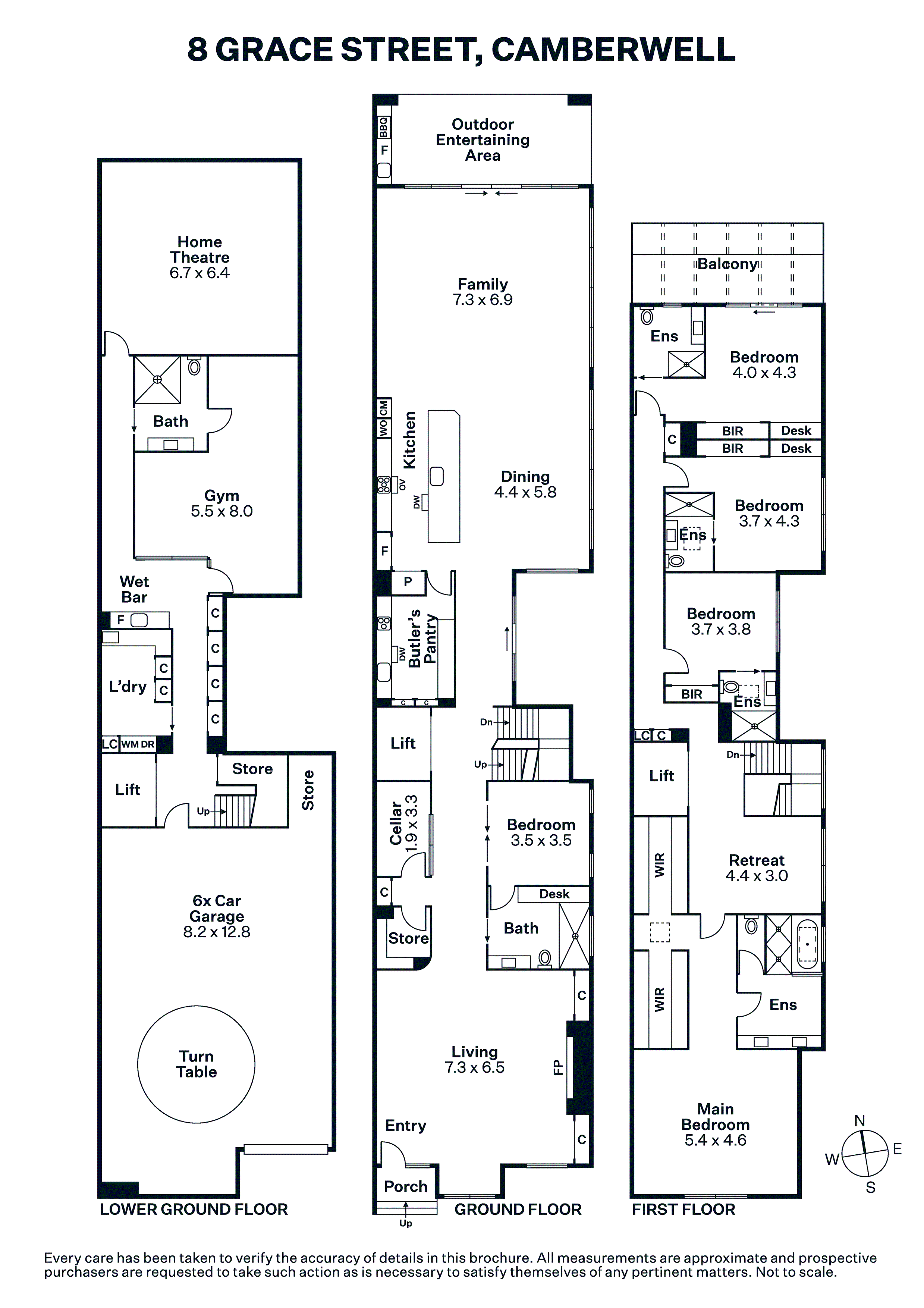 The interior over three levels, which is a triumph of light and space featuring high ceilings, full-height windows and doors, glass walls and herringbone parquetry floors enhanced by a northern rear orientation. The first level opens to a generous living room, study/office or 5th bedroom, downstairs dual access bathroom, wine room and a central courtyard. A vast family domain incorporates a state-of-the-art entertainer’s kitchen and butler’s pantry equipped with stone benches and a full complement of prestige Miele appliances including an integrated fridge/freezer. Connecting to a stunning north-facing alfresco entertaining terrace complete with a barbeque kitchen overlooking the private rear garden with a raised solar heated pool. The upper level has a family retreat or study area and four luxurious bedrooms all with fully tiled ensuites, three with built-in robes, including a lavish main bedroom with dual WIRs; plus a sunny northern rear balcony. The basement level includes a home cinema, gymnasium, bathroom and laundry. Other comprehensive appointments include video intercom entry, an alarm, security cameras, lift access to all levels, ducted heating and zoned reverse-cycle air-conditioning, underfloor heating, gasLFP (living), ample storage throughout, landscaped gardens and a secure 6-car garage with a turntable and direct internal access.