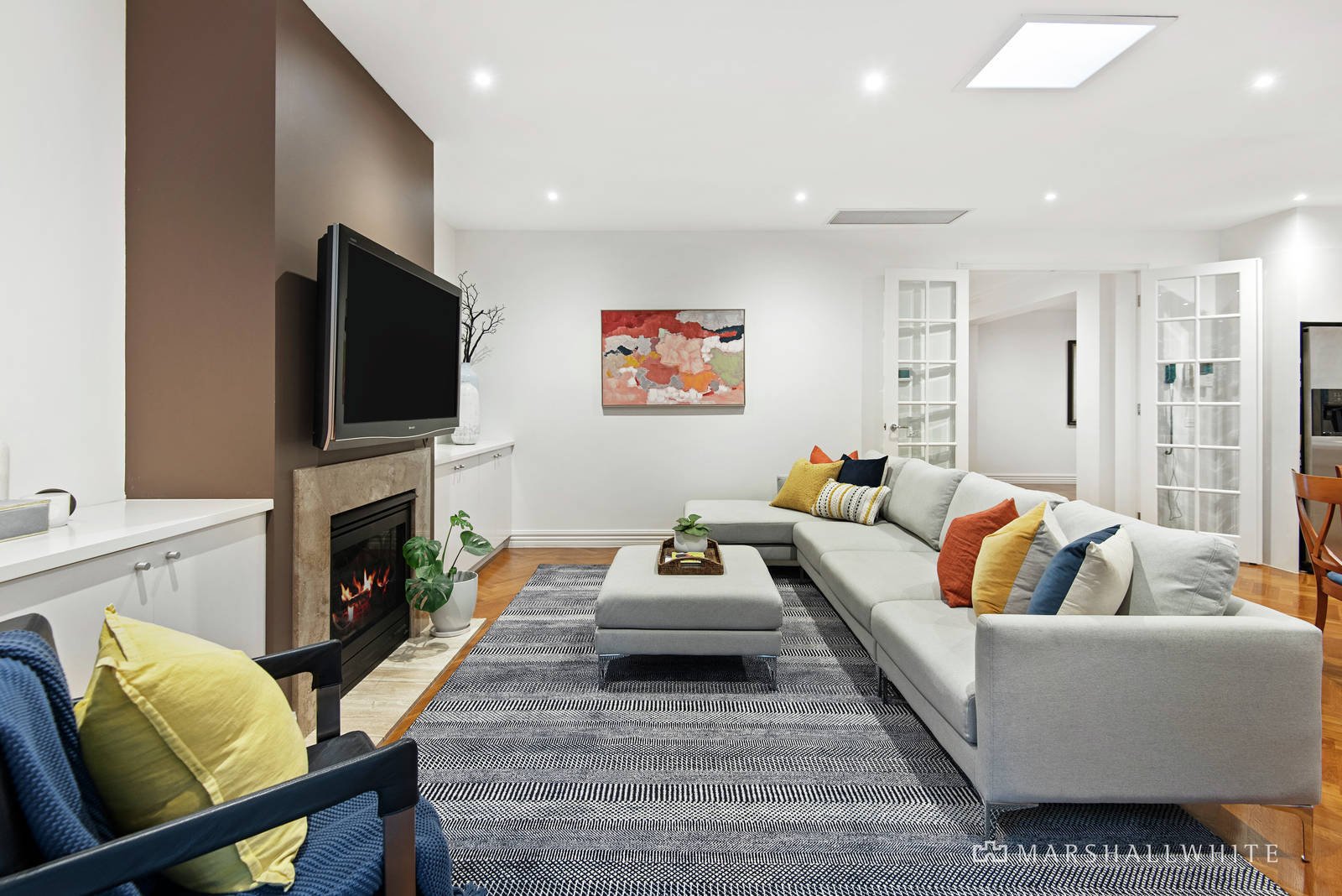 With a relaxed harmony and ease of living, the home flows under towering ceilings to a superb open-plan kitchen / meals / living area in which stone benches and solid Herringbone floors are complemented by a suite of quality SMEG appliances. Warmed by a large gas log fireplace, the open-plan connects through three sets of French Doors to paved undercover outdoor entertaining and an elevated backyard that basks in the sunshine of the north and the west.