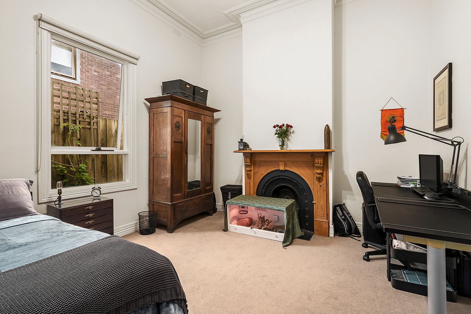 The interior features ornamental fireplaces in each room, a long single arched hallway leading to 2 good-sized bedrooms, a full-width living room, well appointed kitchen/meals and a bathroom (bath) flowing to a rear laundry, Study/3rd bedroom and easy care garden; ideal for relaxing with family or friends.