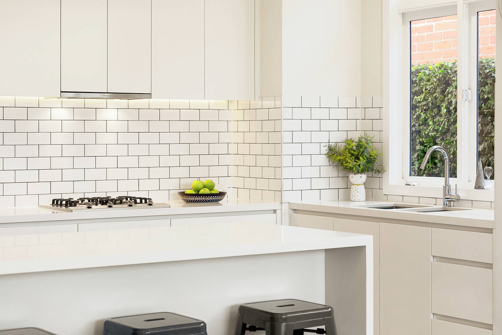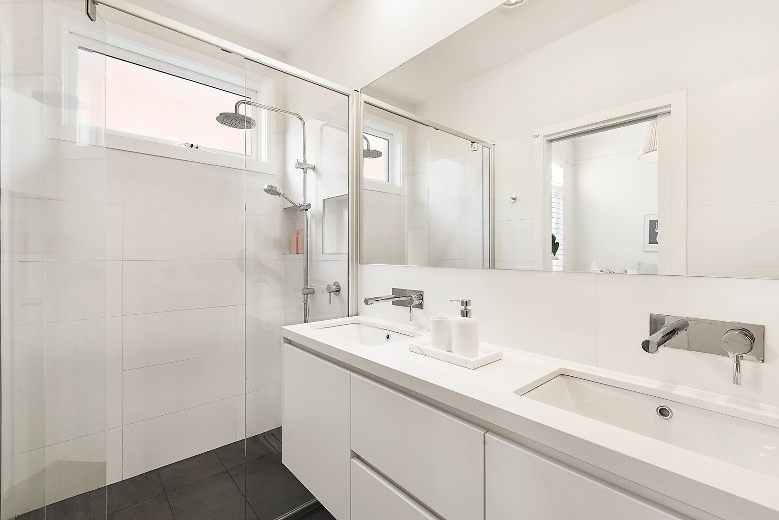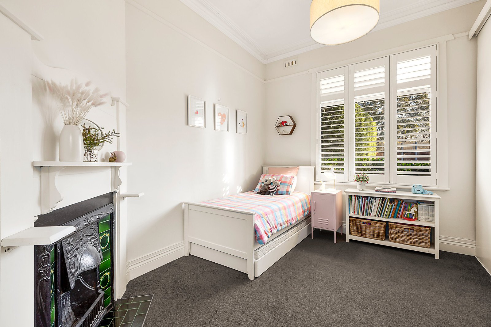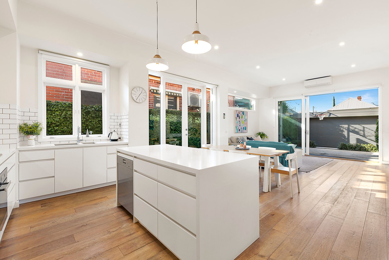 Wide oak floors add a contemporary edge to the L-shaped entrance hall which leads to two beautiful bedrooms with built in robes (one with fireplace), a main bedroom with fireplace, built in robe and en suite and a designer bathroom. Streaming with northern light, the generous open plan living and dining area includes a sleek gourmet Miele kitchen with white stone benches. Large glass sliders reveal a private tranquil northeast landscaped garden with an entertaining deck and secure off-street parking via a rear lane.