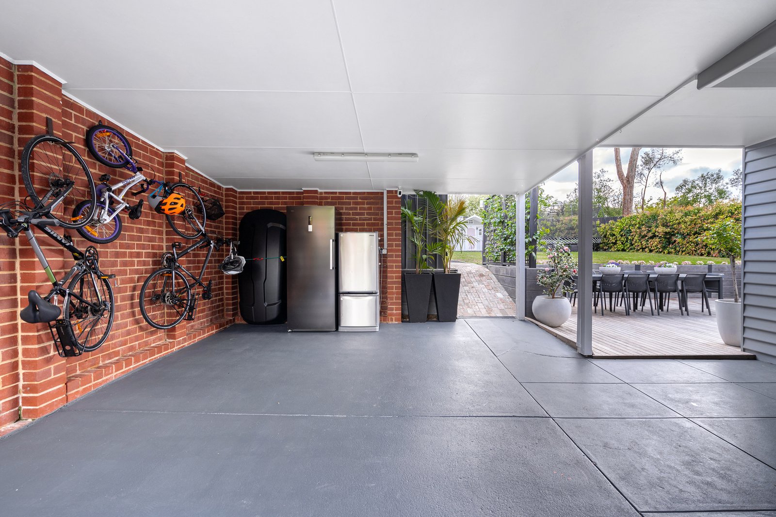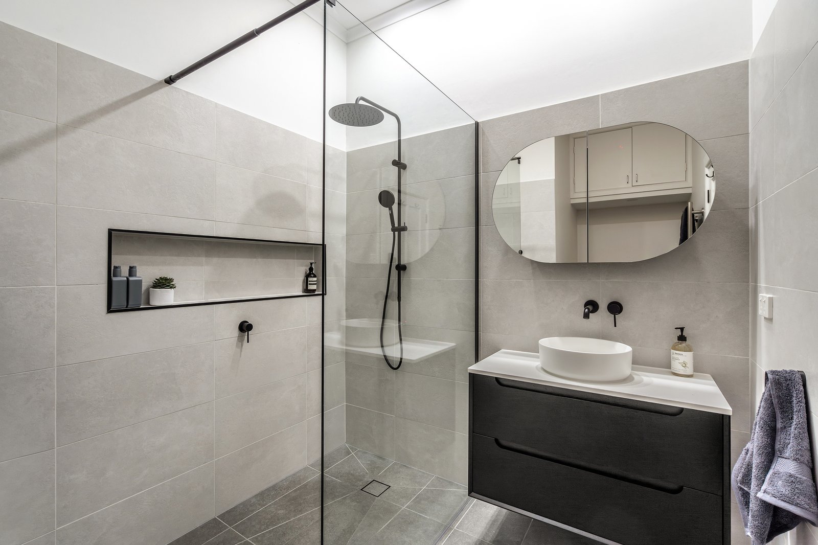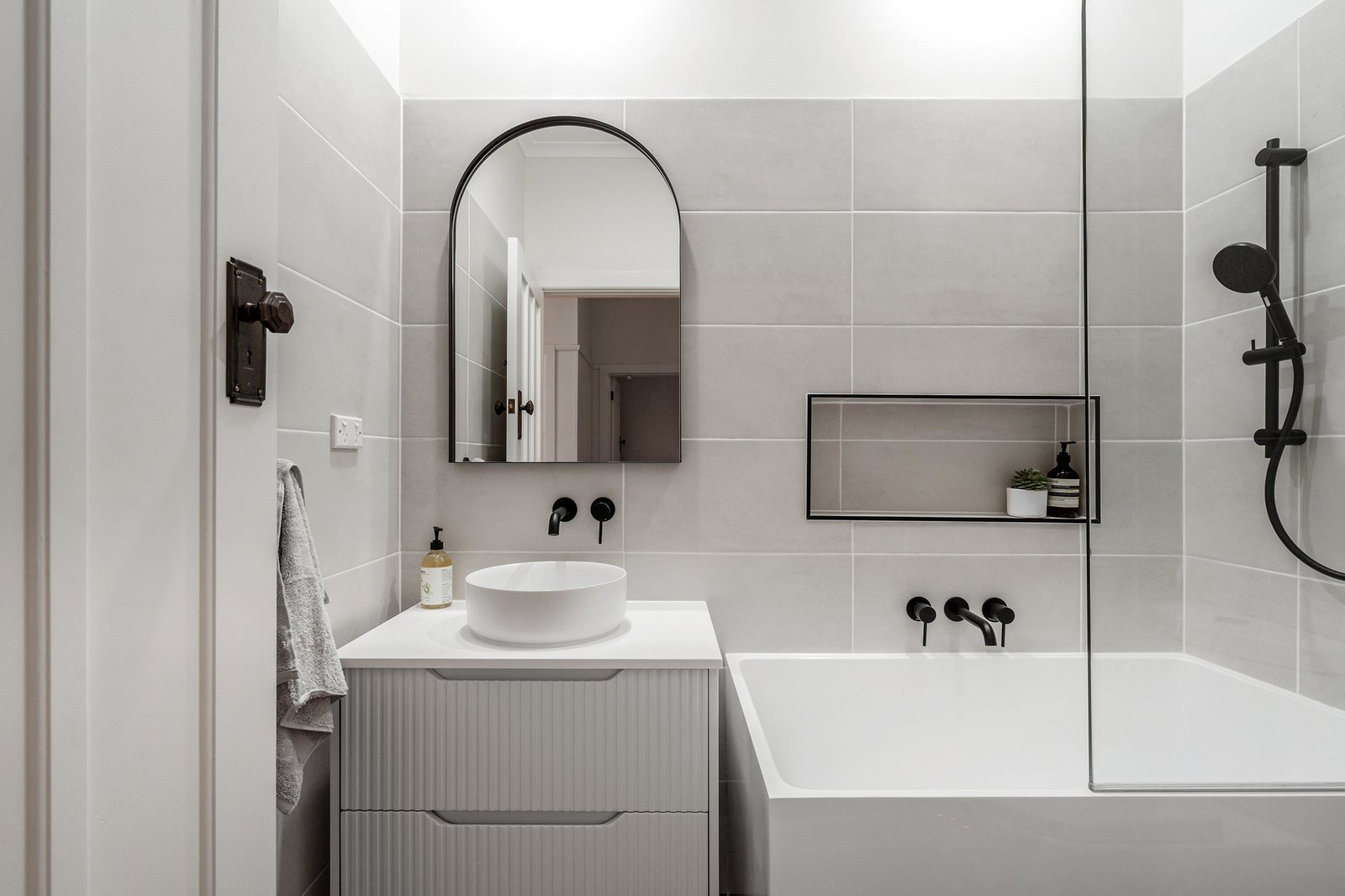 This home boasts three generously sized bedrooms, all featuring built-in robes for ample storage. The main bedroom is a standout feature, complete with its own luxurious ensuite bathroom for added privacy and convenience. The two bathrooms are a testament to modern design, featuring black hardware for a touch of elegance. The main bathroom boasts a luxurious Japanese-style bathtub, an arched mirror, and a beautiful vanity, all complemented by stylish black fixtures.