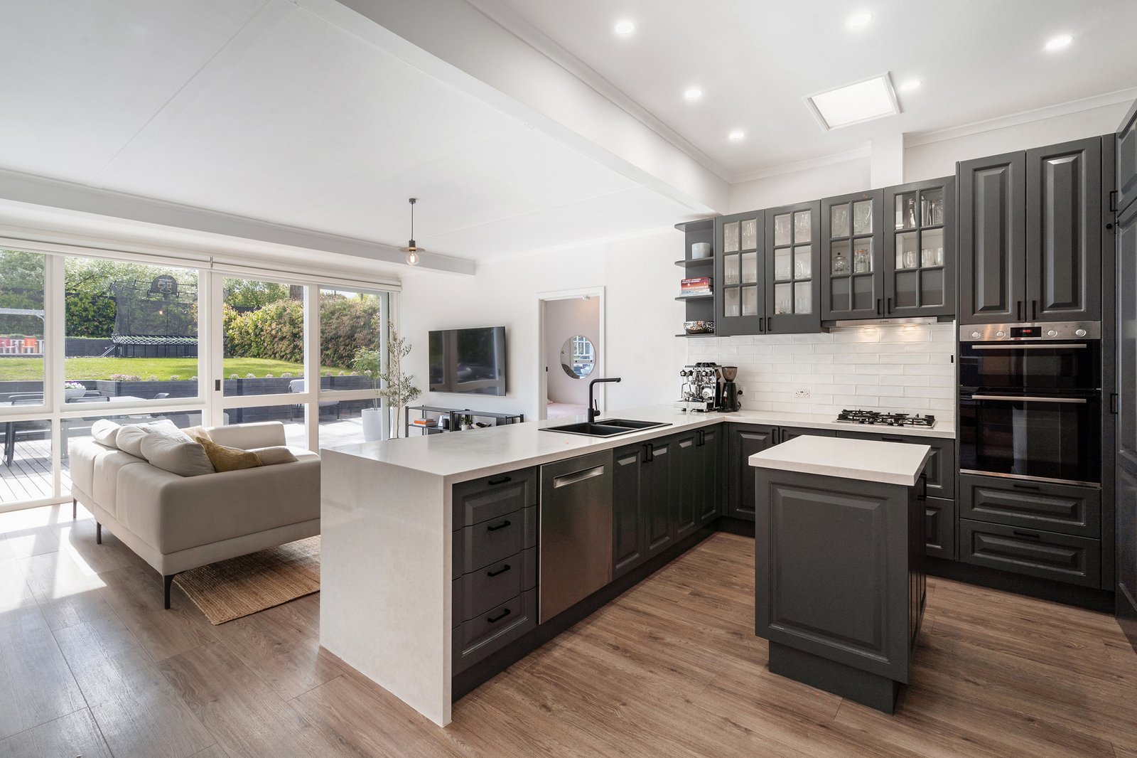 The heart of the home is the bright and beautiful kitchen and living area. Featuring dark grey cabinetry that exudes sophistication, the kitchen is equipped with top-of-the-line Bosch appliances. A breakfast bar and additional kitchen island provide ample space for casual dining and food preparation. The informal lounge room seamlessly connects to the outdoors, creating a perfect flow for entertaining. The formal lounge room, graced with an original fireplace, offers a cozy retreat for quiet evenings.