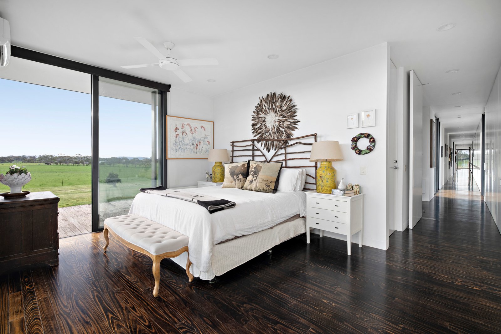 Bedrooms are privately zoned - the main suite is a spacious sanctuary, wrapped in glass sliders that dissolve the boundary between inside and out, while two additional bedrooms also offer built-in robes and corner glazing. Two bathrooms are ideally placed, with one offering a freestanding tub. Comfort is considered, with reverse-cycle systems to bedrooms and panel heating throughout the home.