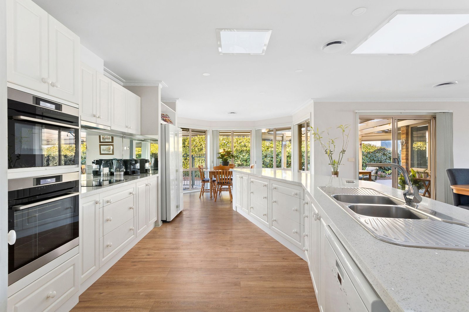 Elevating dress-circle golf course living is a spacious single-level floor plan. Intuitively laid out, it flows past a formal living room to the rear, where open-plan living and dining are set against a 180-degree panorama encompassing the lake and Arthurs Seat. The generous kitchen proudly oversees everything, well-appointed with sleek stone benchtops and quality appliances, catering effortlessly to family meals and gatherings with guests. Multiple bay windows invite the outdoors in, whilst a covered alfresco area, benefiting from retractable cafe awnings, creates a sensational outdoor room, perfect for dining alfresco, conversation with friends, or an all-weather play space for the kids.