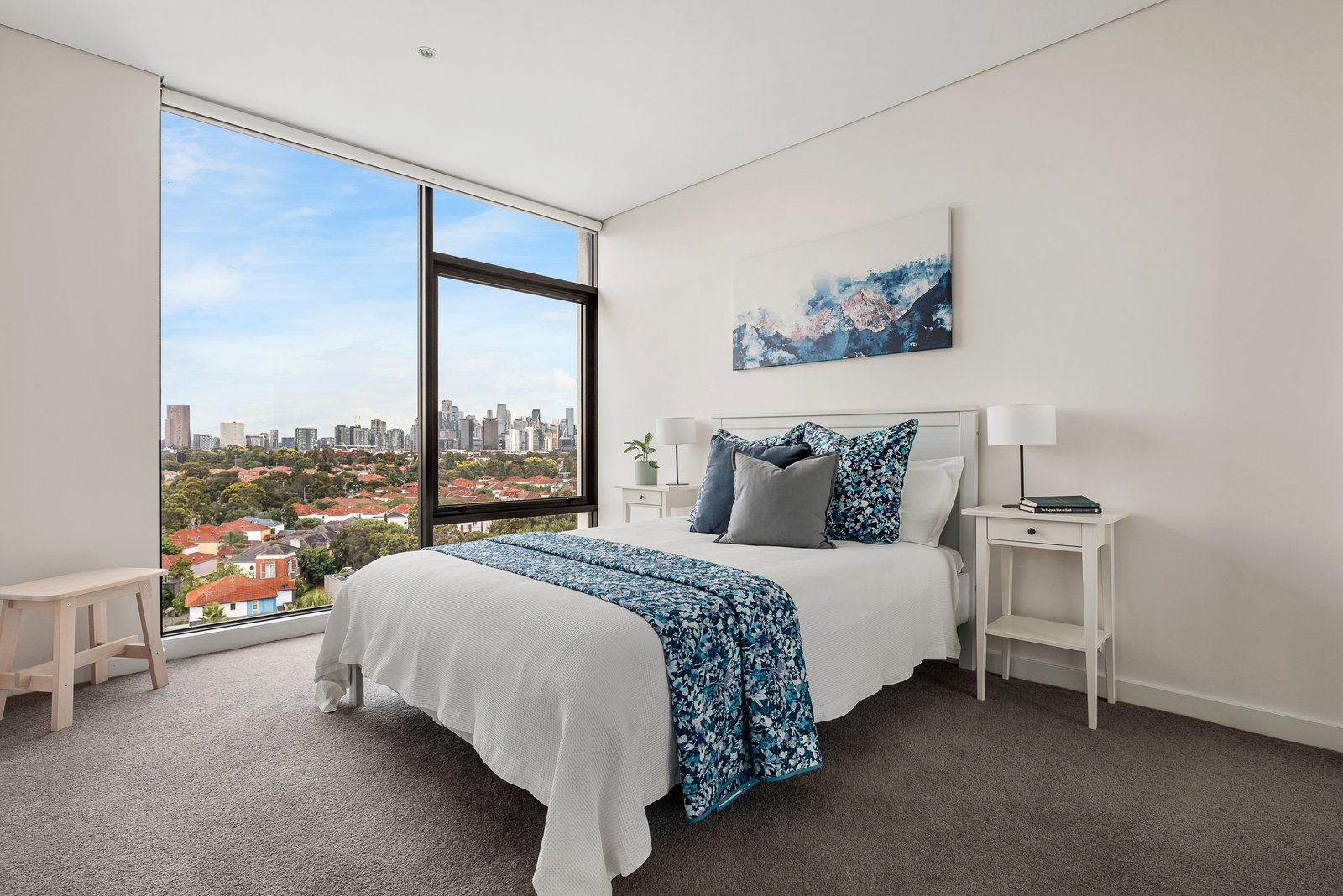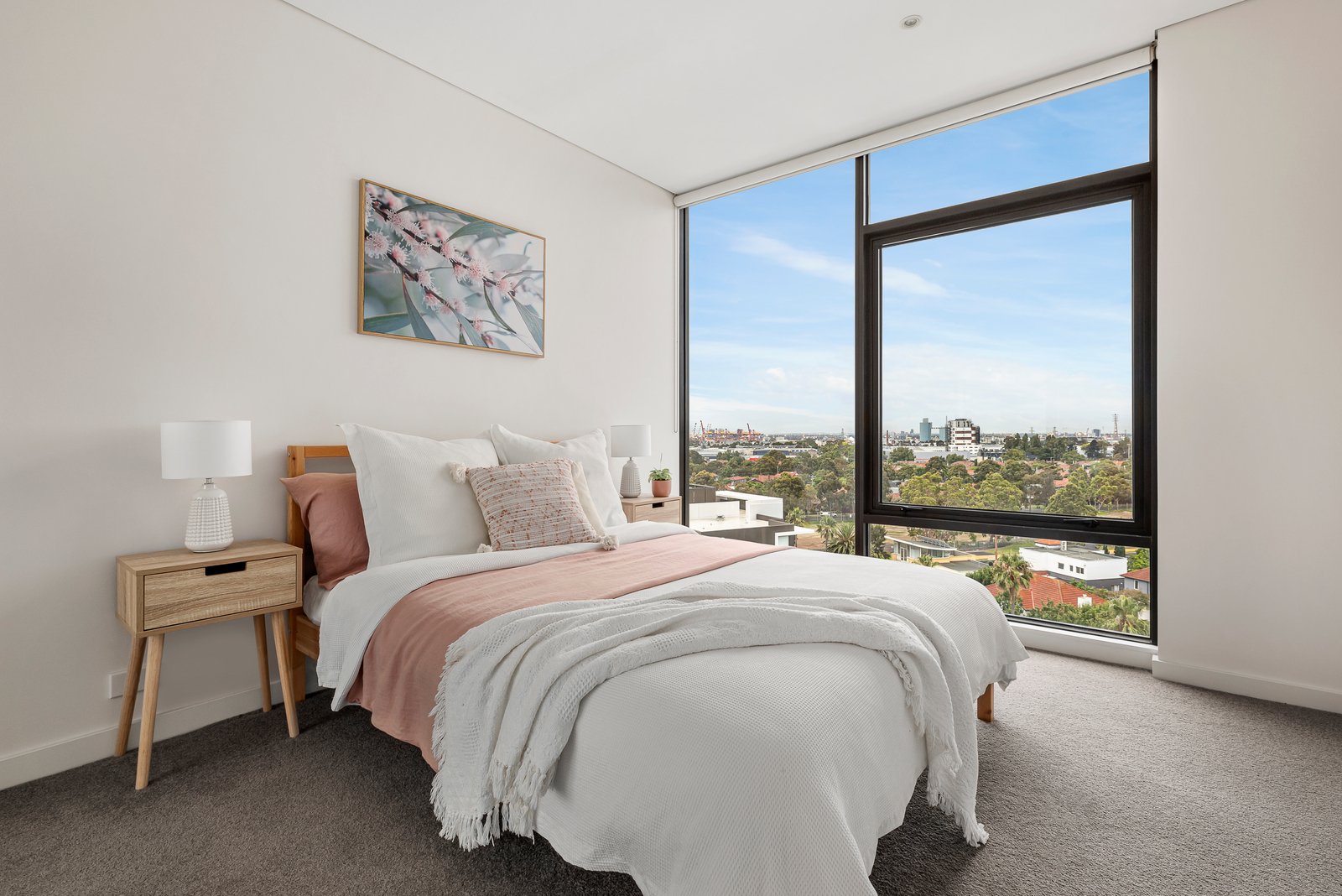 The large main bedroom boasts striking views of the bay and city lights, mirrored built-in storage and a deluxe ensuite with a bath and dual vanity, matched by two additional double bedrooms with built-in robes and a fully tiled family bathroom. The formal sitting room with a city-view terrace is an invaluable versatile space, offering room for a home office or guest suite if needed, whilst a laundry with a second WC is perfect for large-scale living in a low-maintenance setting.