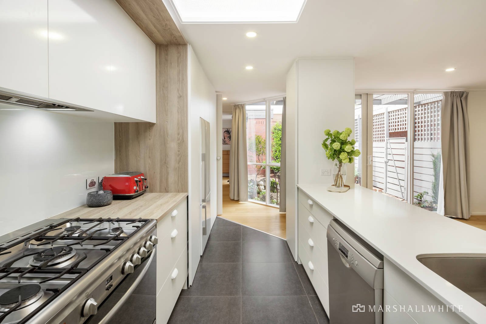 Wide oak floors add contemporary refinement to the entrance hall and generous living room opening to a leafy decked area. The sublime gourmet kitchen appointed with stone benches and European appliances and the light-filled dining room extend out to a central private north-facing paved garden, perfect for al fresco dining. The oak floors continue through the two double bedrooms with built-in robes and a stylish bathroom.