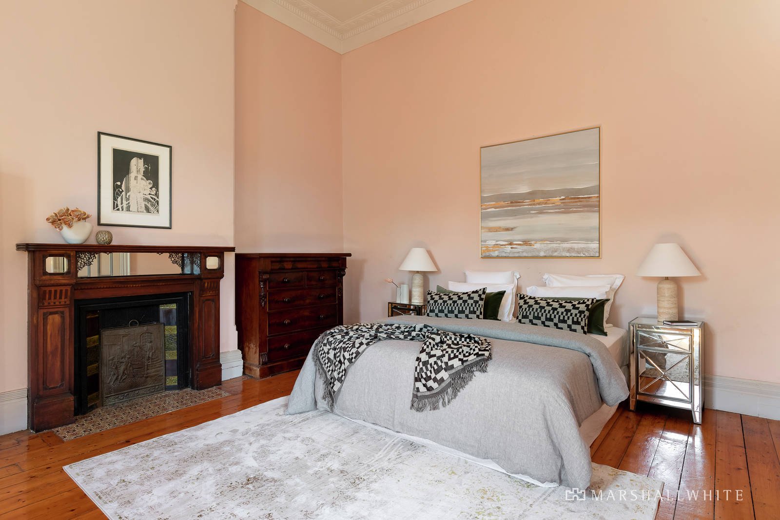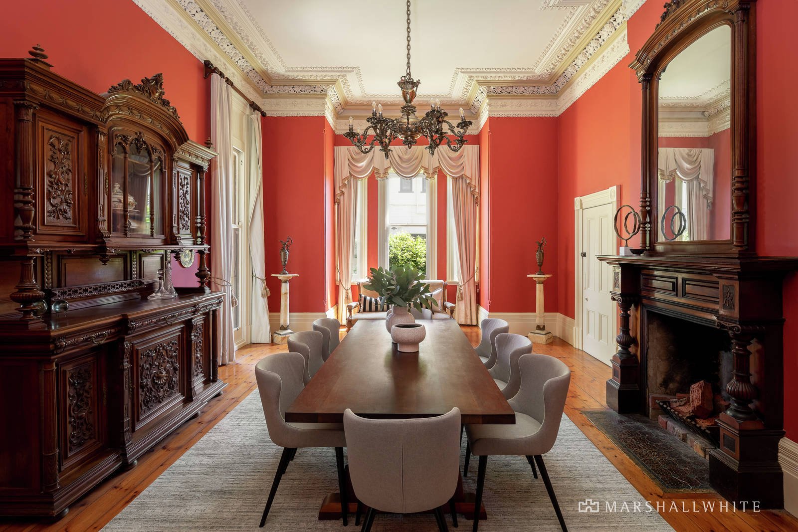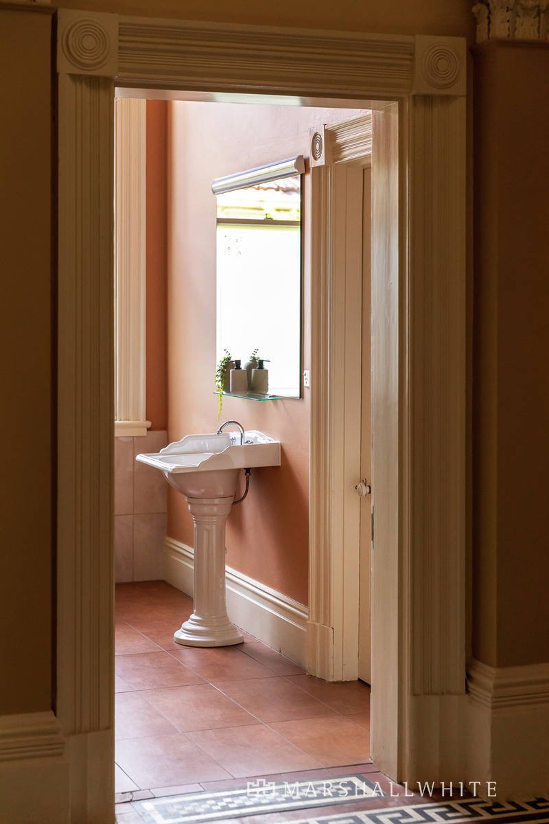The house has undergone extensive improvements whilst retaining the vision of the original owner, architect John Russell Brown. Three bathrooms are updated, there's European appliances in the spacious kitchen, hydronic heating, and remote-control driveway gates. All this sits alongside the grandeur of high-ceilinged rooms with intricate plasterwork cornices, handpainted windows depicting coastal and country scenes, open fireplaces, box bay windows, and Baltic pine floors. Verandas on two levels wrap around the Hawthorn brick exterior, and the north-facing garden has summer shade from a peppercorn tree, flowering perennials, and access to the double garage,