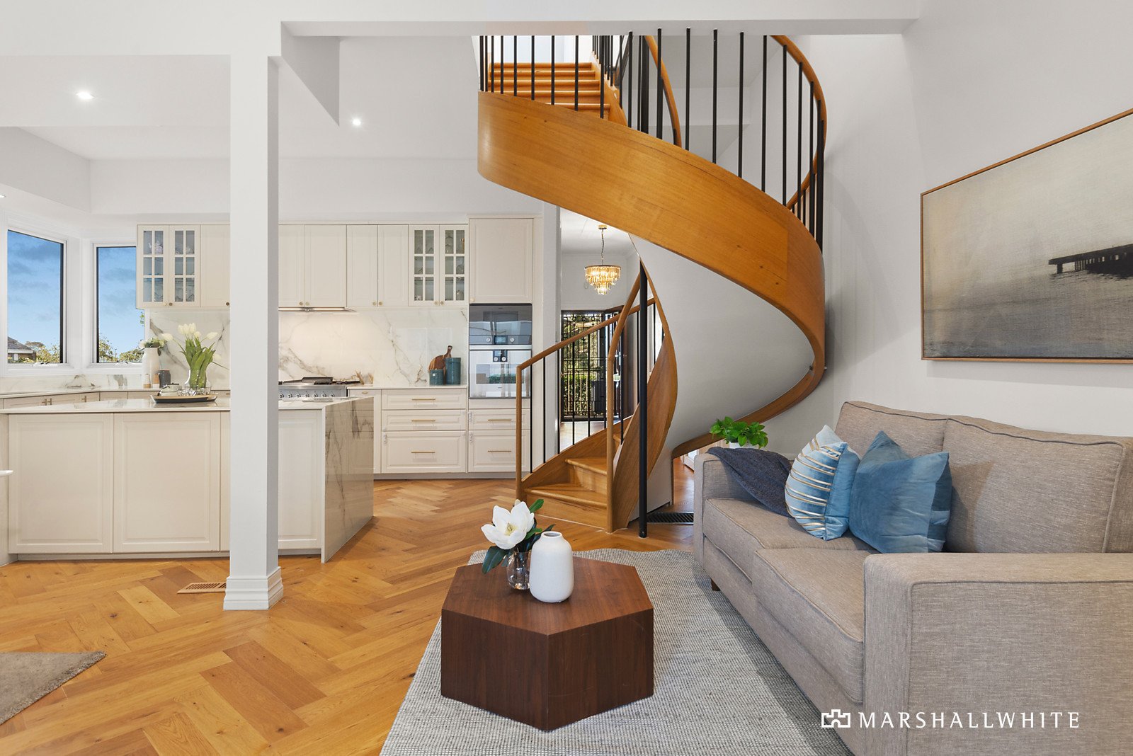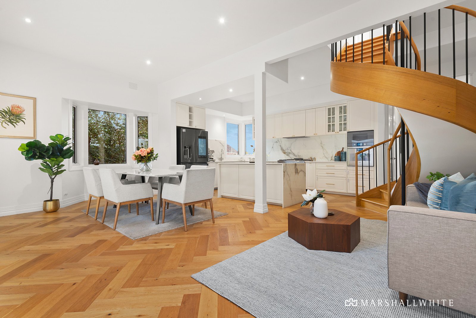Each of the bedrooms is generously scaled and has been completed with built-in robe storage - the main bedroom, notably with its own fully-tiled ensuite - plus there are another two fully-tiled bathrooms and a double lock-up garage that is conveniently accessed via a laneway to the rear. Further highlights of this meticulously curated home include Herringbone style flooring, a custom built showpiece spiral staircase, ducted heating, split system air conditioning, double glazing, security shutters, Zipp sparkling water in the kitchen and ducted vacuum.