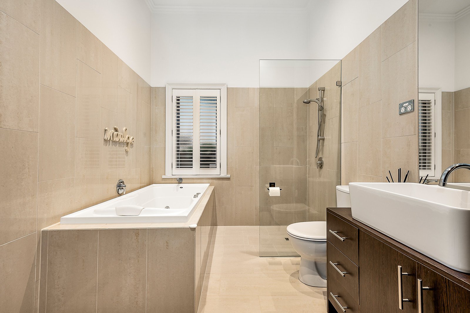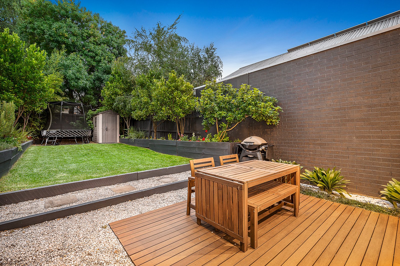 Porcelain tiled floors accentuate the sense of light through the wide entrance hall while vaulted ceilings add to the scale of the generous open plan living and dining room. Appointed with a gourmet Smeg kitchen boasting stone benches, the living area extends out to the deep northwest facing garden, a leafy private oasis with a large deck for al fresco dining. The main bedroom with chic en suite and built in robe complements two additional bedrooms with built in robes and a stylish bathroom with spa bath.