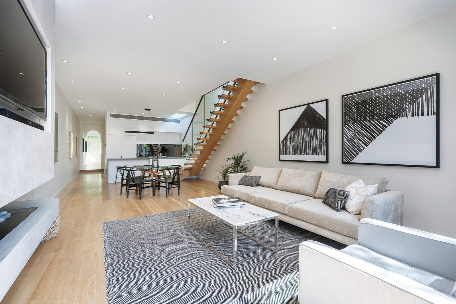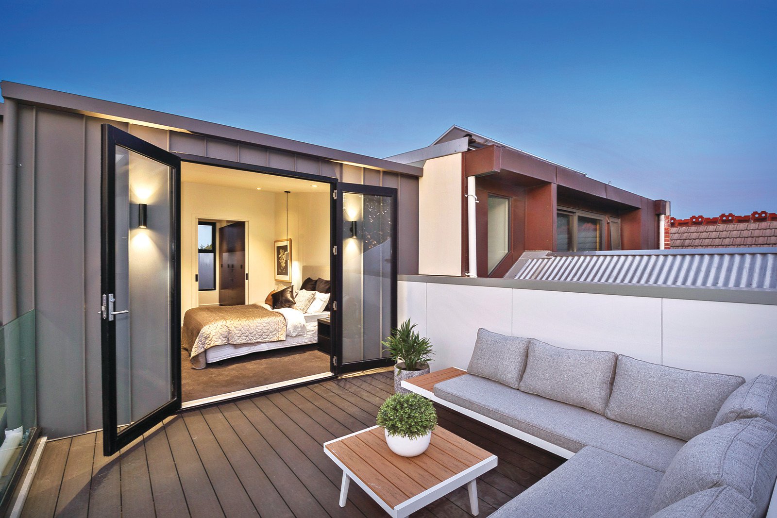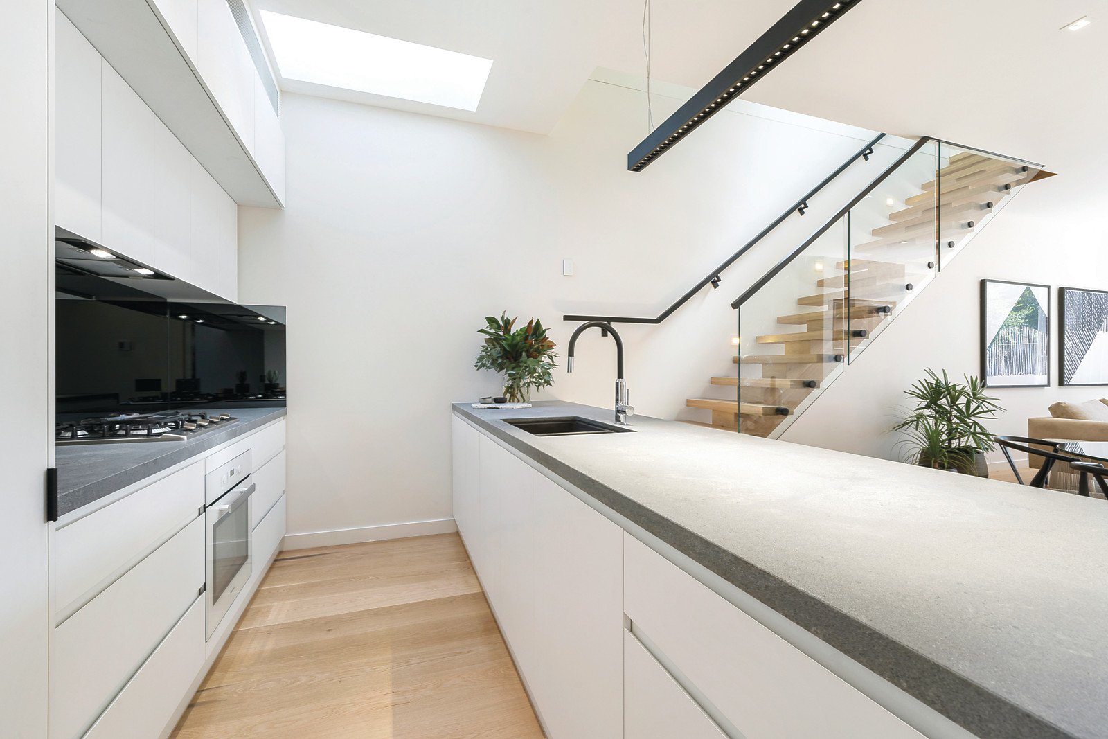 A sky-lit arched hallway featuring high ceilings and wide oak floors immediately impresses, as does the stunning gourmet kitchen boasting stone benches, Miele appliances and an integrated fridge/freezer. Bathed in northern light, the expansive living and dining room with a gas pebble fireplace opens through full width glass sliders to a private north-facing courtyard with rear right of way. A glorious sitting room or 3rd bedroom with open fireplace and window-seat and an equally gorgeous double bedroom with open fire and built in robe are on the ground level along side a stylish designer bathroom. Floating timber stairs lead up to the fabulous large main bedroom with walk though robe, lavish en-suite with a freestanding bath and a sensational private roof top deck offering city views.
