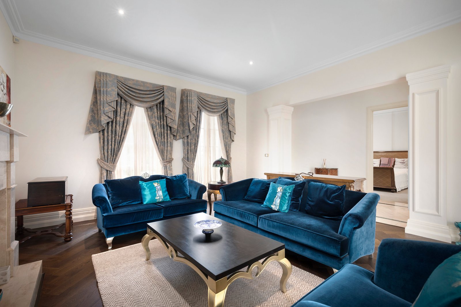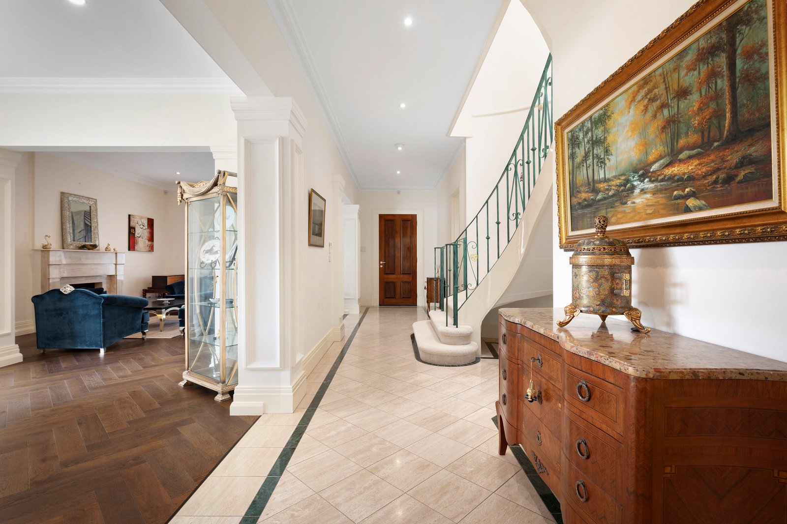 The marble travertine entry foyer reveals soaring ceilings and the sumptuously carpeted curved central staircase with an ornate iron balustrade. The formal living and dining spaces are resplendent with newly laid French Oak herringbone parquetry and complemented by a gas coal fireplace with marble surrounds. The open-plan living/dining space also has a marble gas-coal fireplace and opens to a sunny private courtyard with a gas-plumbed built-in barbecue and sink, perfect for alfresco entertaining. Defined by a central island bench, the gourmet kitchen features sleek 2-pac cabinetry and is equipped with Bosch appliances including a gas cooktop, double ovens and a dishwasher. Presenting a flexible family-friendly floorplan, there is a ground-level bedroom with walk-in robe and ensuite, while upstairs is the grand master suite with an enormous, fitted walk-in-robe/dressing room, and lavish marble ensuite with corner spa bath, double shower, and double stone vanity. Also, upstairs is a landing/retreat with balcony access, the main bathroom with a built-in tub and shower, the third bedroom with built-in robes, and the fourth bedroom which could double as a cinema room or home office.