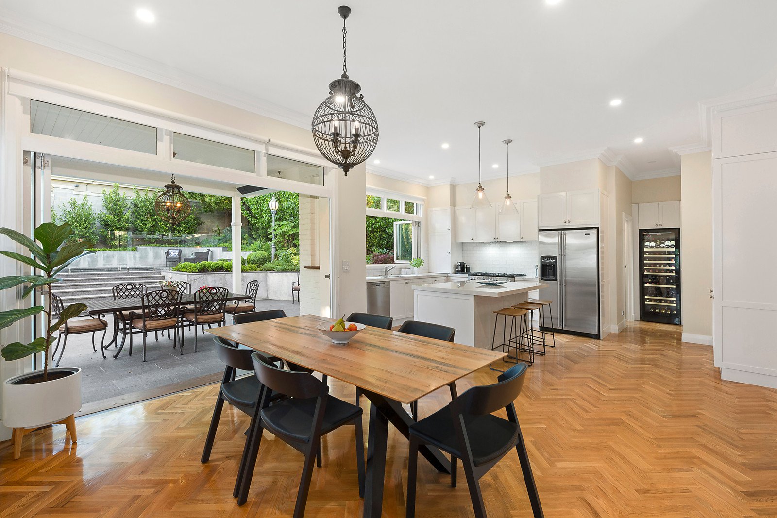 European oak parquetry floors throughout add to the refinement of the entrance hall, beautiful lounge room with open fireplace and window seat, elegant formal dining room, inviting den or study and spacious family living room with Jetmaster gas fireplace. Appointed with Miele appliances, Falcon freestanding double oven, gas cooktop and stone benchtops, the stunning gourmet kitchen and casual dining area open through bi-fold doors and windows to a granite paved al fresco terrace with heaters, gas plumbed BBQ, solar heated saltwater pool and glorious private landscaped garden. A period staircase leads to the generous master bedroom with en suite and three additional double bedrooms all with built-in robes, designer bathroom with claw-foot bath and large terrace offering spectacular views.