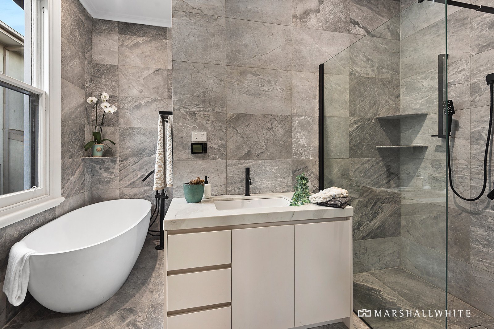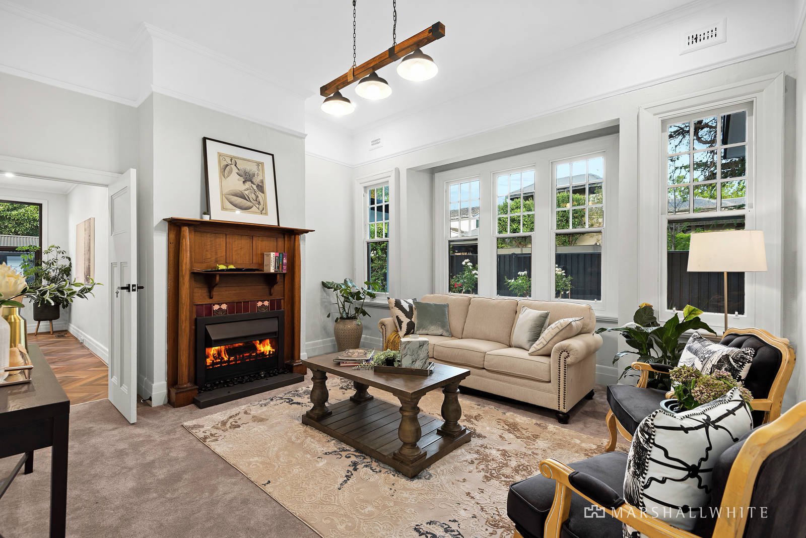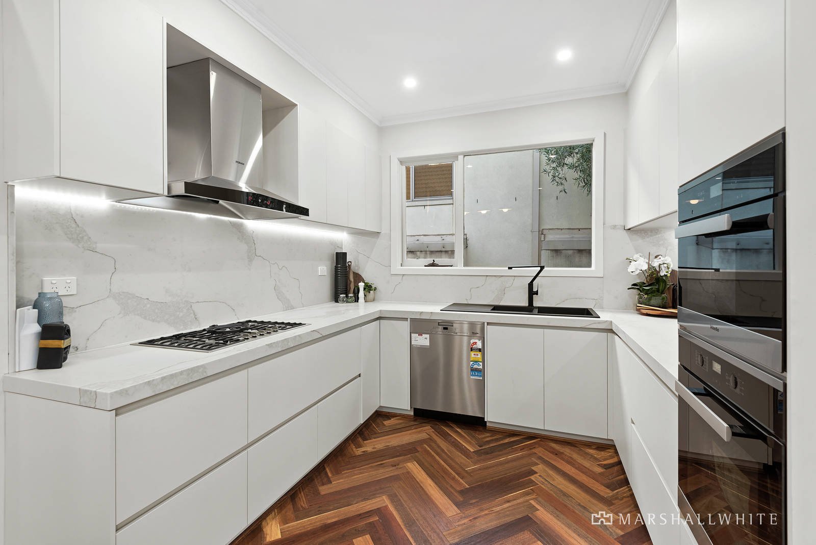 Superbly appointed and finished without compromise, a quality-rich and stone-topped kitchen overlooks the dining, all with attractive Herringbone-style flooring and a full suite of Miele appliances, whilst the lounge room is semi-attached and warmed by an open fireplace.