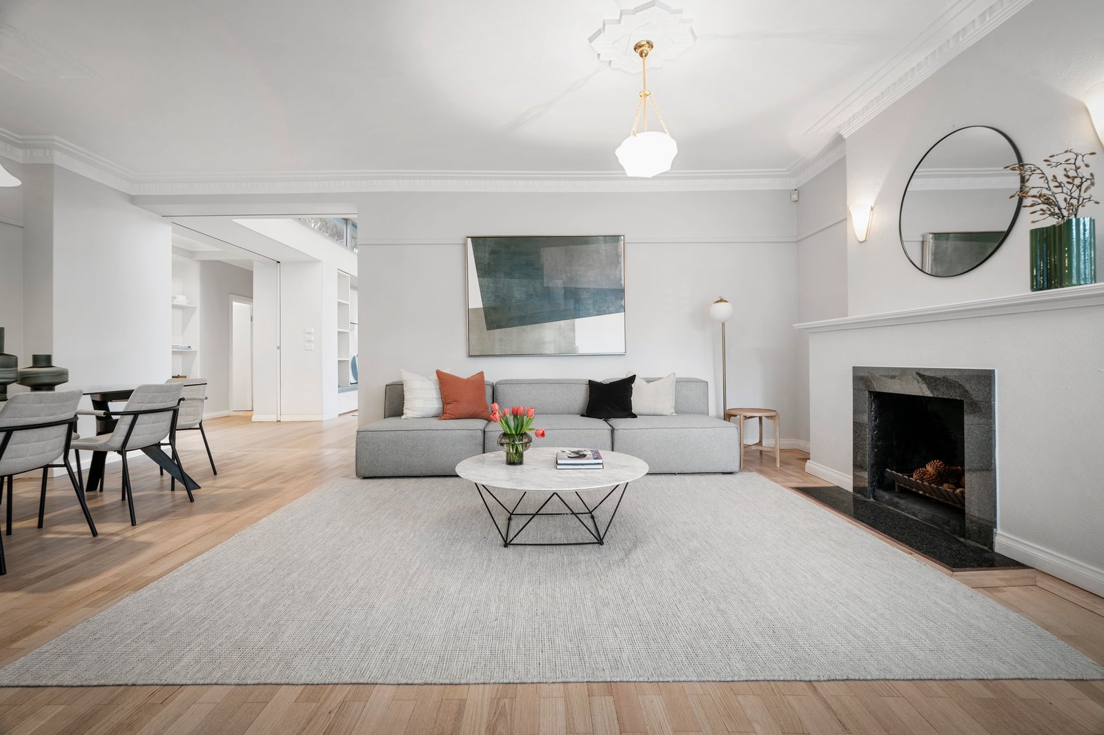 Privately set behind secure gates with intercom entry, the classic circa 1940 façade has been resplendently repainted and rendered. An elevated front patio evokes classic style, further endorsed inside as newly re-surfaced parquetry floors, complete with a star motif inlay, lofty ornate ceilings, and a lushly curved feature wall reveals the home’s late art deco heritage.