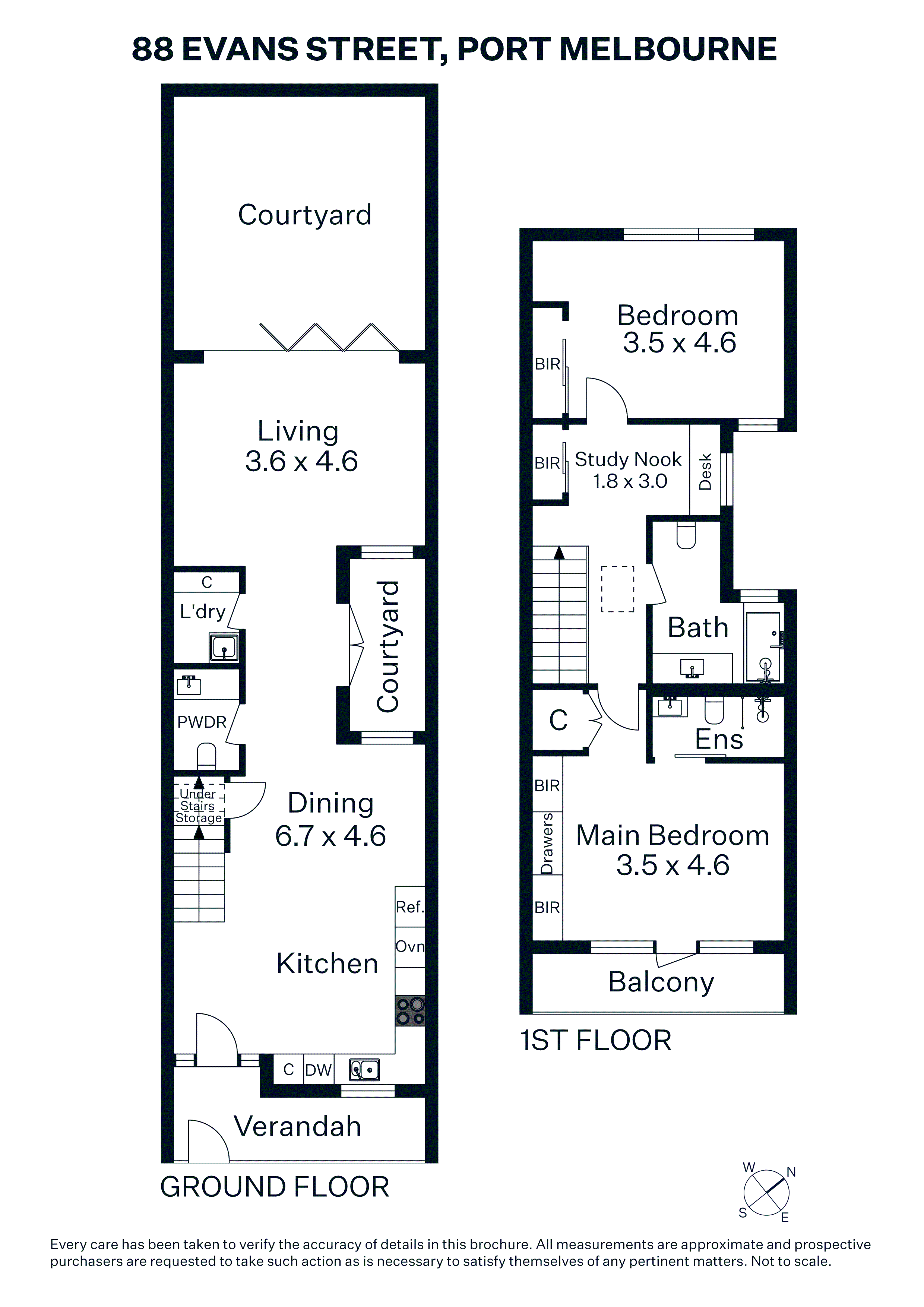 Upstairs, the main bedroom features generous built-in robes, a treetop balcony dressed with plantation shutters, and a sleek en-suite with a walk-in shower and a natural stone vanity. A second bedroom includes built-in storage, while a central study nook and family bathroom with a bath complete the upper level. An exceptional inner-urban base, with the CBD, excellent schools, shopping precincts, and transport all within easy reach, it features double glazing, ducted heating and cooling, a full laundry, a powder room, CCTV, an alarm system, and abundant storage.