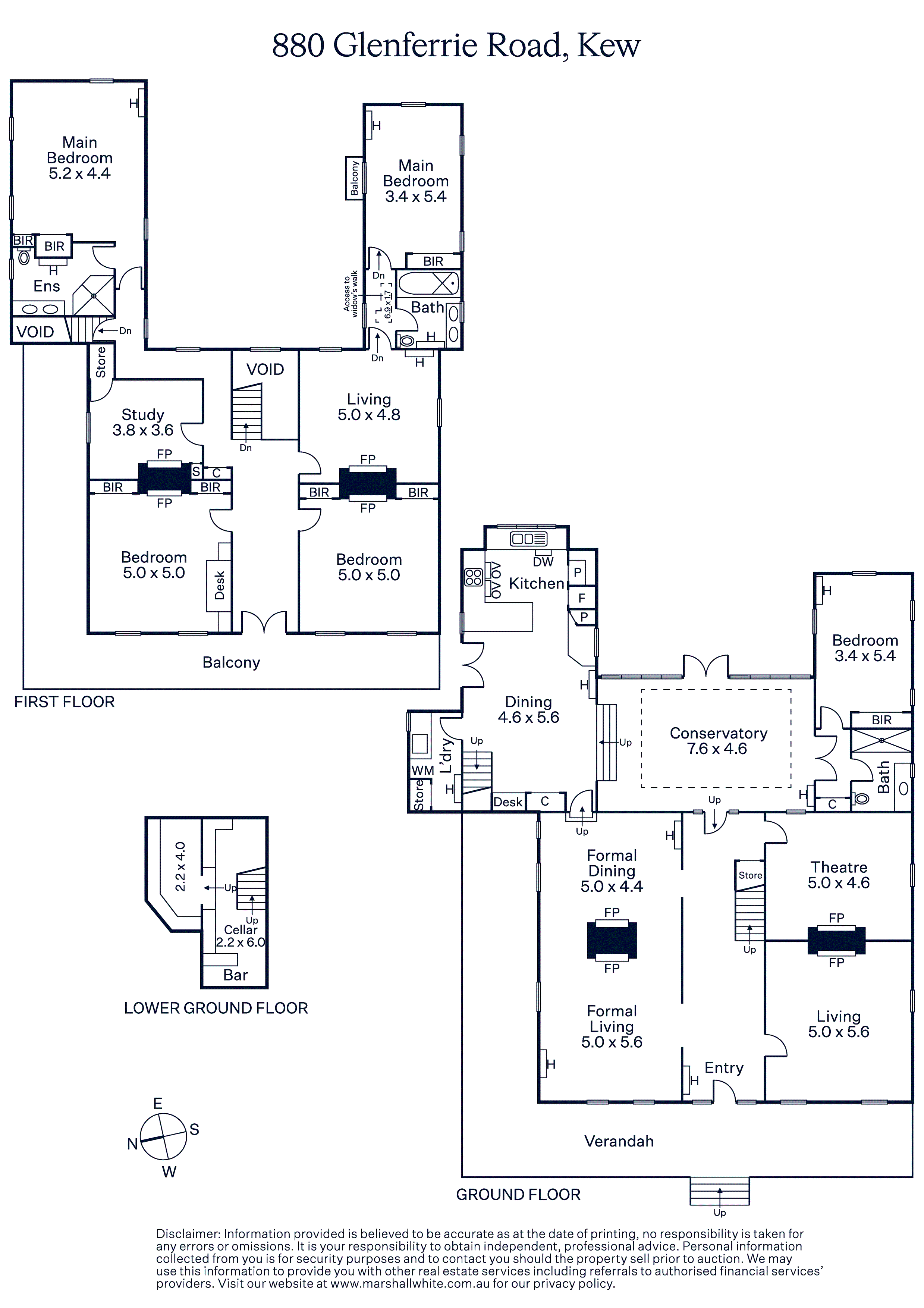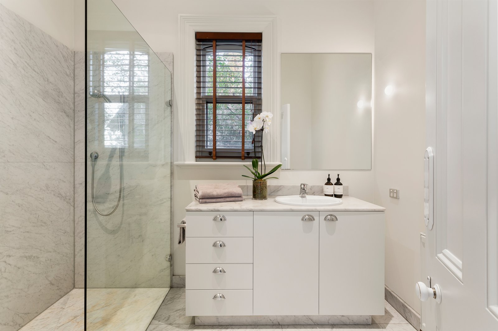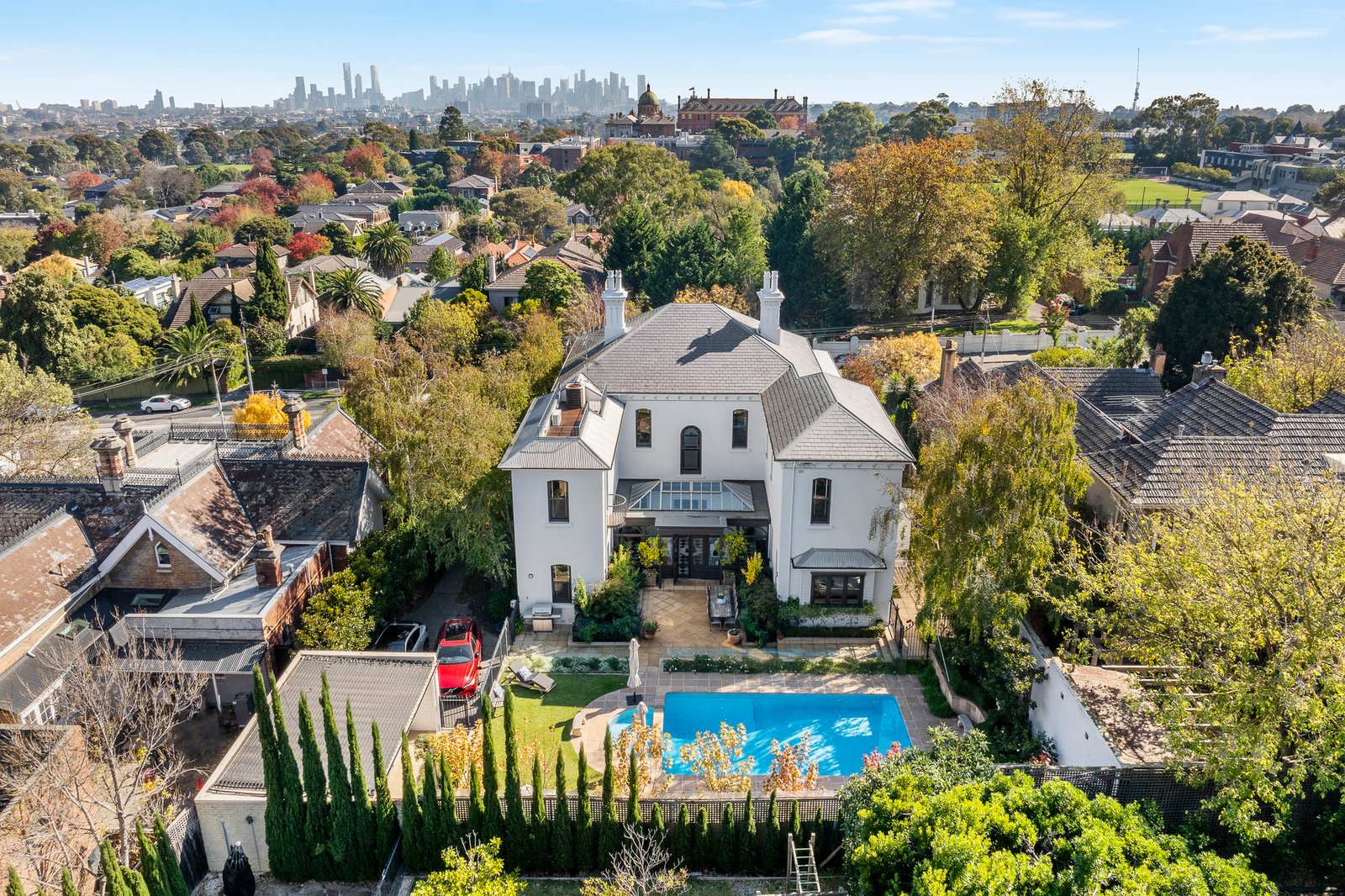Secluded behind a high hedged garden with fountain, a black and white tiled verandah introduces the imposing arched marble entrance hall featuring soaring ceilings and ornate period details. A refined billiards room, gracious sitting room, glorious formal dining room and media room all feature marble mantelpieces with working fireplaces. The casual dining room and gourmet kitchen appointed with Miele/Bosch appliances and marble benches is adjacent to a sensational glass roofed conservatory style living room opening to a large entertaining terrace overlooking the captivating northeast facing private garden with gas/solar heated pool and pool house/gym. An abundance of exceptionally well-proportioned family accommodation comprises a downstairs bedroom with marble bathroom and robe while 2 staircases access the beautiful main bedroom with marble en suite and built in robe, a third bedroom with robe, two additional bedrooms with robes, a family bathroom, a large retreat with gas fire and a home office with marble fireplace. A “widows’ walk” accessed by pull-down ladder offers breathtaking views to the city while on the basement level there is an atmospheric bluestone wine cellar with bar.