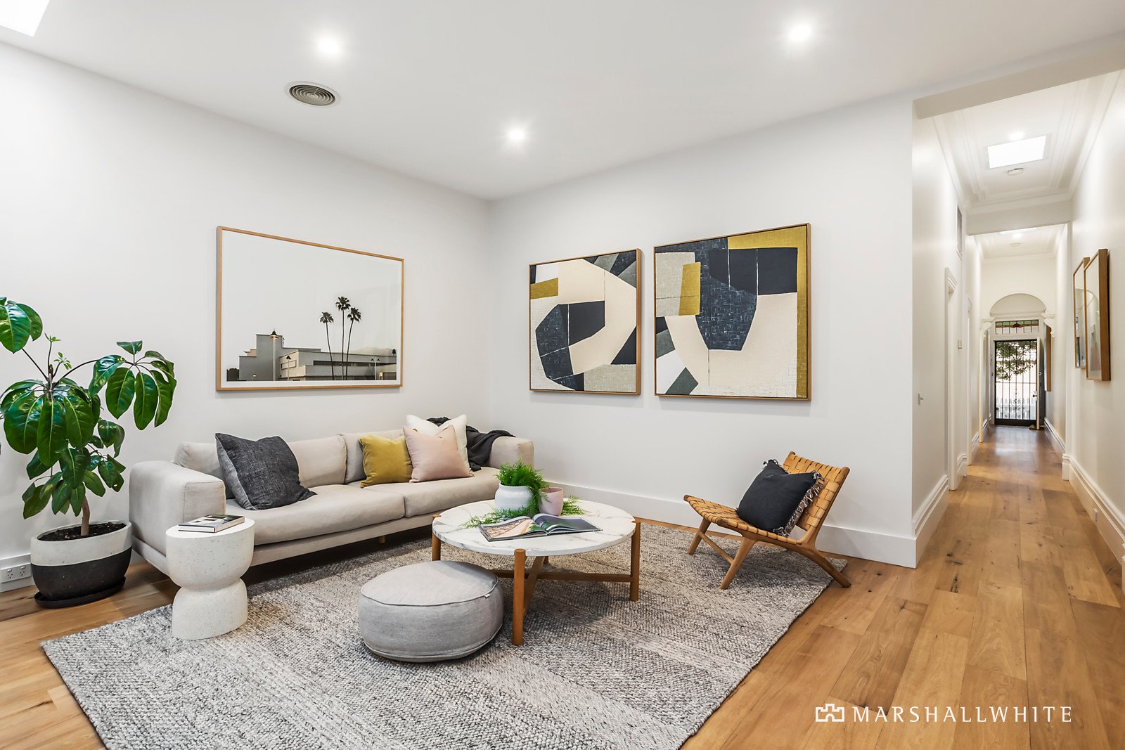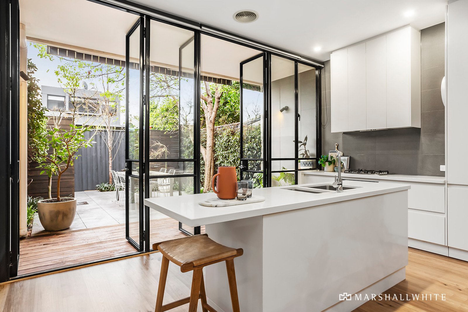 Behind the classic exterior, wide oak floors add a contemporary element to the arched hall which flows through to an expansive open plan living and dining room served by a sleek gourmet kitchen appointed with Miele and Neff appliances and white stone benches. A full width bank of black steel framed windows and doors open the living area to a private northwest-facing courtyard, ideal for al fresco dining beneath a covered deck. The beautiful main bedroom with open fire and built in robes is complemented by two additional bedrooms with robes and a stylish bathroom with bath and laundry.