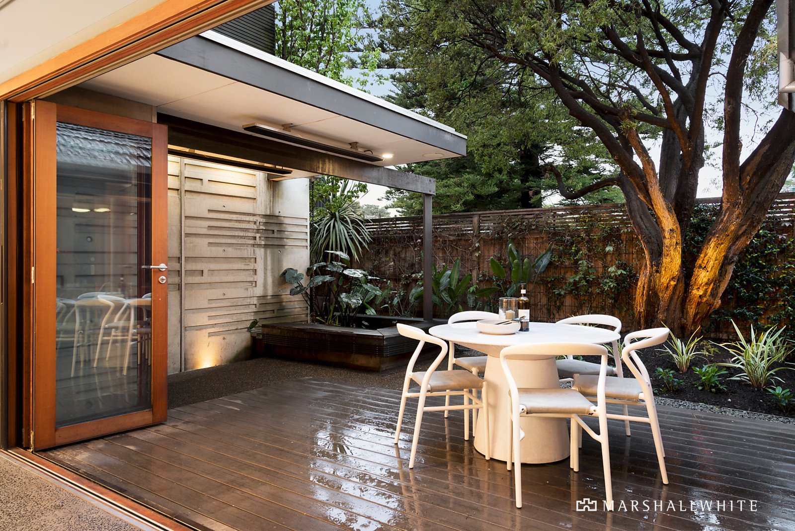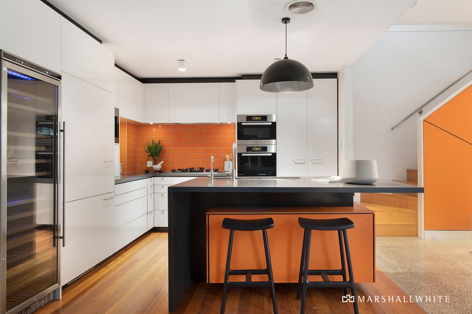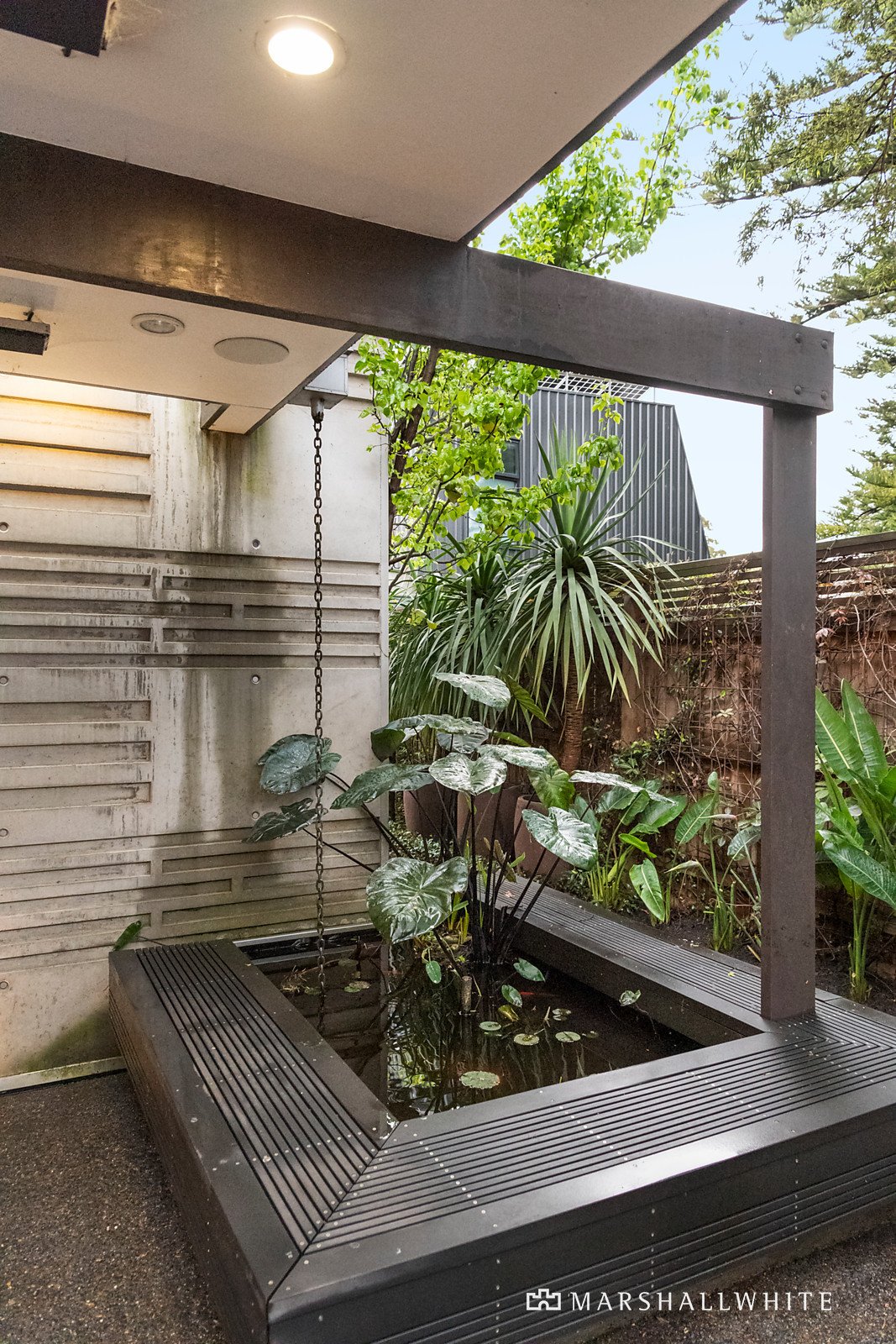 Behind the classic exterior, the breathtaking richly detailed interior spaces showcase custom designed joinery, form concrete feature walls, bespoke finishes and an abundance of timber screens and ceilings. Timber floors flow through the entrance hall to a cosy sitting room with gas fire and a sensational fitted library/home office overlooking the park. The gourmet kitchen with its striking splashes of colour is appointed with Miele appliances including a coffee maker, wine fridge, stone benches and an integrated fridge/freezer. The refined dining area with built in cabinets is adjacent to the expansive living room featuring an elevated ceiling and polished concrete floors. Bi-fold doors allow the living area to merge seamlessly with the beautifully landscaped north-facing garden courtyard, an idyllic and private haven for al fresco dining and relaxing with an undercover terrace, fishpond and outdoor heaters. A downstairs main bedroom with private courtyard, walk in robe and stylish en suite is matched upstairs by an alternative main bedroom with north-facing balcony, walk in robe and chic en suite. Also upstairs there are two additional bedrooms with robes, a third bathroom and private sundeck.