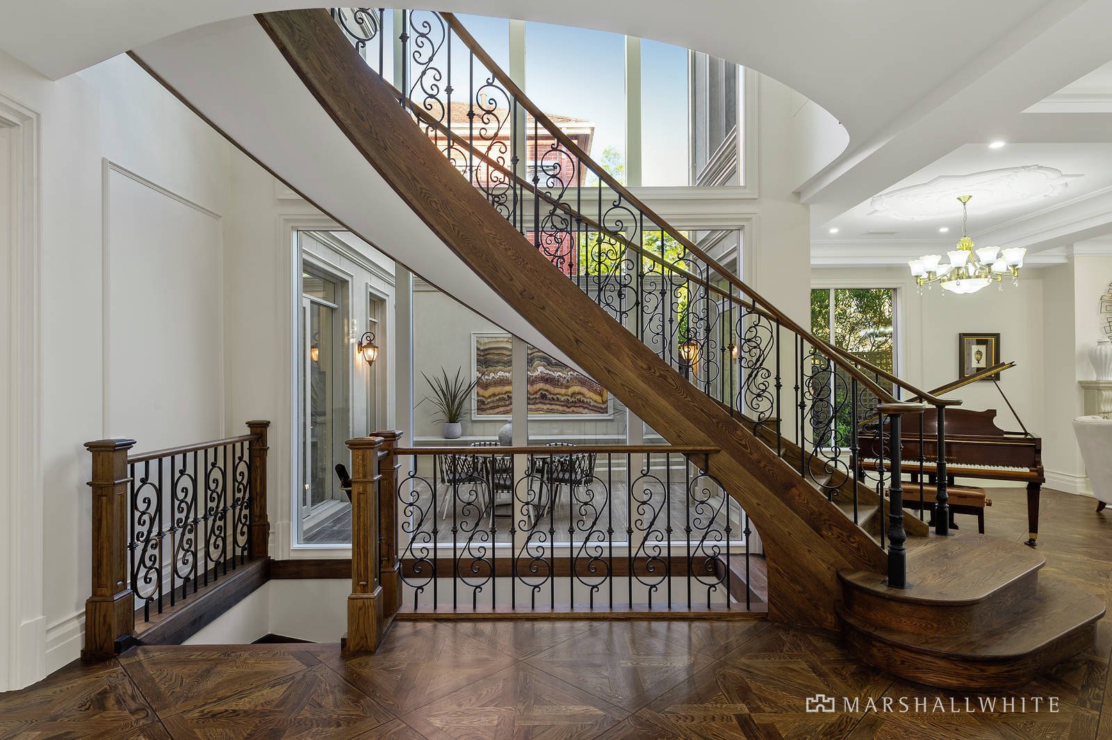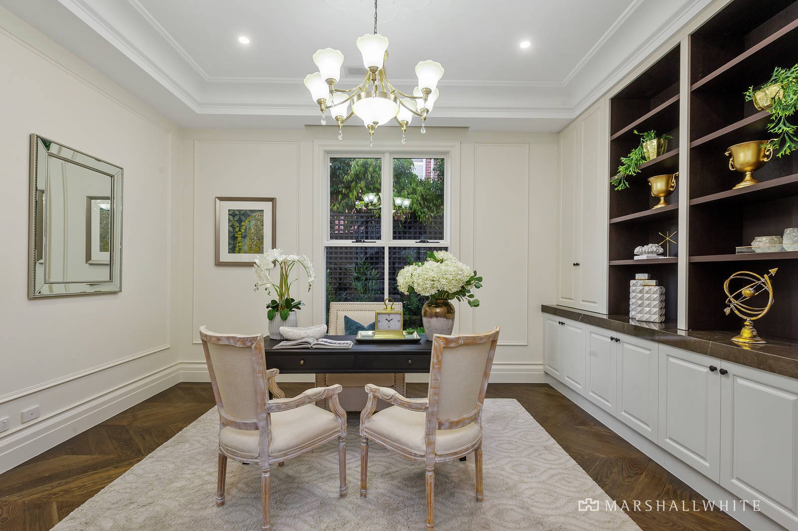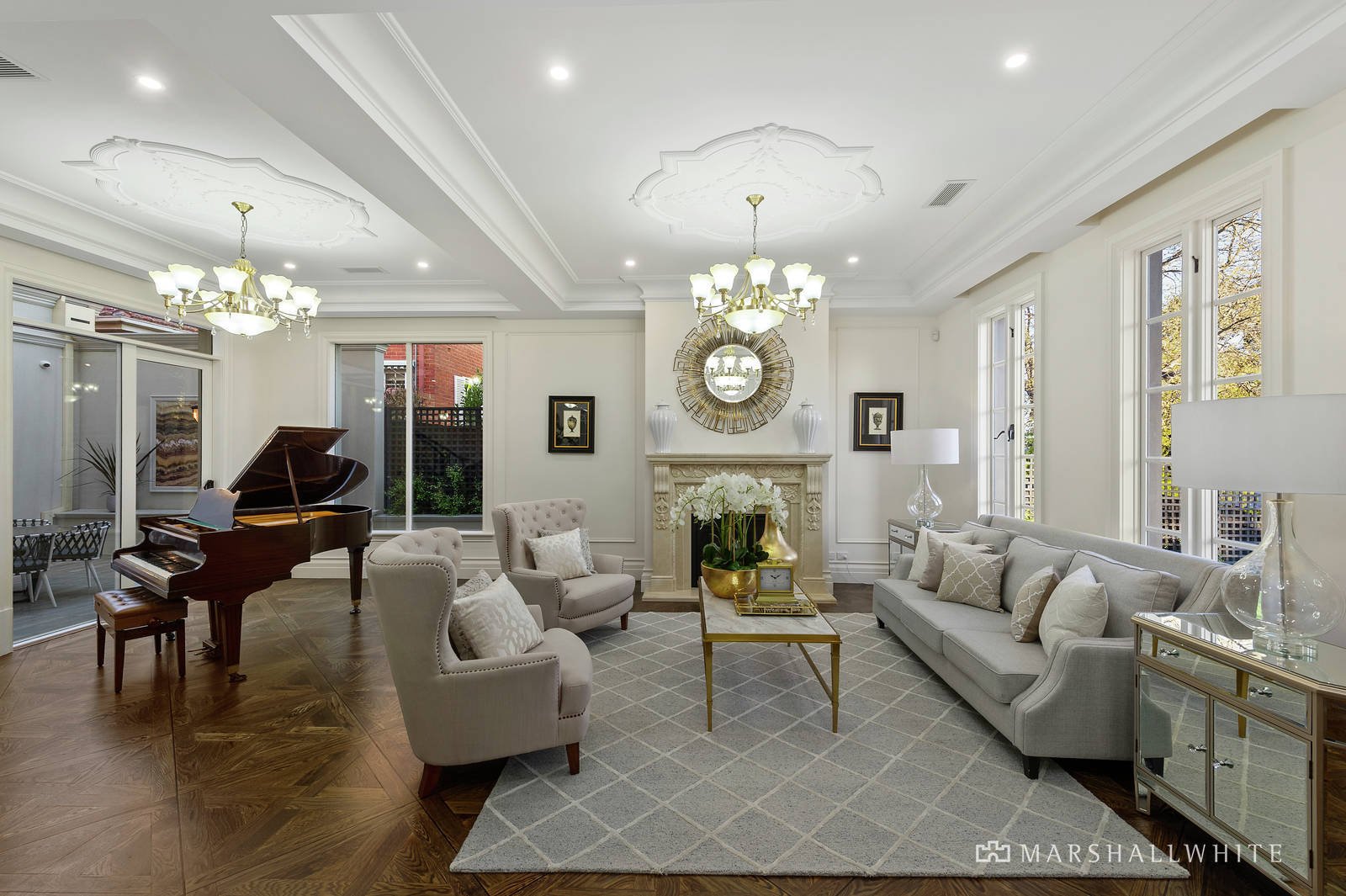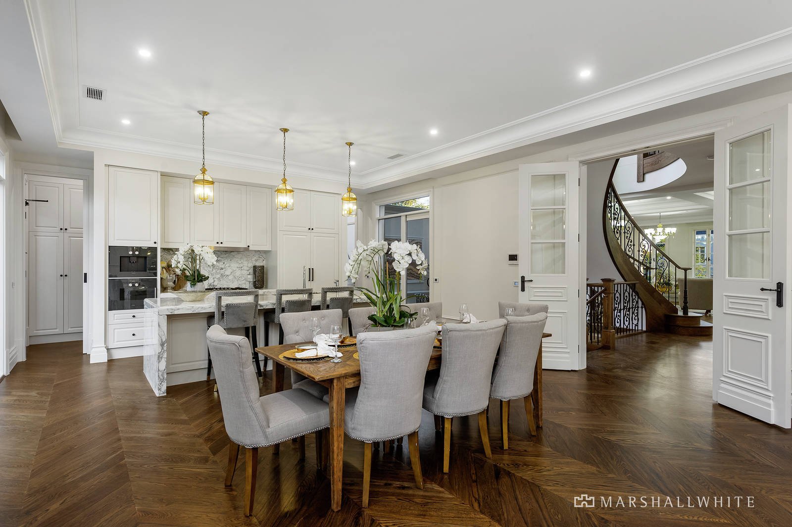 This breathtaking residence features European Oak parquet floors and coffered ceilings with ornate roses, whilst a luminous double-height void sits alongside the sweeping staircase. With a home office/study to one side and a spacious lounge room with a marble gas log fireplace and light-filled alfresco access on the other, this enchanting environment extends through to the north-facing dining and family room.