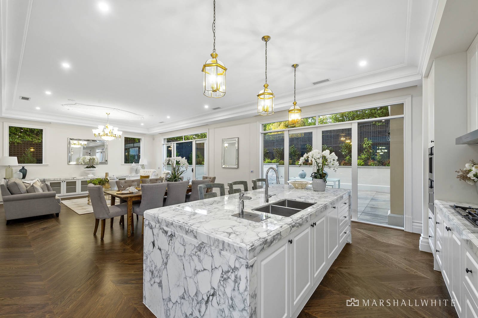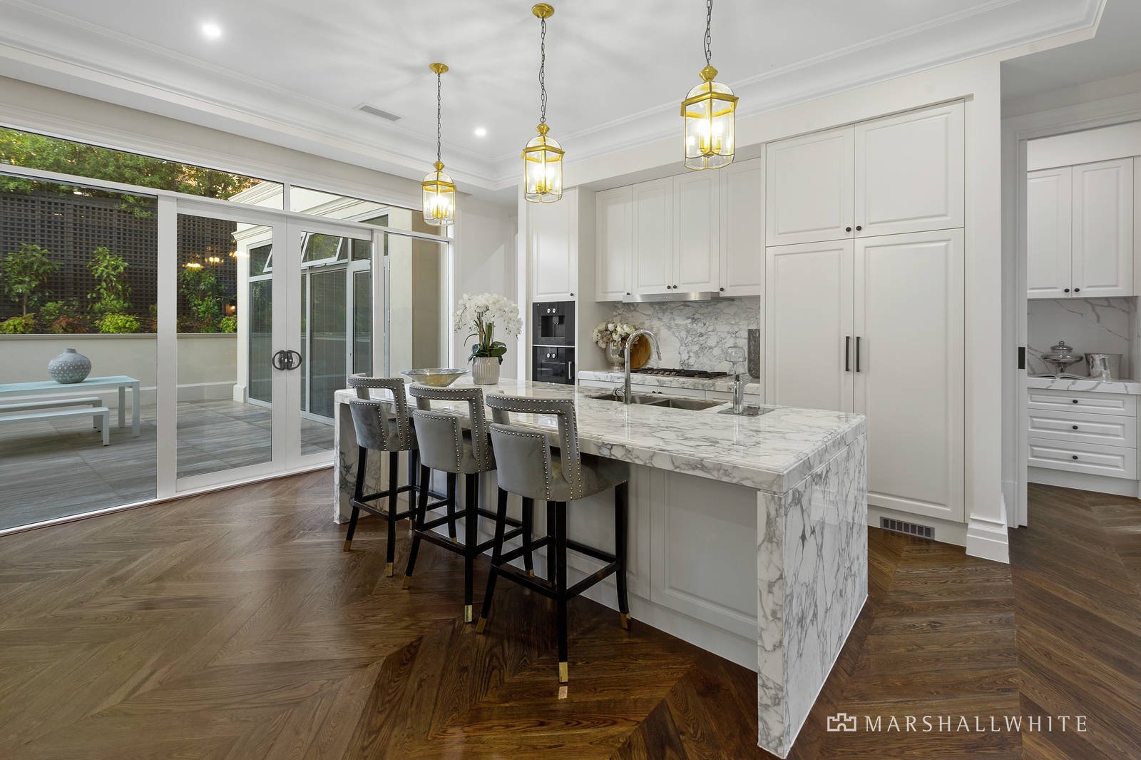 Flowing through the two sets of double sliding doors, the paved outdoor area boasts a trickling water feature and a unique swim-spa room, enclosed for year-round, all-weather relaxation and entertaining. The state-of-the-art Calacatta marble kitchen is equipped with Gaggenau appliances and a Liebherr integrated refrigerator, enhanced with the versatility of a butler's pantry and a second kitchen with ILVE 900mm oven.