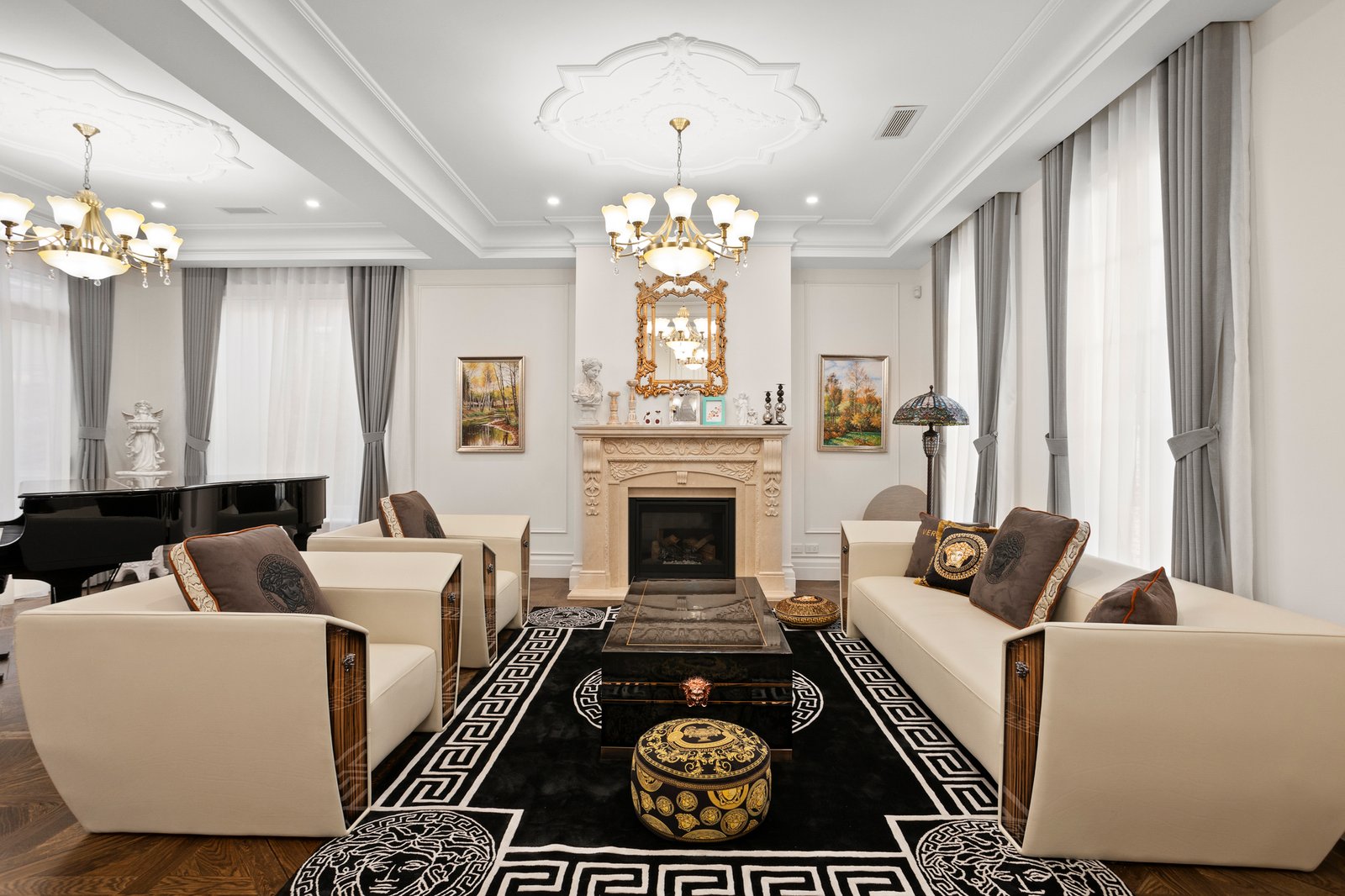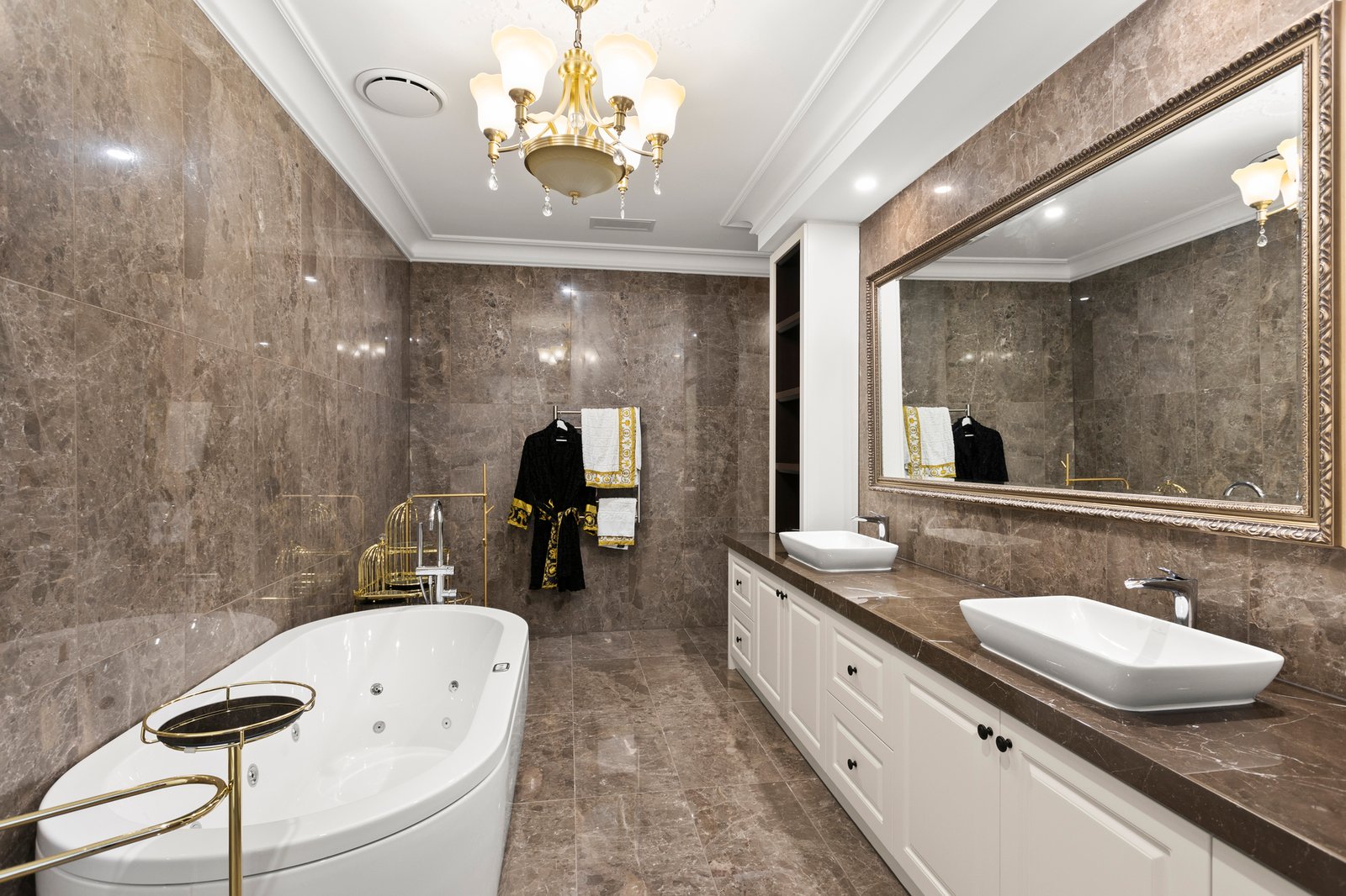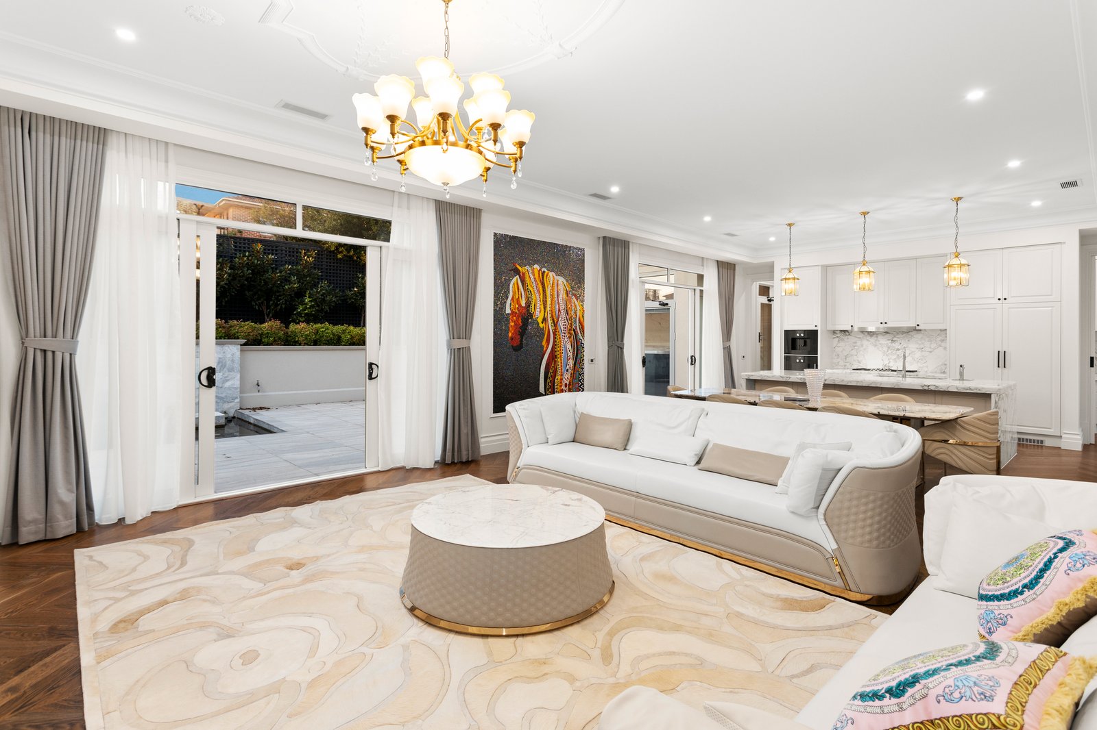 This breathtaking residence features European Oak parquet floors and coffered ceilings with ornate roses, whilst a luminous double-height void sits alongside the sweeping staircase. With a home office/study to one side and a spacious lounge room with a marble gas log fireplace and light-filled alfresco access on the other, this enchanting environment extends through to the north-facing dining and family room.
