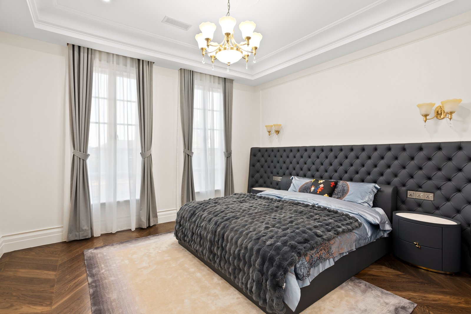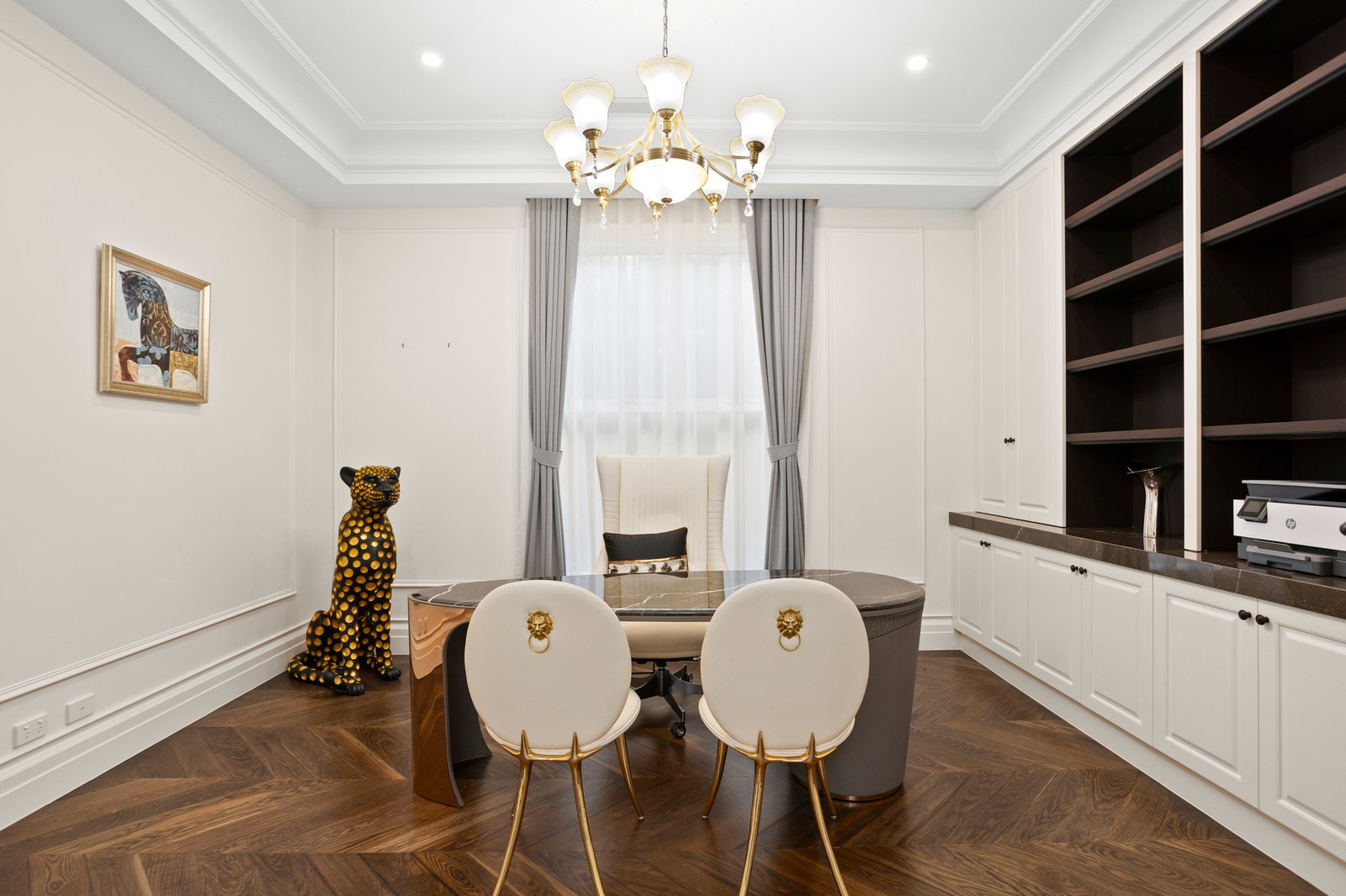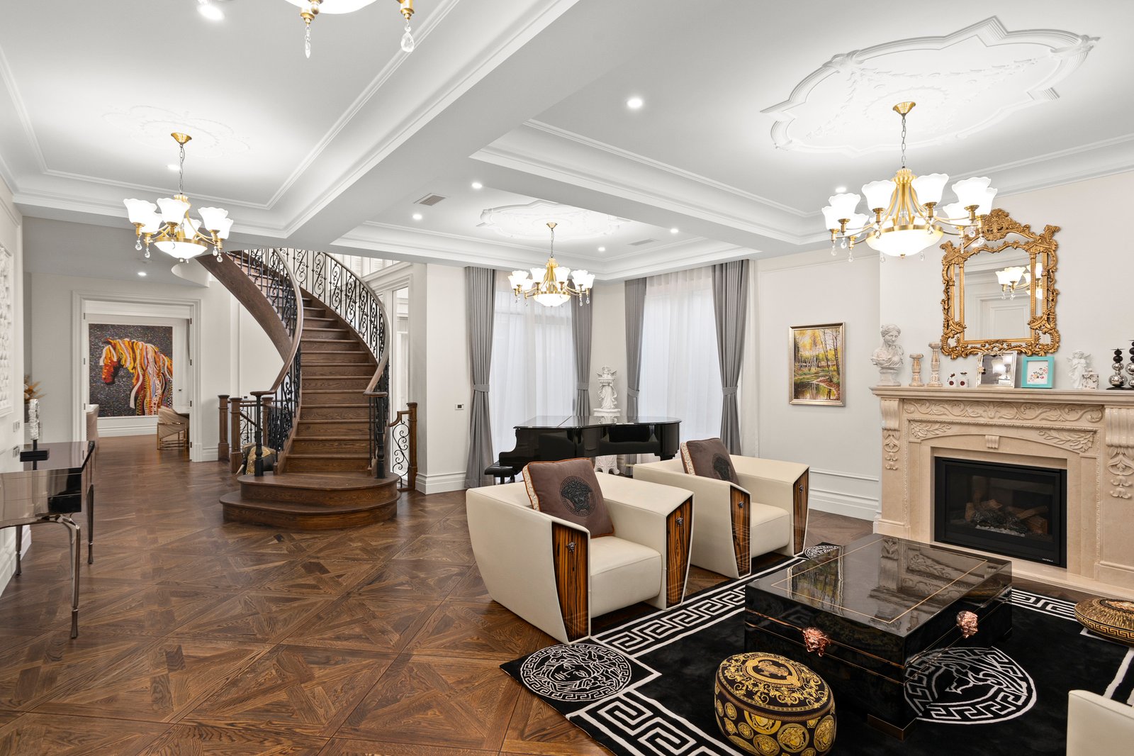 This breathtaking residence features European Oak parquet floors and coffered ceilings with ornate roses, whilst a luminous double-height void sits alongside the sweeping staircase. With a home office/study to one side and a spacious lounge room with a marble gas log fireplace and light-filled alfresco access on the other, this enchanting environment extends through to the north-facing dining and family room.