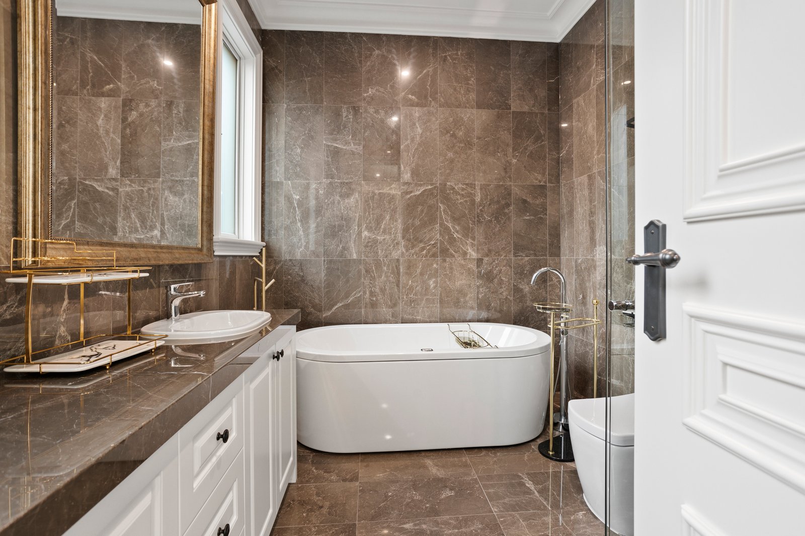 Flowing through the two sets of double sliding doors, the paved outdoor area boasts a trickling water feature and a unique swim-spa room, enclosed for year-round, all-weather relaxation and entertaining. The state-of-the-art Calacatta marble kitchen is equipped with Gaggenau appliances and a Liebherr integrated refrigerator, enhanced with the versatility of a butler's pantry and a second kitchen with ILVE 900mm oven.