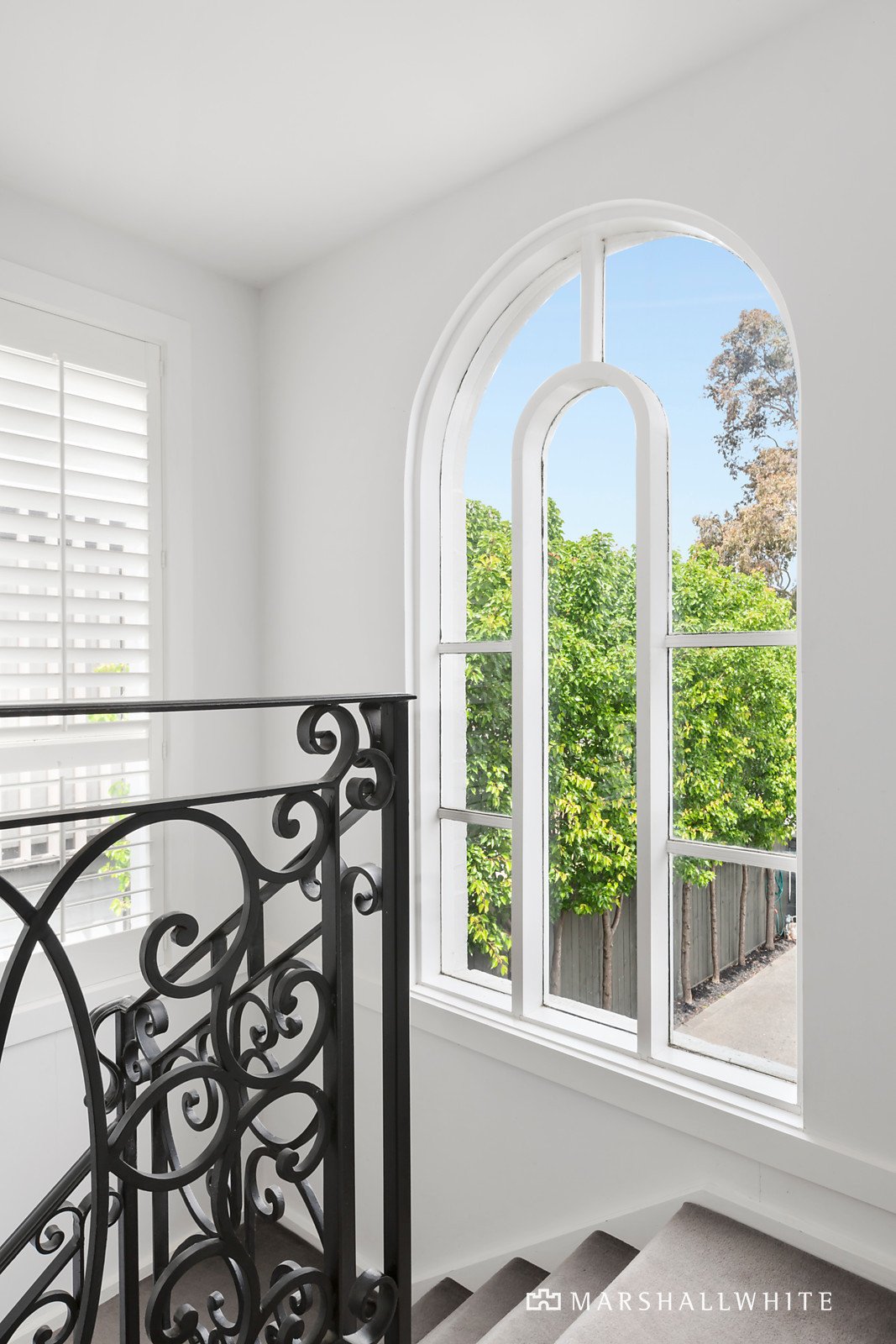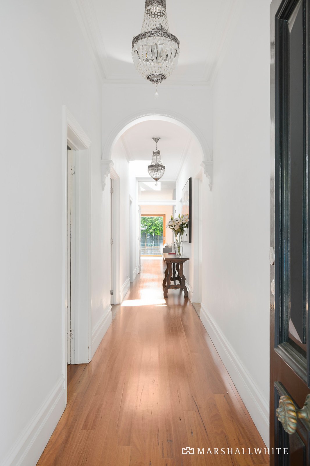 The traditional arched hall with decorative high ceilings & hardwood floors flow through to two generous bedrooms (one with built-in robes) and a second living/third bedroom overlooking leafy surrounds. Period features includes ornate open fireplaces, cornice craftsmanship, elaborate ceiling artistry & superb lead-lighting.