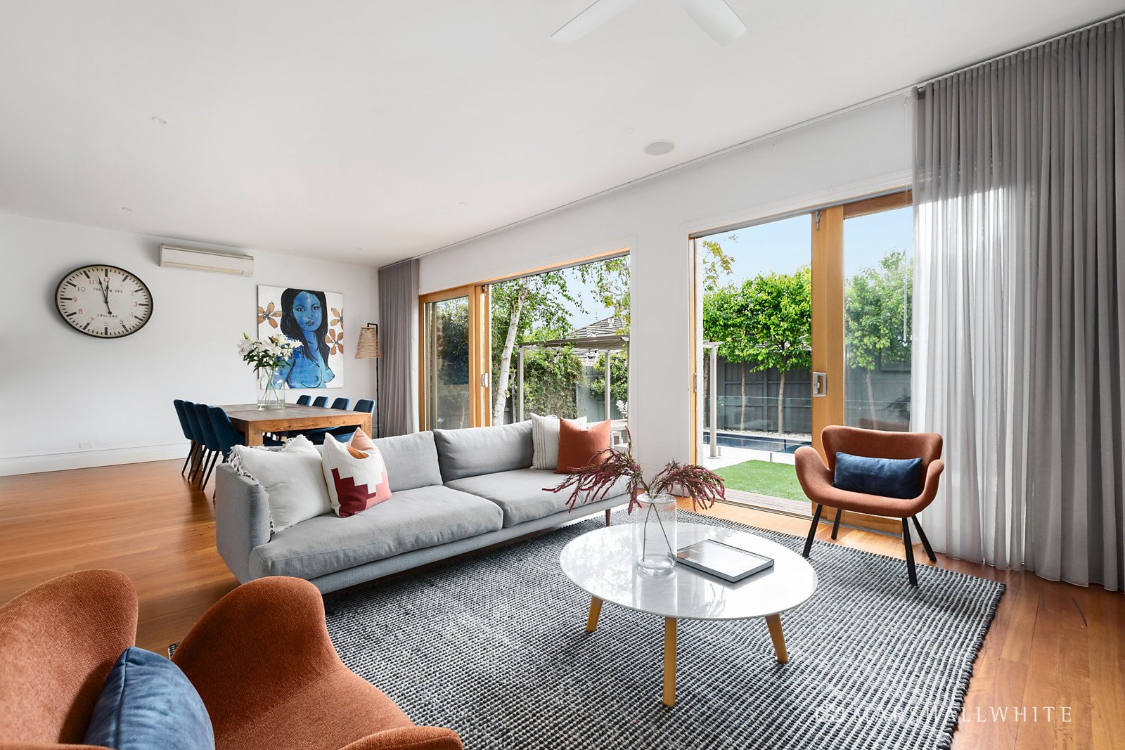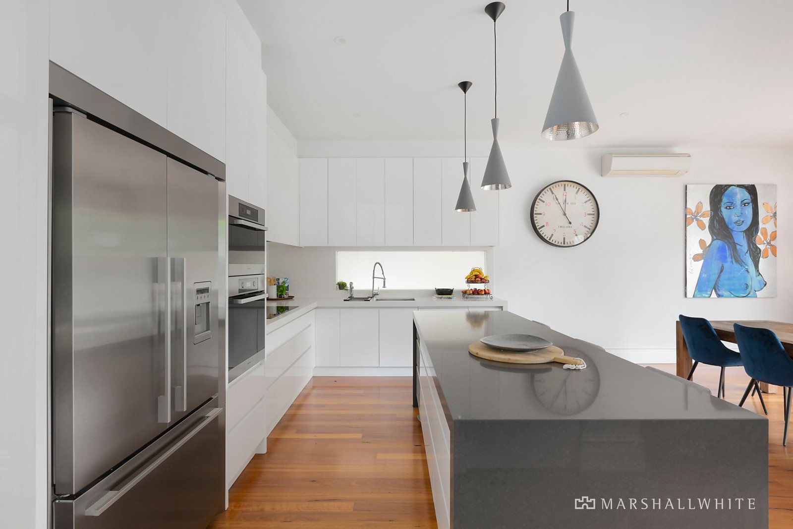 To the rear of the home contemporary design has created a spacious and sunlit open-plan living & dining area, underpinned by a sleek, stone-topped kitchen boasting high-end Miele appliances (including Miele induction cooktop), an inviting island bench, & integrated dishwasher.