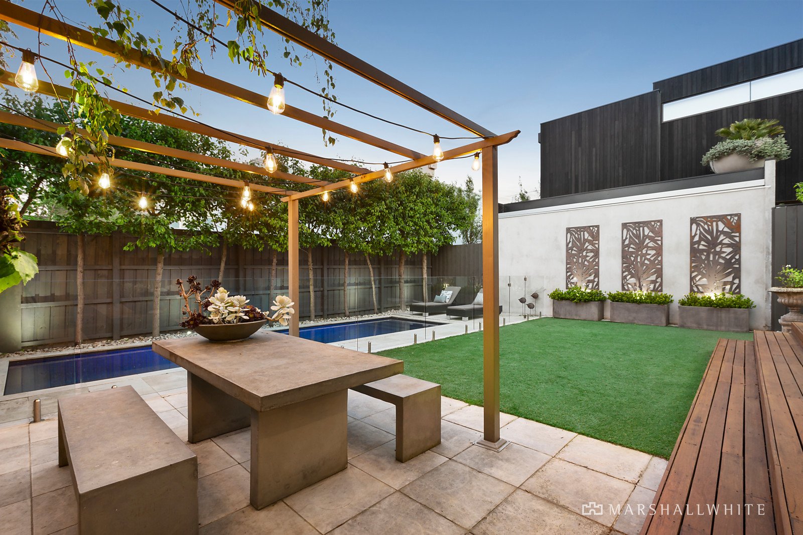 Sliding doors create harmony between the indoors & outdoors. Boasting a delightful alfresco area (with retractable awing), perfect for entertaining all year round, the north facing aspect is enhanced by landscaped gardens and a solar heated, fully tiled pool.
