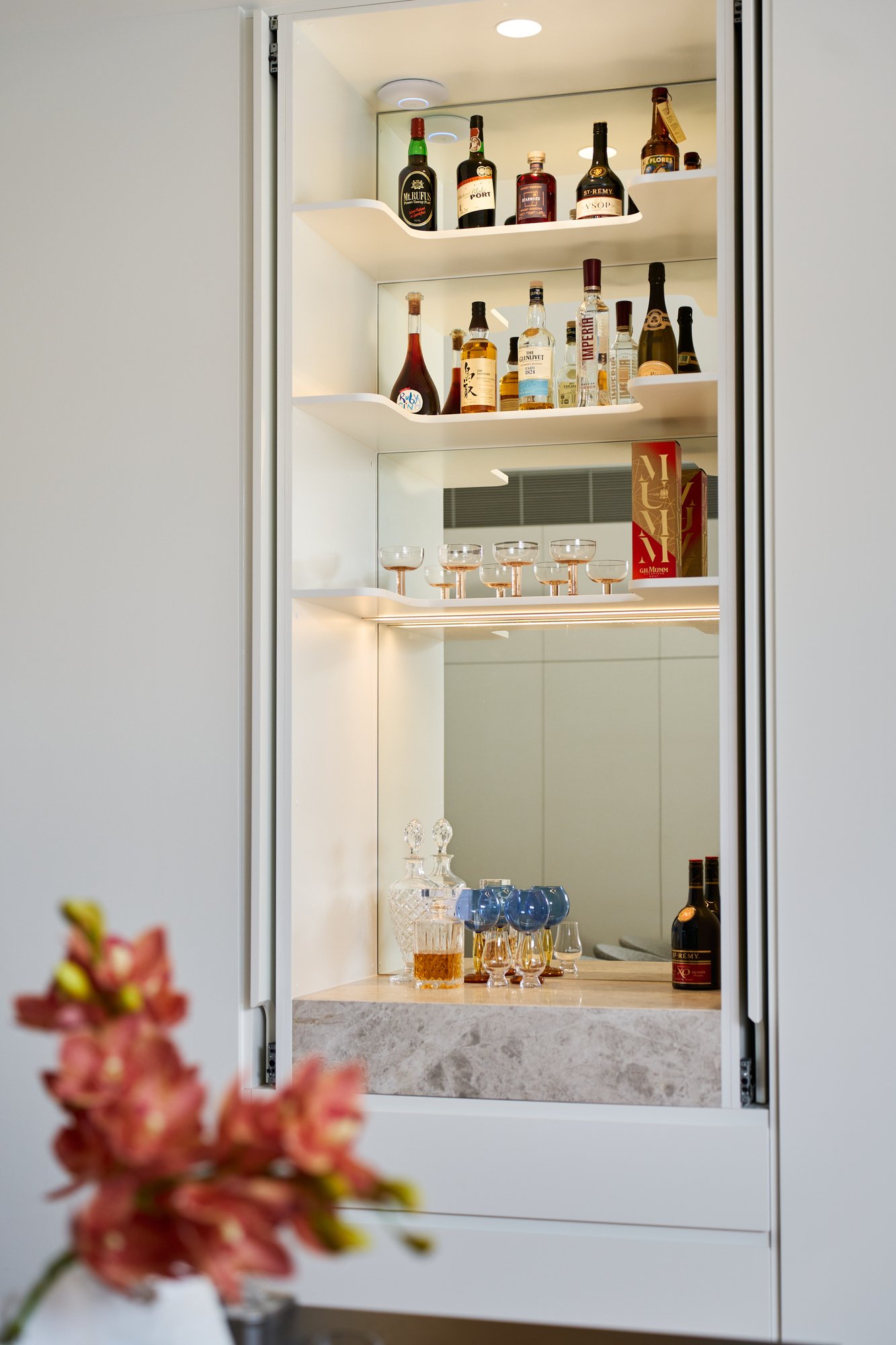 A masterful collaboration between Ben & Ben Architecture and Synergy Construction, the striking lift-connected multi-level home will impress with its abundantly glazed, hand-finished sealed-render façade, and bespoke accents including a cantilevered entry ledge and a rain chain paying homage to Beaumaris’ unique design heritage. An oversized pivot hinged custom front door opens to reveal the soaring dimensions, and French oak flooring introduces the uncompromised materials palette incorporating Signorino ‘Turko Argento’ limestone benchtops, Italian porcelain and hand-made Japanese tiling, timber-veneer and 2-Pac custom joinery, and extravagantly under-laid pure wool loop pile carpeting. Edged with floor-to-ceiling double glazing, the main living area has a gas log fire heater and invites impressive entertaining with a custom bar, while the gourmet kitchen is equipped with a top-of-range appliances including Miele gas cooktop, Qasair rangehood, double NEFF ovens, a Liebherr integrated fridge/freezer and walk-in preparation pantry. Designed for zoned family functionality, the highly considered and adaptable floorplan incorporates the main bedroom with luxe shower ensuite and an elevated executive home office on the main level along with a luxe powder room and the main living zone. The upper level features another three bedrooms, one with a shower ensuite, and the main bathroom with free-standing tub, plus another spacious living/rumpus room with bespoke joinery, while there is another bedroom, (or media room or gym/studio) on the lower level along with a bathroom with shower, and the laundry with chute, plus the custom 280-bottle glass-fronted wine cellar and access to the glass-walled showroom/garage. The steel-constructed oak custom staircase extends to the rooftop deck, where the incredible views across the Bay and the perfect spot to enjoy sea breezes and sunset sips.