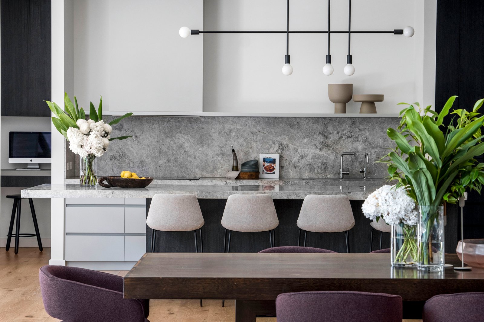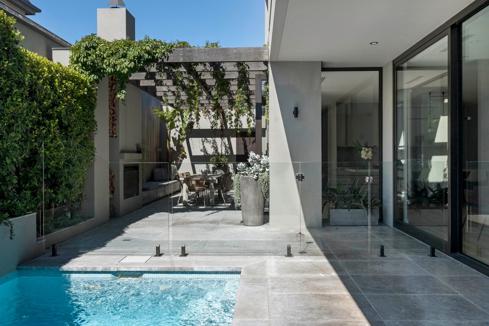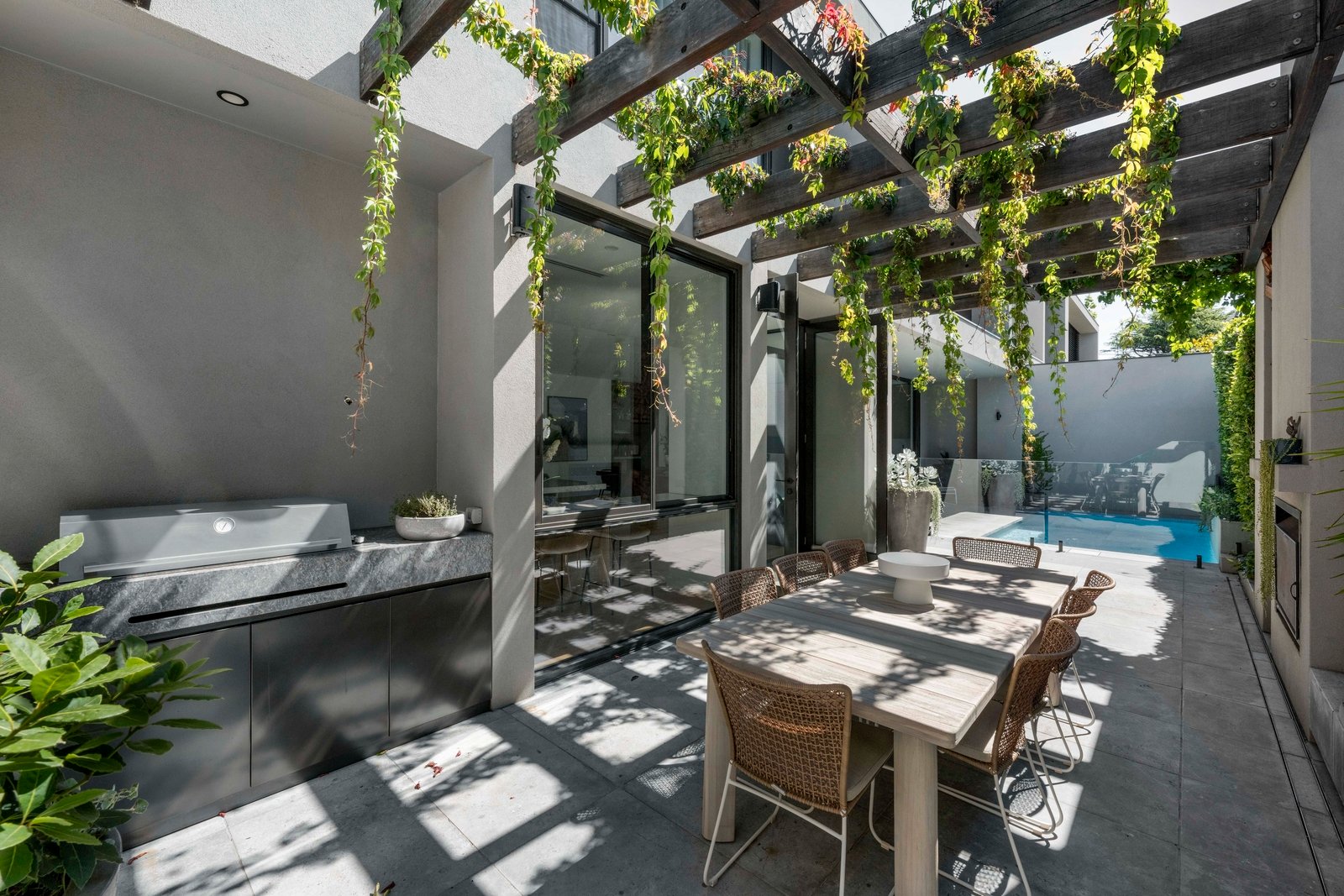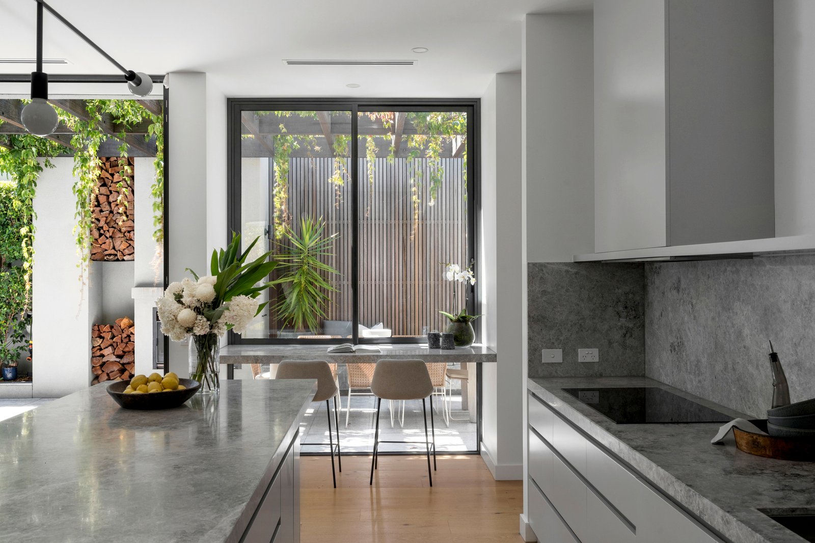 Conceived and crafted without compromise, the 3 metre ceilings, full height windows and doors, oak floors and Tundra marble finishes highlight the attention to every detail. Behind a glorious garden forecourt, the expansive reception hall introduces a sumptuous sitting room with library/study area and gas log fire. Northern light streams through the palatial open plan living and dining room with a cocktail bar and fridge, built in bench seat and roaring open fire. The premium entertainer’s kitchen, awash with Tundra marble, is appointed with V-Zug induction, 3 Gaggenau ovens, 2 Miele dishwashers, integrated fridge/freezer and a full butler’s pantry. The living spaces extend out to the glorious north-facing paved courtyard with gas heated pool and fabulous al fresco dining terrace, built in BBQ and open fire, all beneath a pergola covered by Virginia creeper. The beautiful main bedroom with lavish walk in robe and deluxe marble en suite with floor heating sets a benchmark in luxury that is matched by a second bedroom with designer en suite, built in robe and desk, two additional king-sized bedroom with robes and desks and a stylish bathroom. On the basement level there is an evocative wine cellar, sensational home theatre with gym area, powder-room, kitchenette, an abundance of storage and triple garage with turntable.