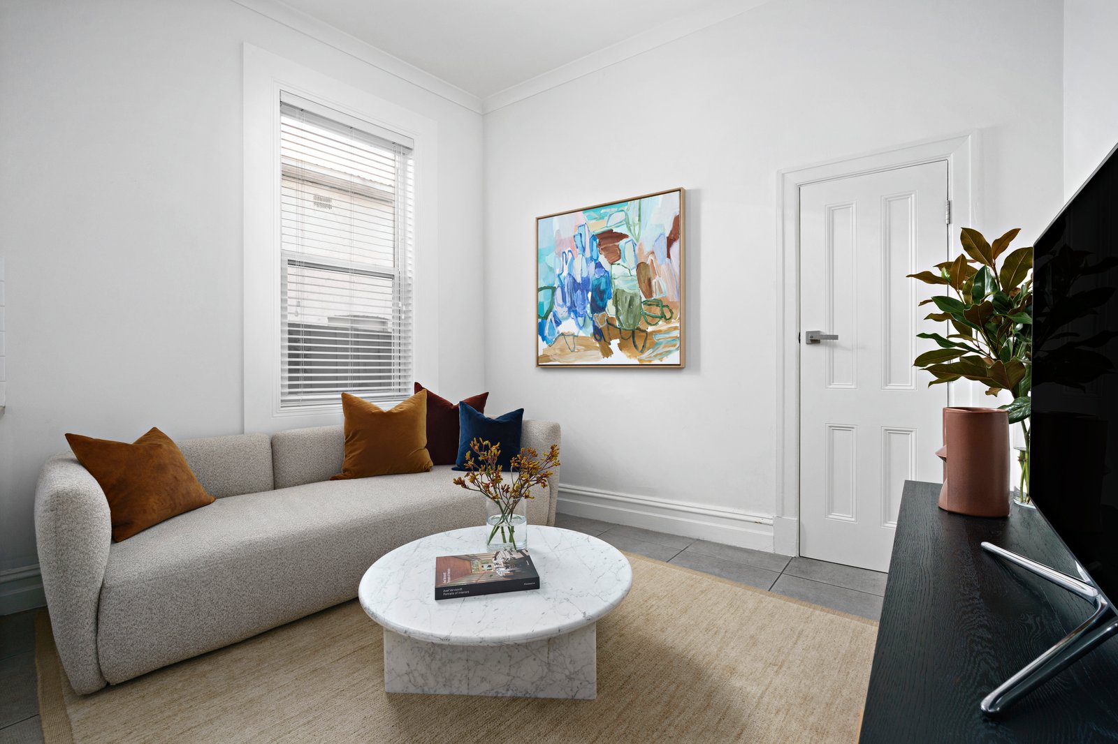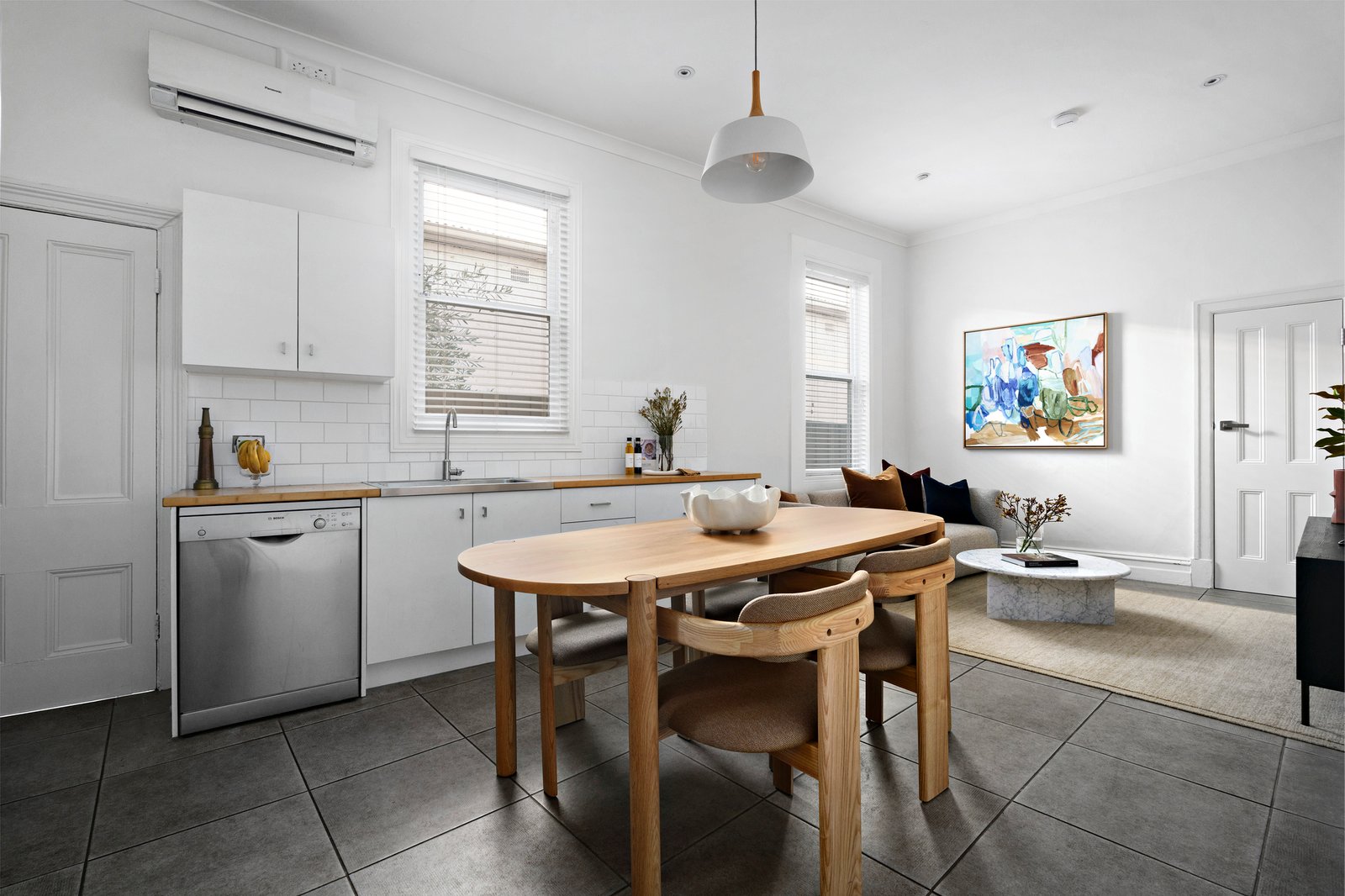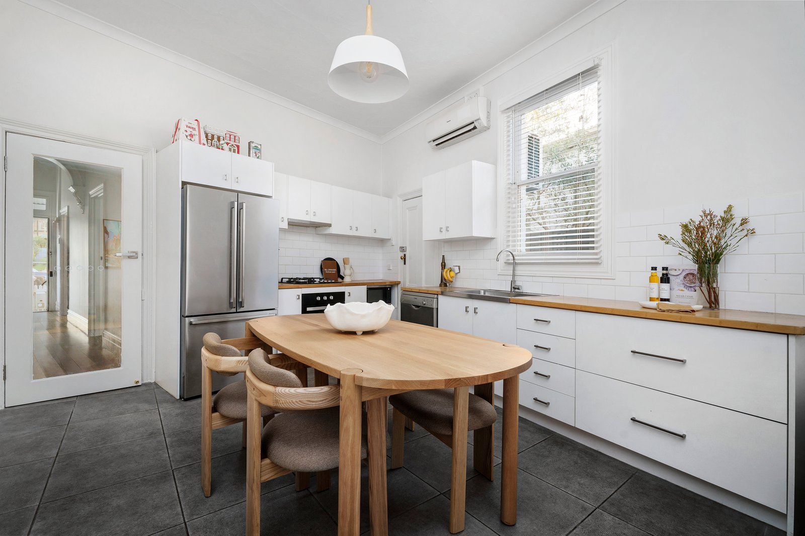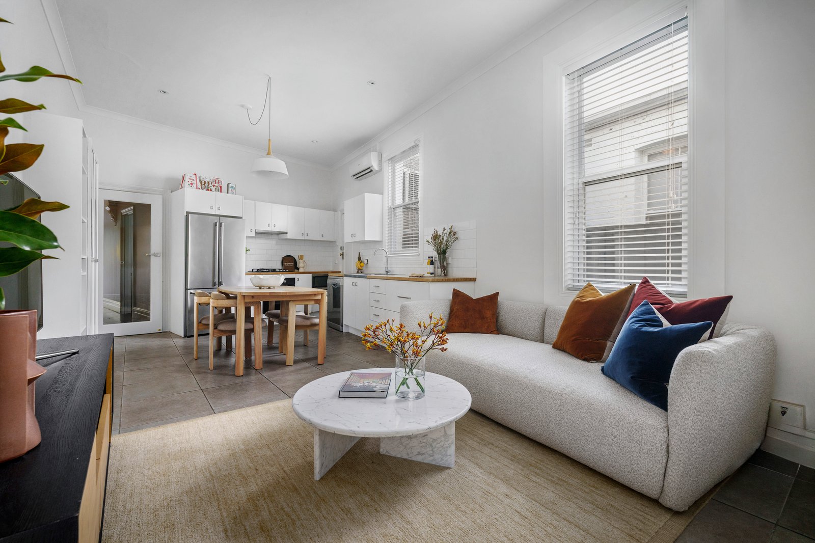Behind the attractive façade and garden, an arched hallway featuring timber floors and high ceilings flows through to an inviting north-facing living and dining room with superbly equipped modern kitchen. A private decked northeast facing garden invites idyllic outdoor dining and relaxing with pedestrian access to Rose Street. The main bedroom with bay window, open fire and built in robes is accompanied by a second double bedroom with robes and a stylish bathroom with heated floors.