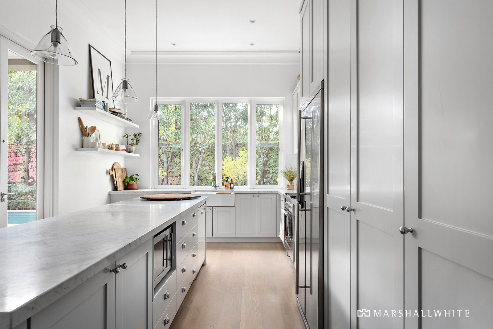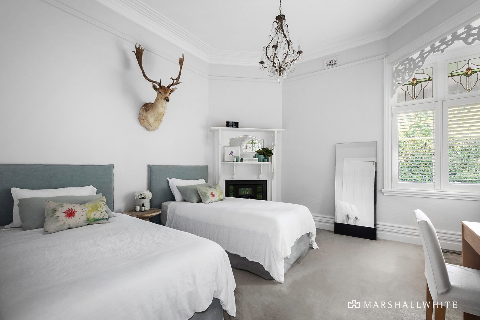 Secluded from the street behind a high hedged garden with tranquil water feature and broad return verandah, the glorious interior dimensions showcase high ceilings, exquisite leadlight windows, Baltic pine floors, fireplaces and intricate fretwork. A wide central hall flows through to a gracious sitting room of immense proportions, a captivating main bedroom with robes, a second double bedroom, two additional robed bedrooms and a stylish bathroom with laundry facilities. The high ceilings are continued through the expansive living and dining room featuring oak floors, an open fire and French doors to a large undercover al fresco dining terrace overlooking the picturesque private north-facing garden and solar heated pool. The stunning entertainer's kitchen is appointed with swathes of Carrara marble, a 90cm Ilve oven and fitted study nook.