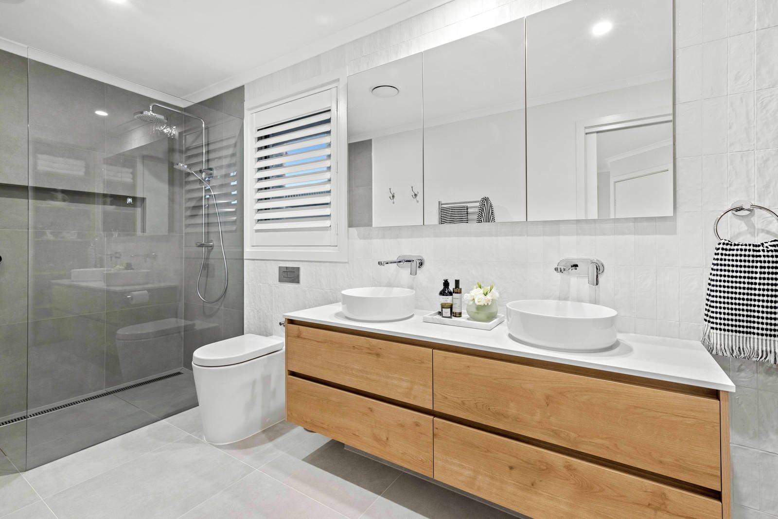 Zoned for privacy the master with built-in robes lies beyond the plush formal lounge (or parents retreat) and is served by a large, luxe ensuite in stylish neutral hues, featuring a double shower, heated towel rail and twin vanity with recessed mirrored cabinets.