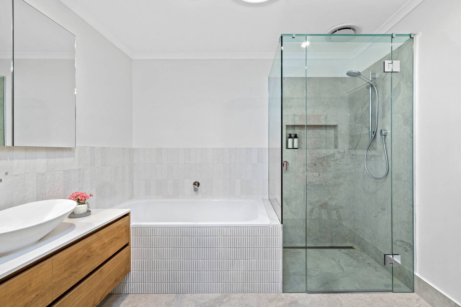 At the opposite end of the home there are three extra-generous bedrooms, all with built-in robes, serviced by an equally impeccable family bathroom with deep tub, vessel basin, large shower and separate powder room.