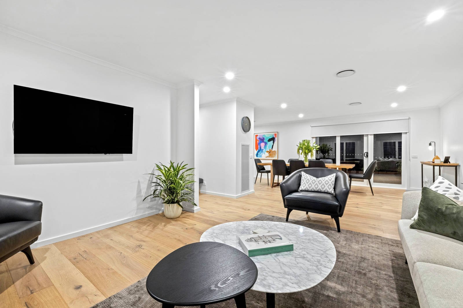 The light-filled, open plan design offers two distinct living areas, 4 double bedrooms and 2 bathrooms with a host of quality appointments including classic solid oak flooring, custom cabinetry, stone benchtops, plantation shutters, bar fridge, with central heating & cooling throughout.