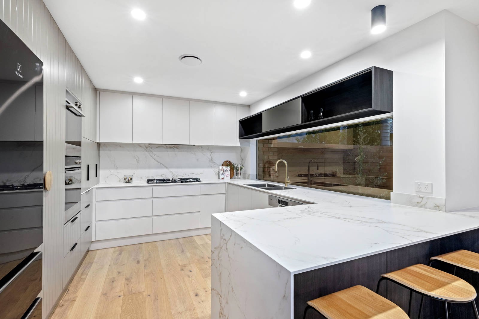 The gourmet kitchen is a real highlight, with sleek Dekton benchtops, a full suite of Fisher & Paykel appliances including 2 pyrolytic ovens, appliance cupboard, pull-out pantry and Bosch integrated dishwasher. A splashback window frames the peaceful gardens beyond with a stunning mature Canary Island date palm as a focal point, while a fully fitted bar and newly laid aggregate concrete entertainment area set the scene for relaxed backyard BBQs or family gatherings.