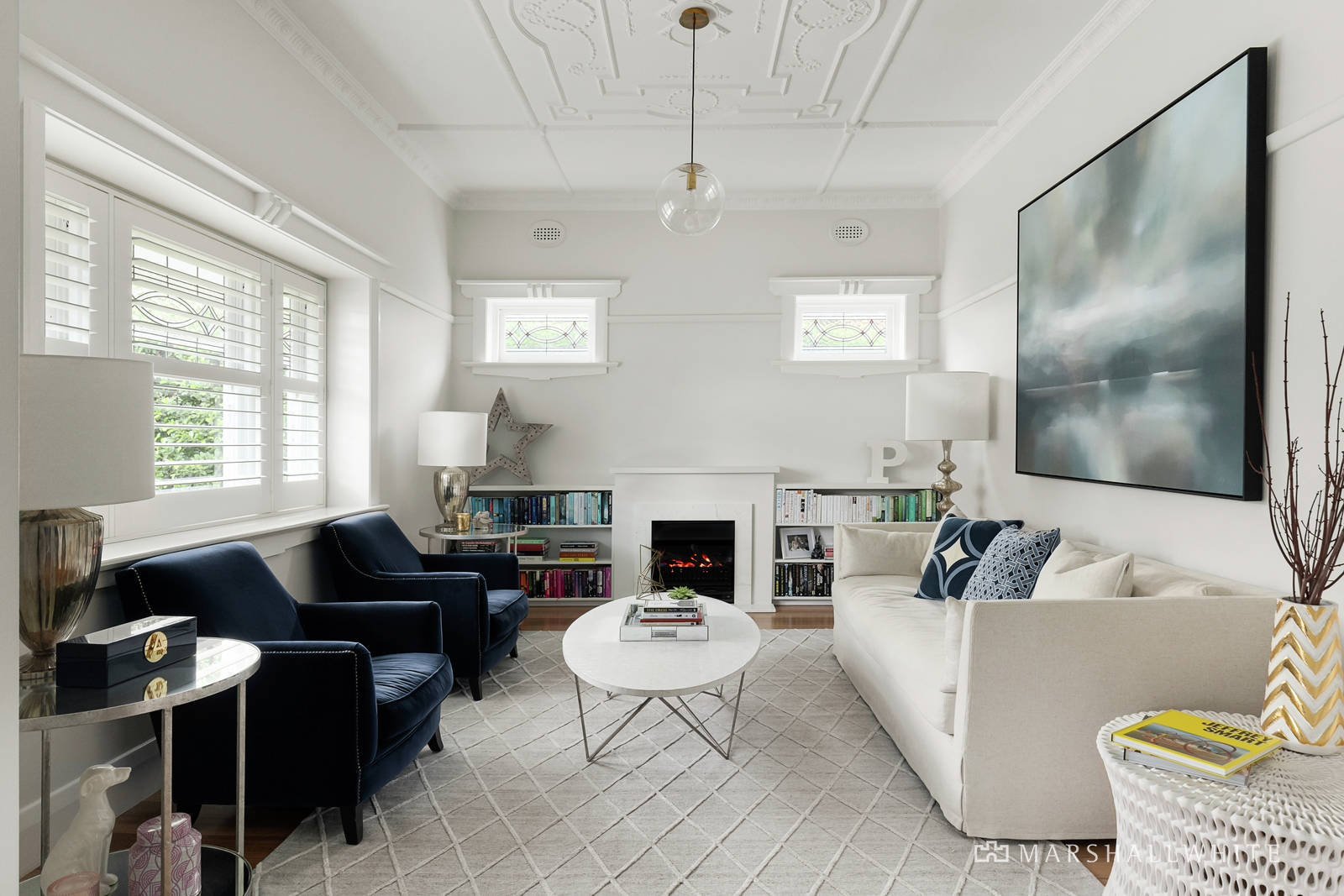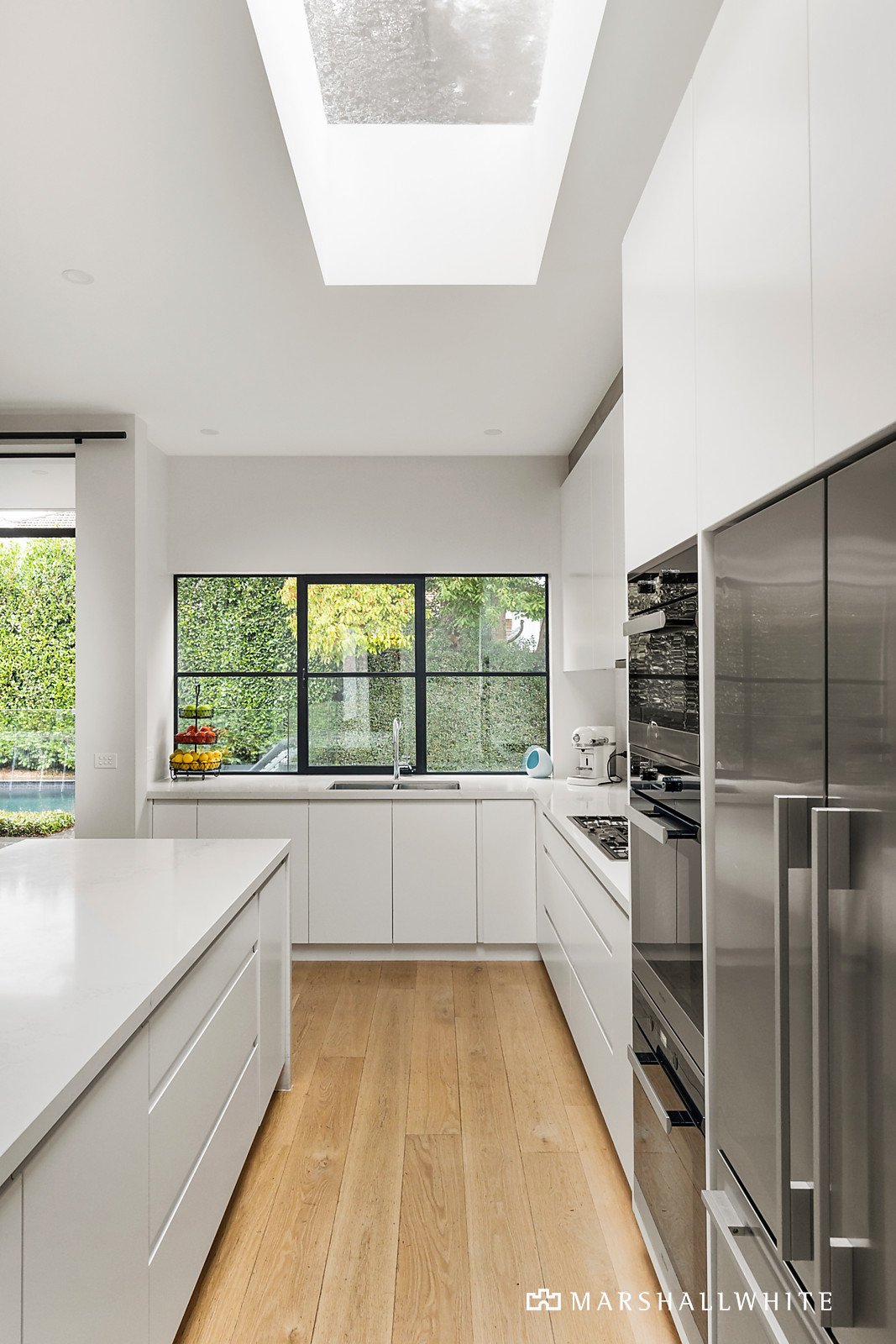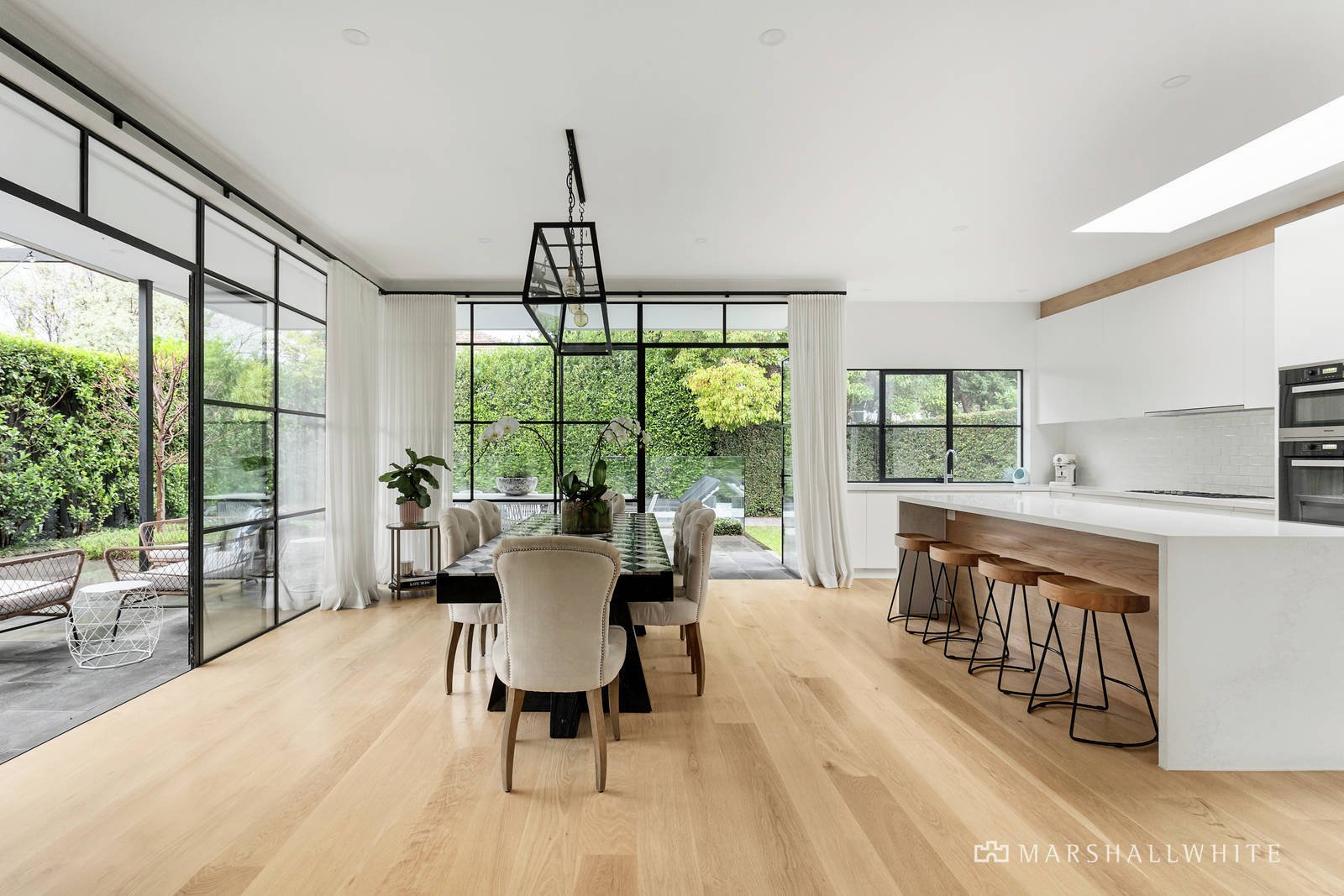 Beautiful ornate ceilings and leadlight windows have been retained in a gorgeous sitting room with gas fireplace and the two stunning downstairs main bedrooms both featuring designer en-suites and walk in robes. Spectacular in scale, the north-facing living and dining areas featuring wide American oak floors and distinctive floor to ceiling double glazed industrial style metal windows.