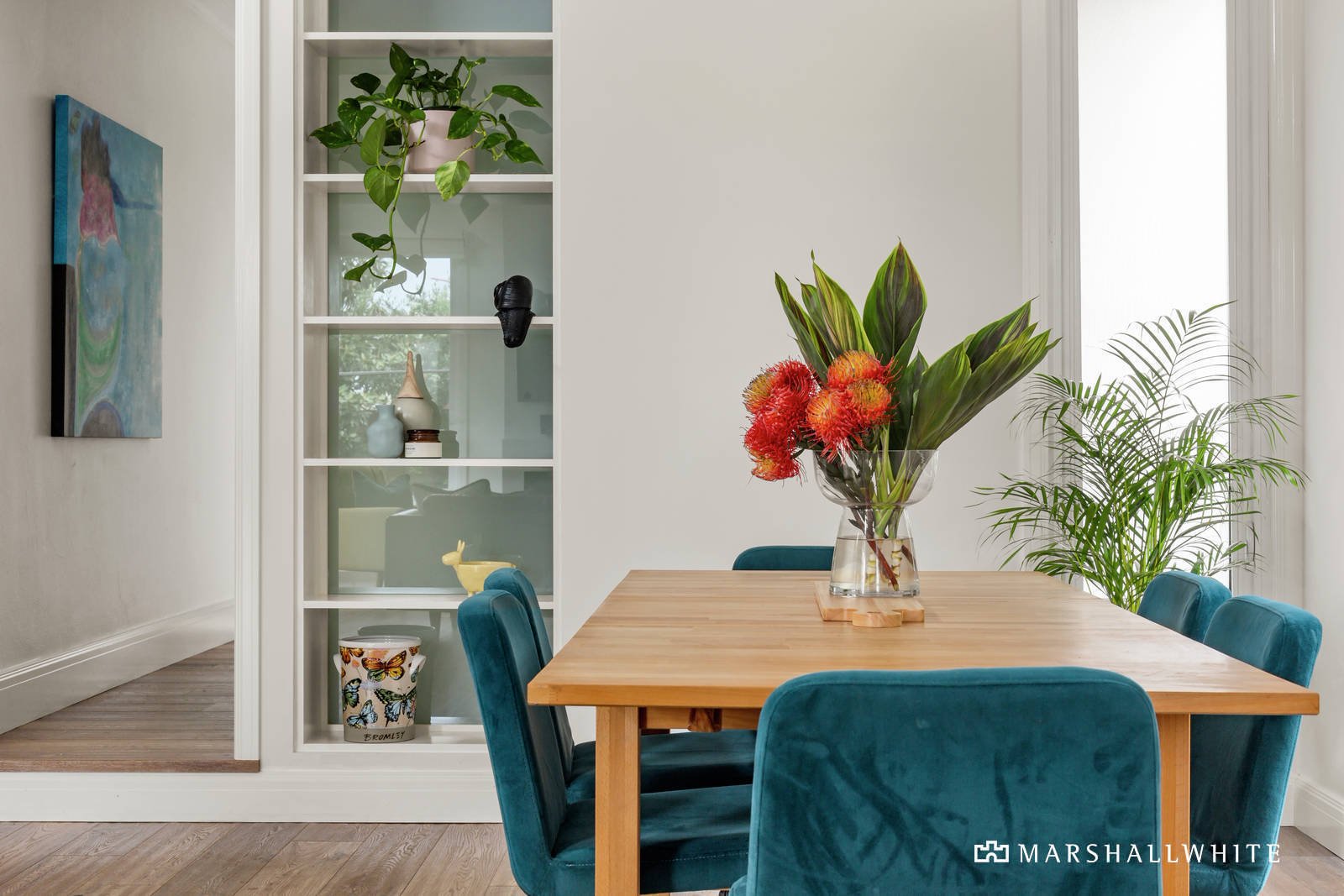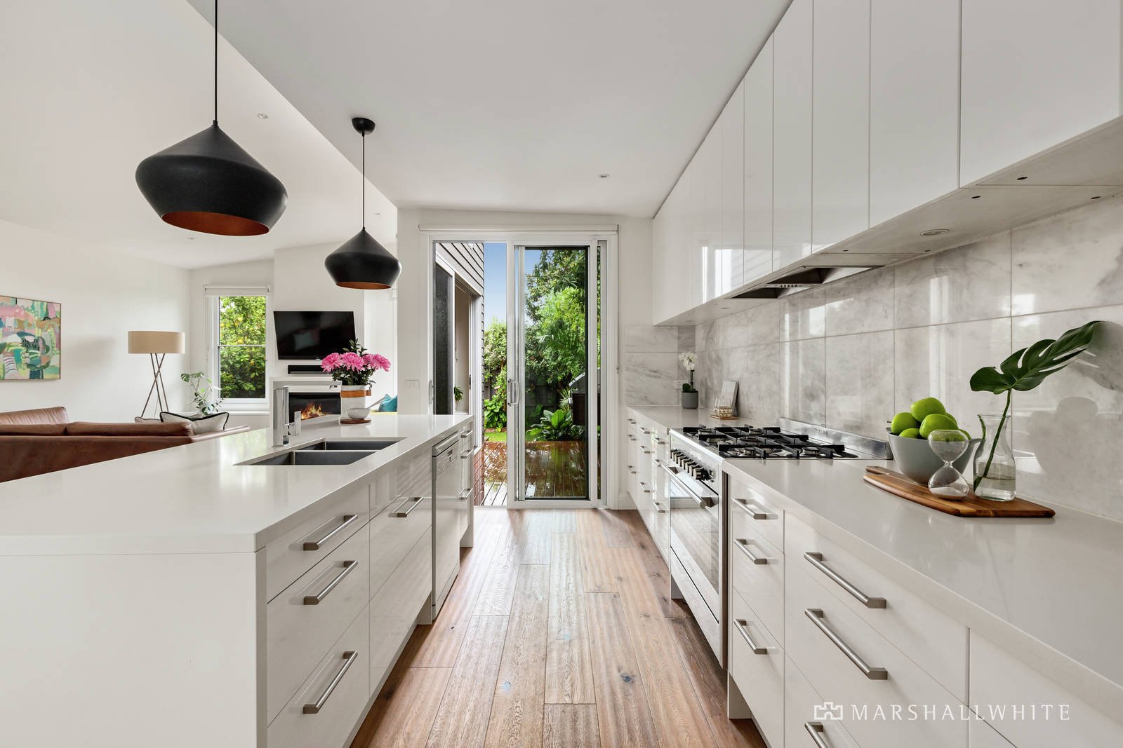 Looking out to the rose-lined front garden, the original front rooms, rich in period details such as highly decorative ceilings and ornate fireplaces, have been refreshed with glossy white shutters, ceiling fans, luxe lighting and a calming Hampton's-style colour palette. The sublime master bedroom has a new ensuite and access to a unique private courtyard with outdoor bath. From the long, central hallway, is the family bathroom, separate powder room and fully-fitted laundry - all completely updated with high-end tiling, tapware and fittings. Linked by newly-laid oak flooring, the light-filled contemporary living space opens out in soaring angles, gleaming stone, and swathes of double-glazed windows.